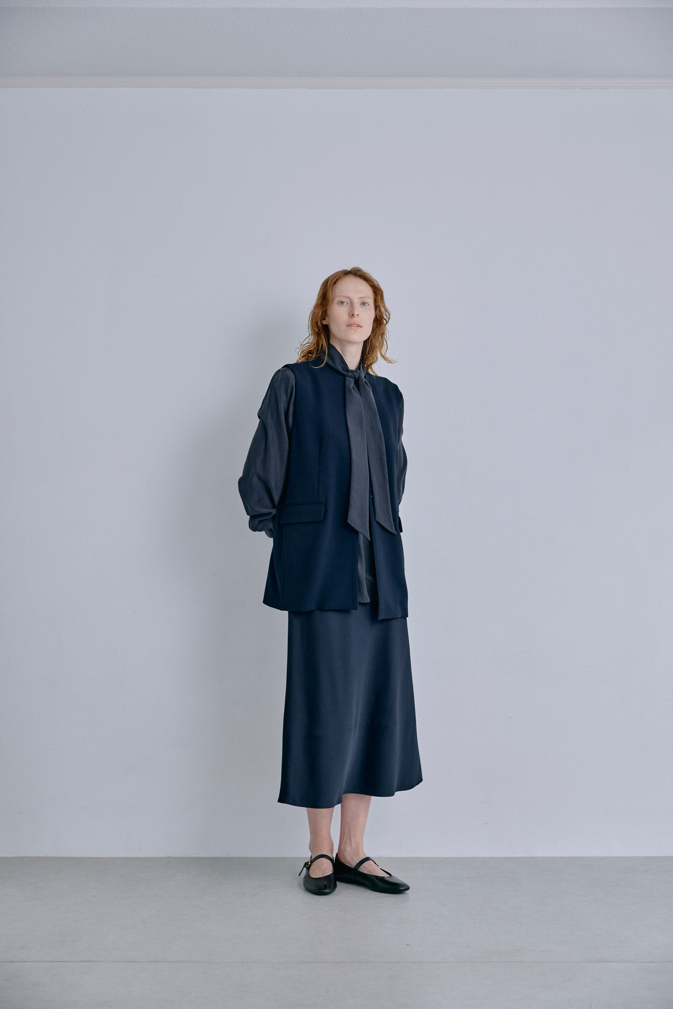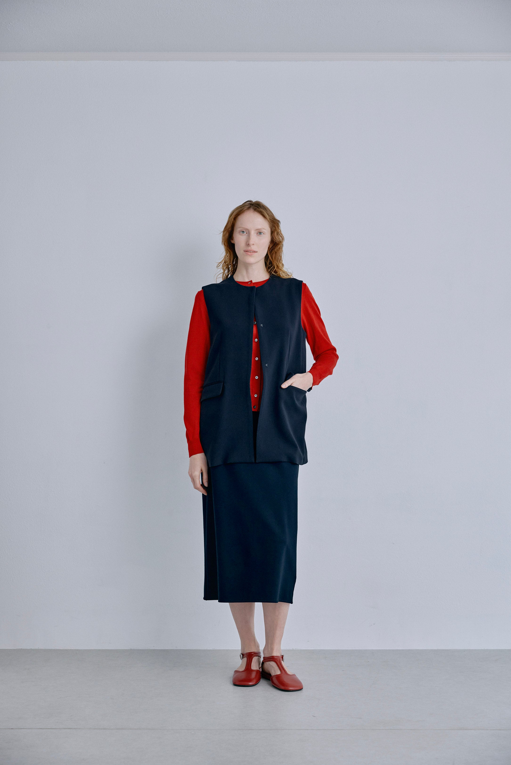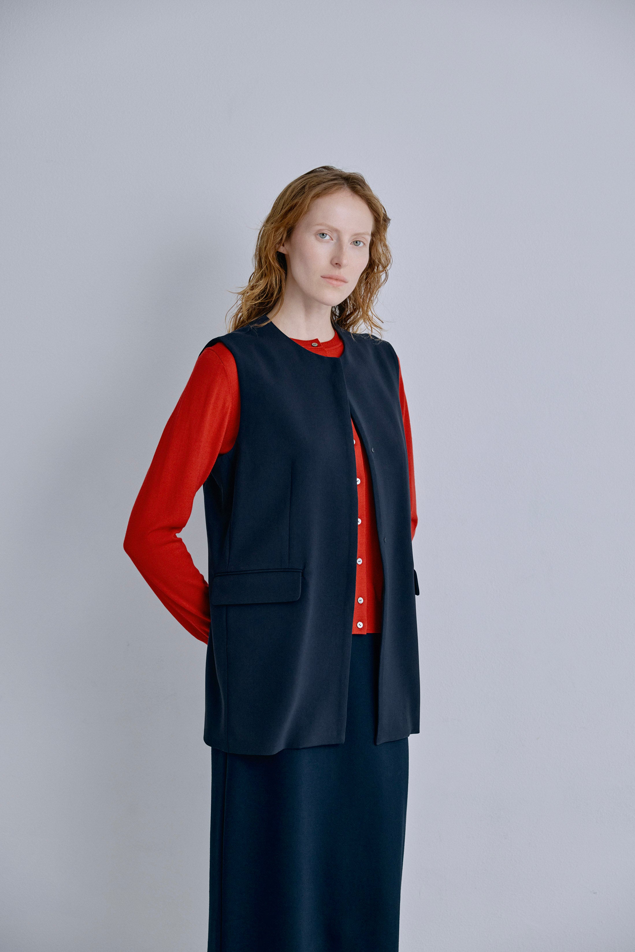 直線的なシルエットとミニマルなクルーネックが特徴のジレ。どのようなアイテムともレイヤードしやすい設計で、装いに心地よい奥行きを生み出します。