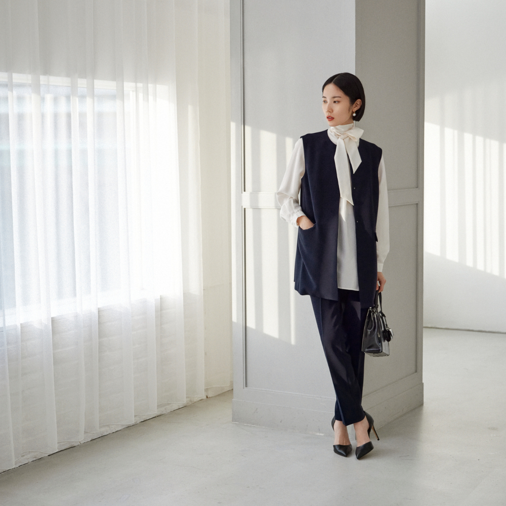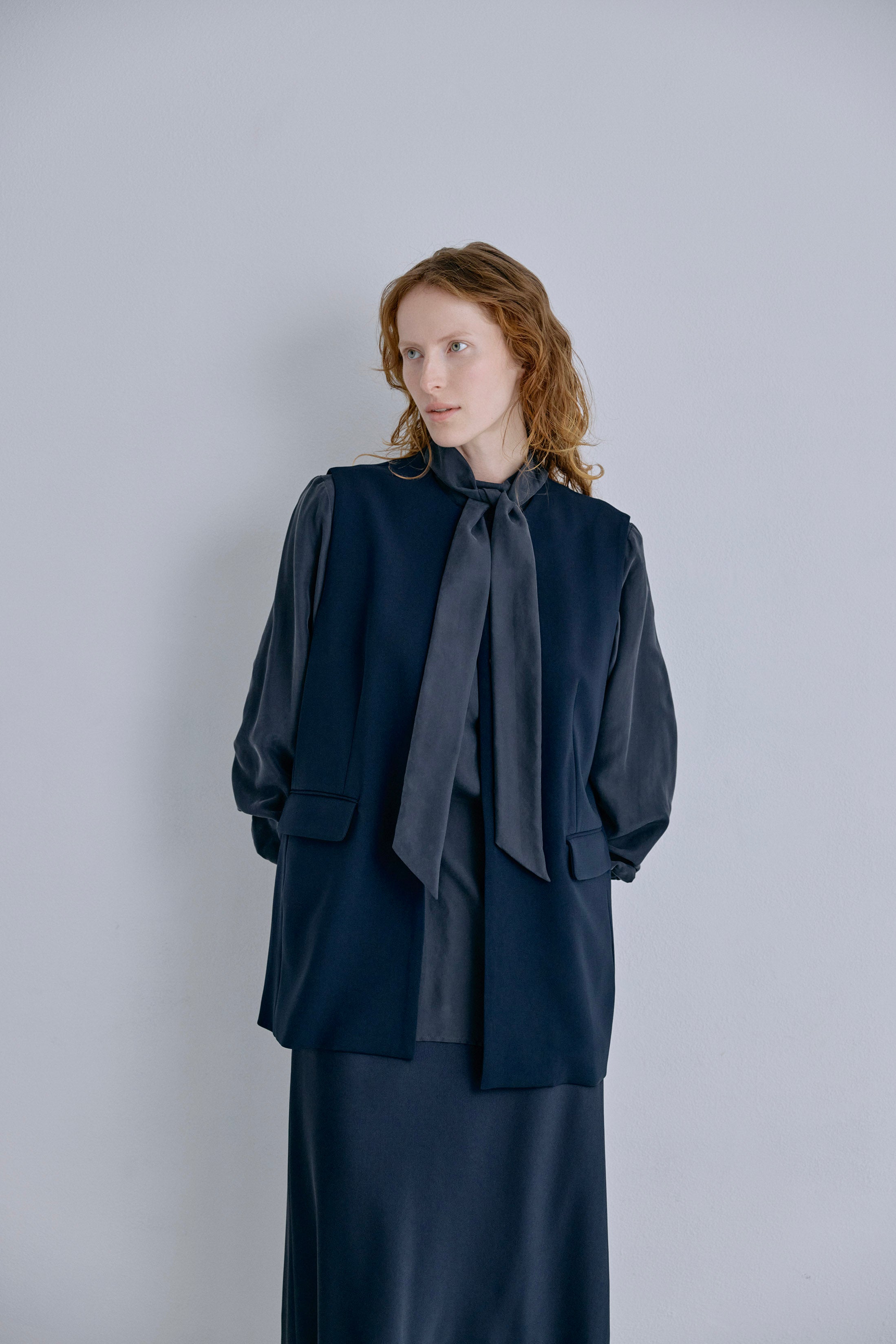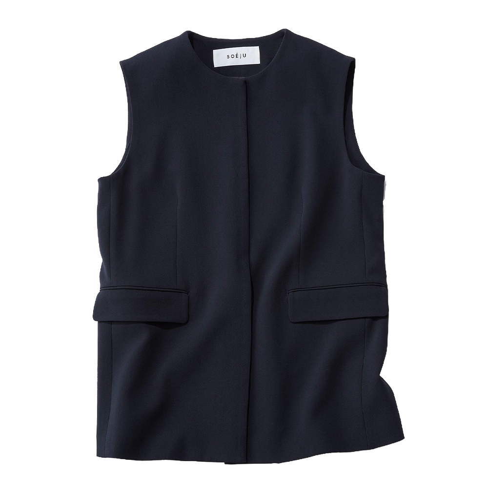 直線的なシルエットとミニマルなクルーネックが特徴のジレ。どのようなアイテムともレイヤードしやすい設計で、装いに心地よい奥行きを生み出します。