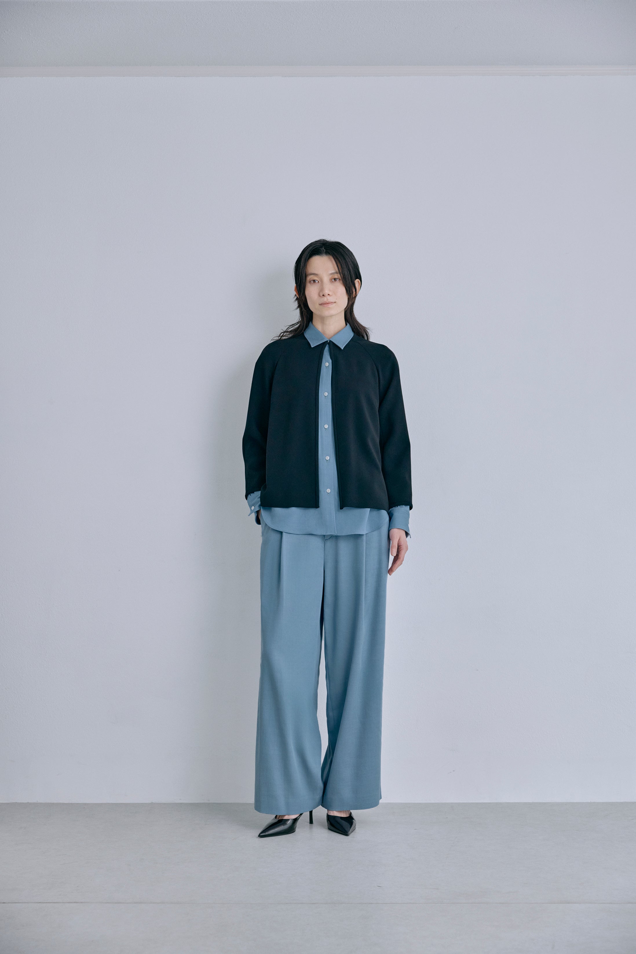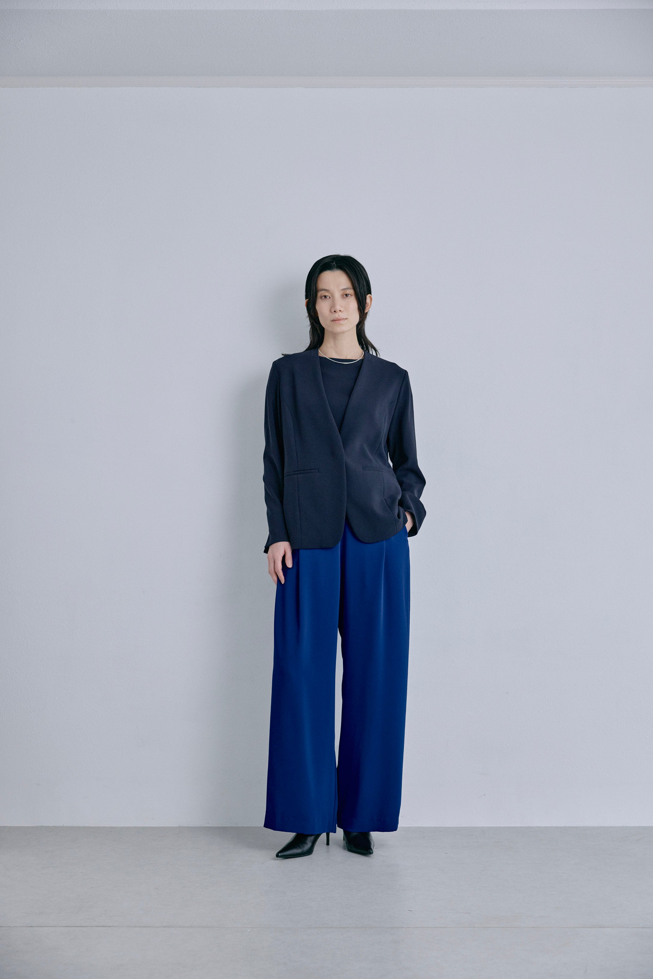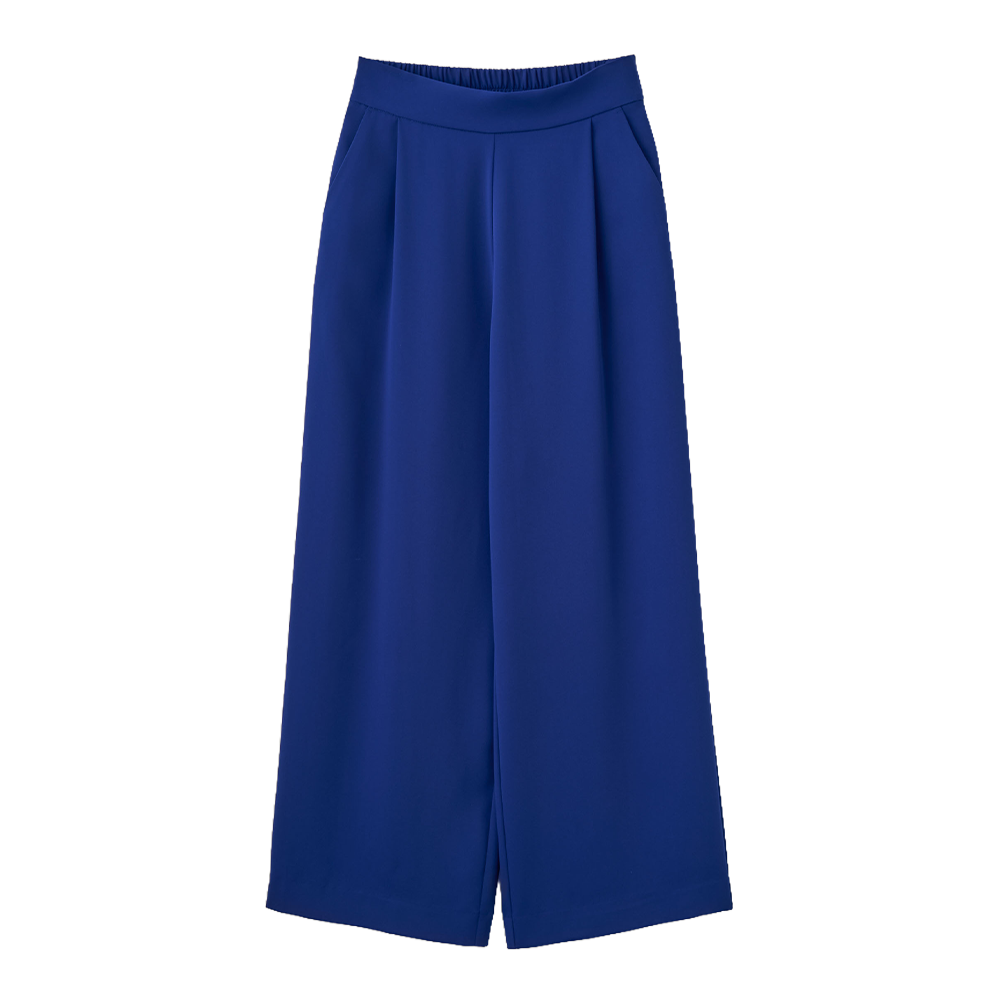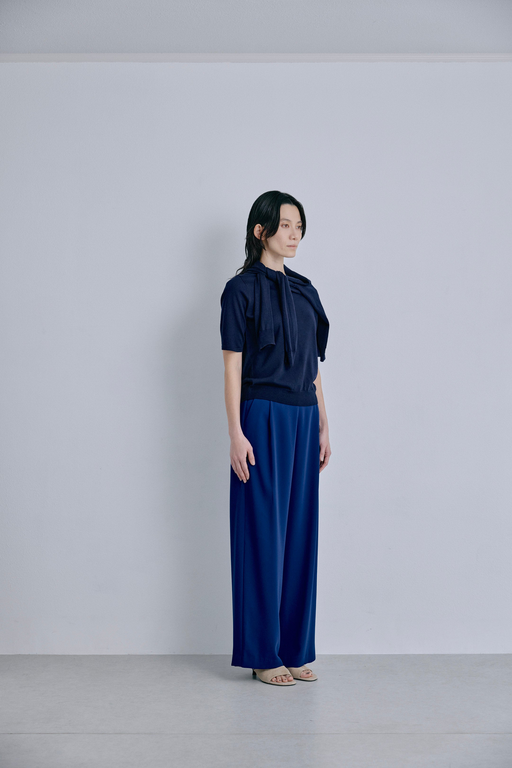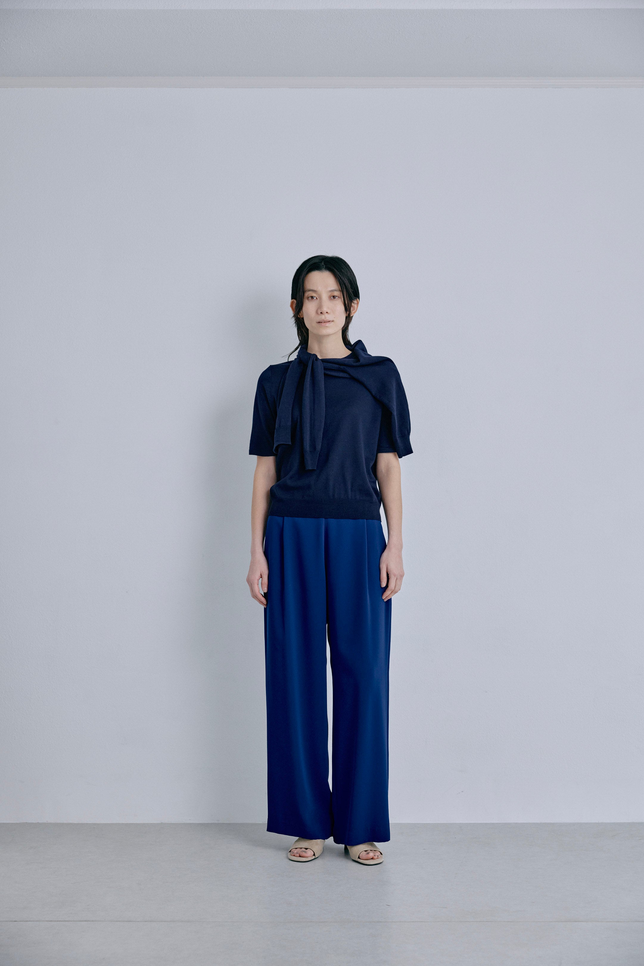 サイドに入れたタックが縦のラインを強調し、ワイドシルエットながらすっきりとした印象を叶える一本。とろみのある生地が生み出す豊かなドレープと落ち着きのあるブルーが、装いに静かな華やかさを添えます。