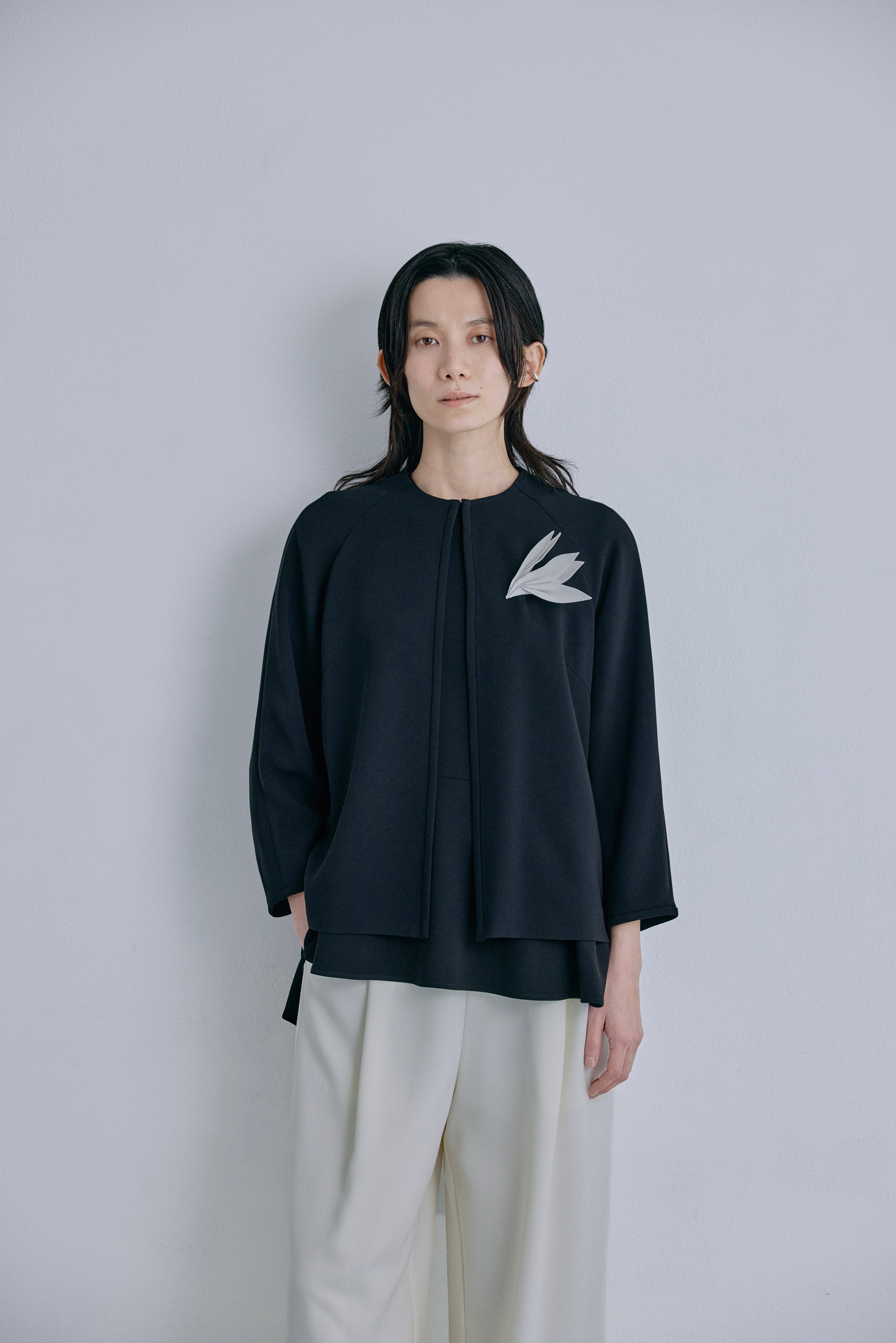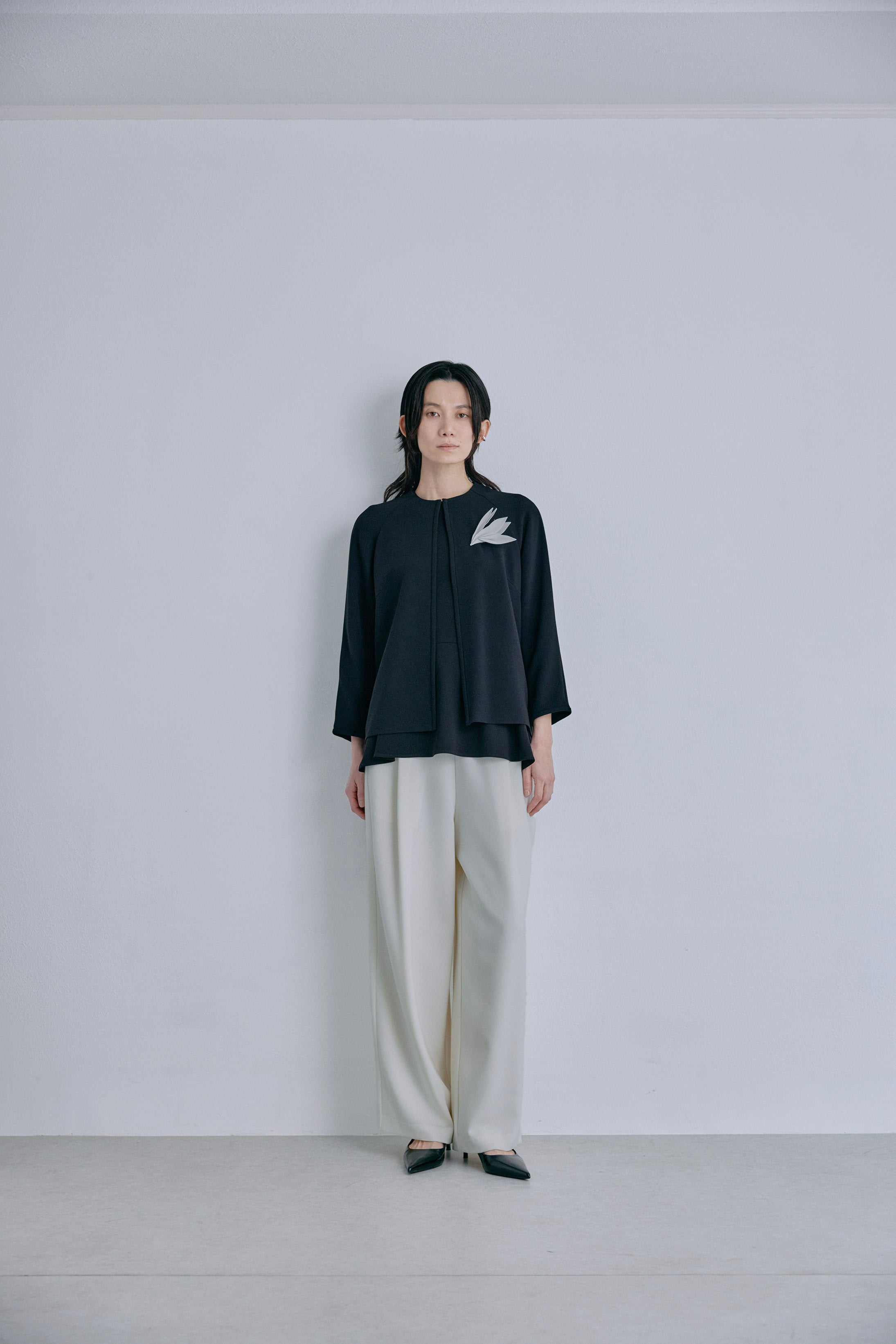 インナーにペプラムブラウス、ボトムスにドレープの綺麗なワイドパンツ、胸元に立体感あるコサージュを合わせて、シルエットで華やかさをまとうスタイリング