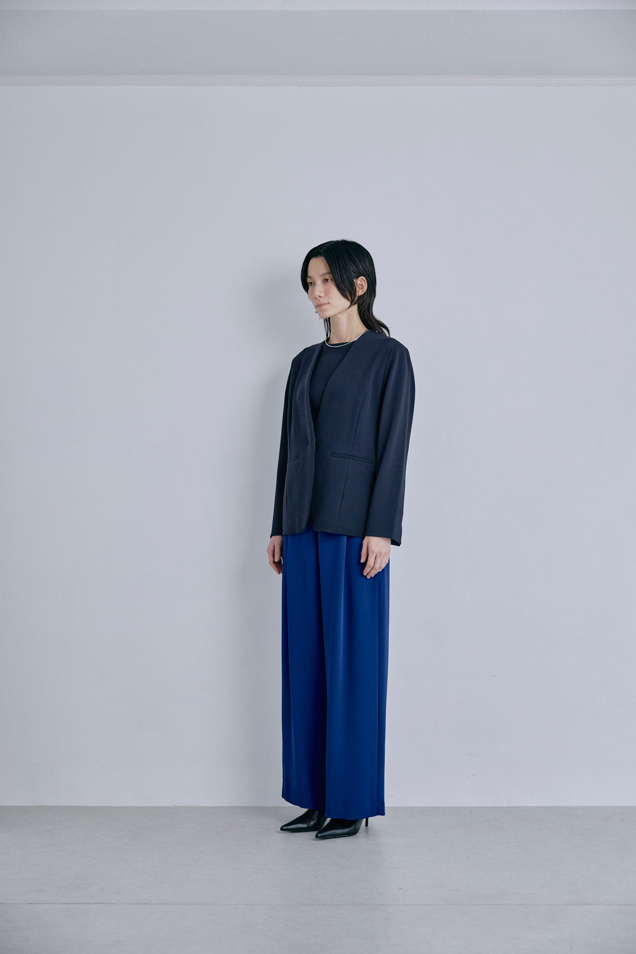 ブルーを上品にまとめてくれる深いネイビーのインナー&ジャケットを合わせて凛とした佇まいに。