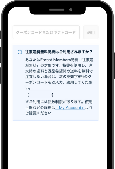 特典はアカウント登録いただくと、すぐにご利用可能。チェックアウトページに表示されるコードを入力いただくと、ご購入・返品時に発生する送料が無料になります。
