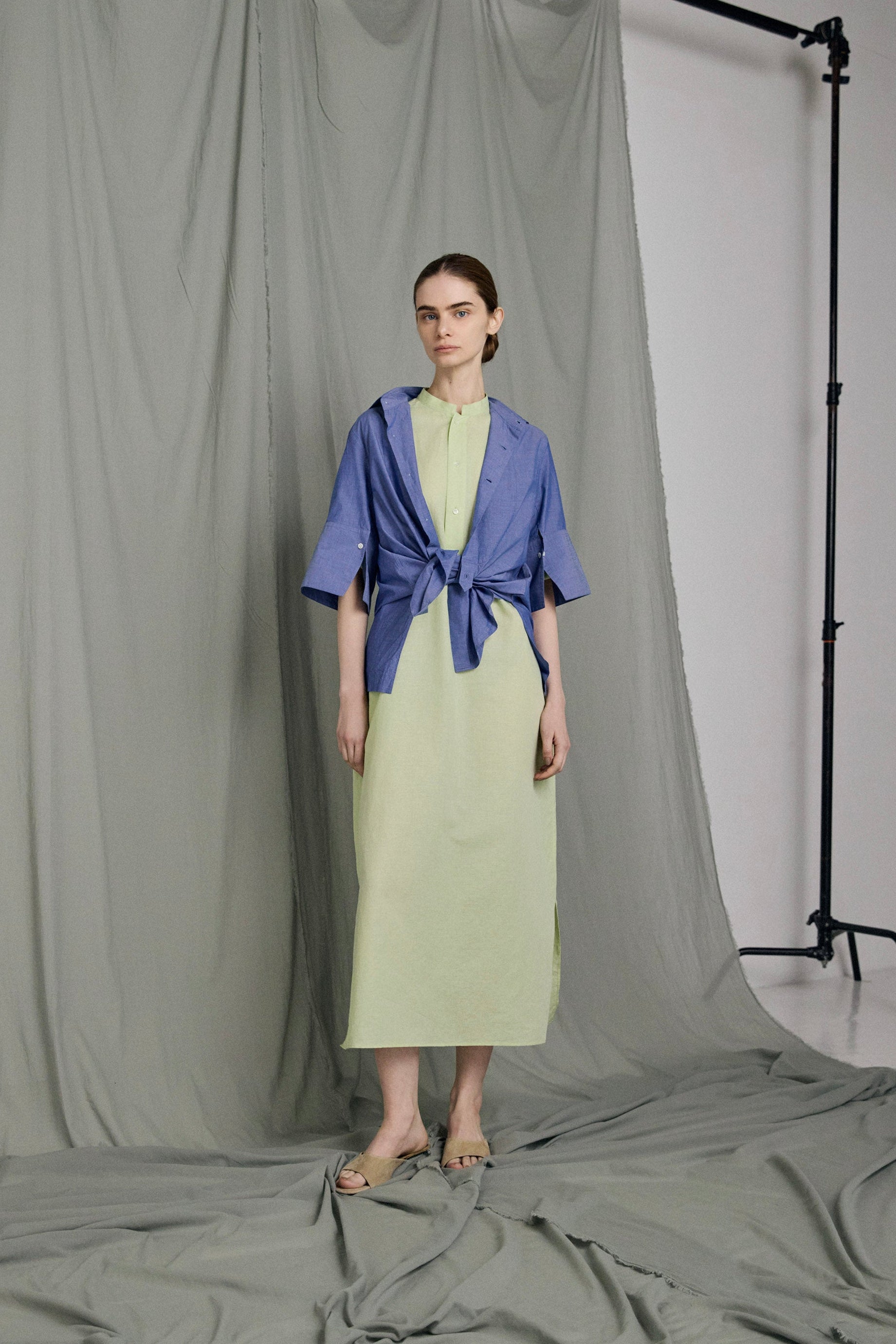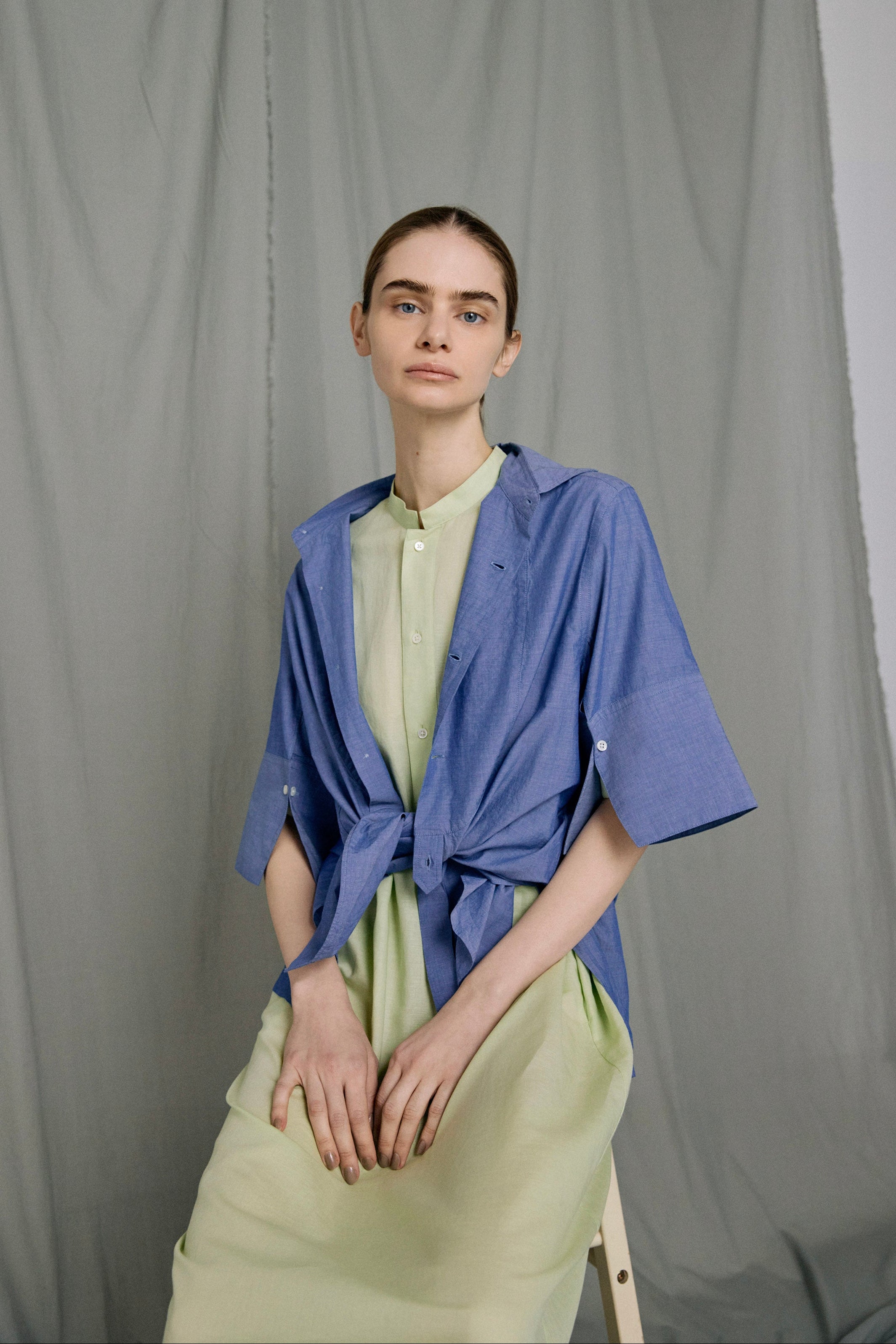 やわらかなミントカラーのワンピースに、清涼感のあるブルーのシャツを重ねた、自然体で洗練されたスタイリング。