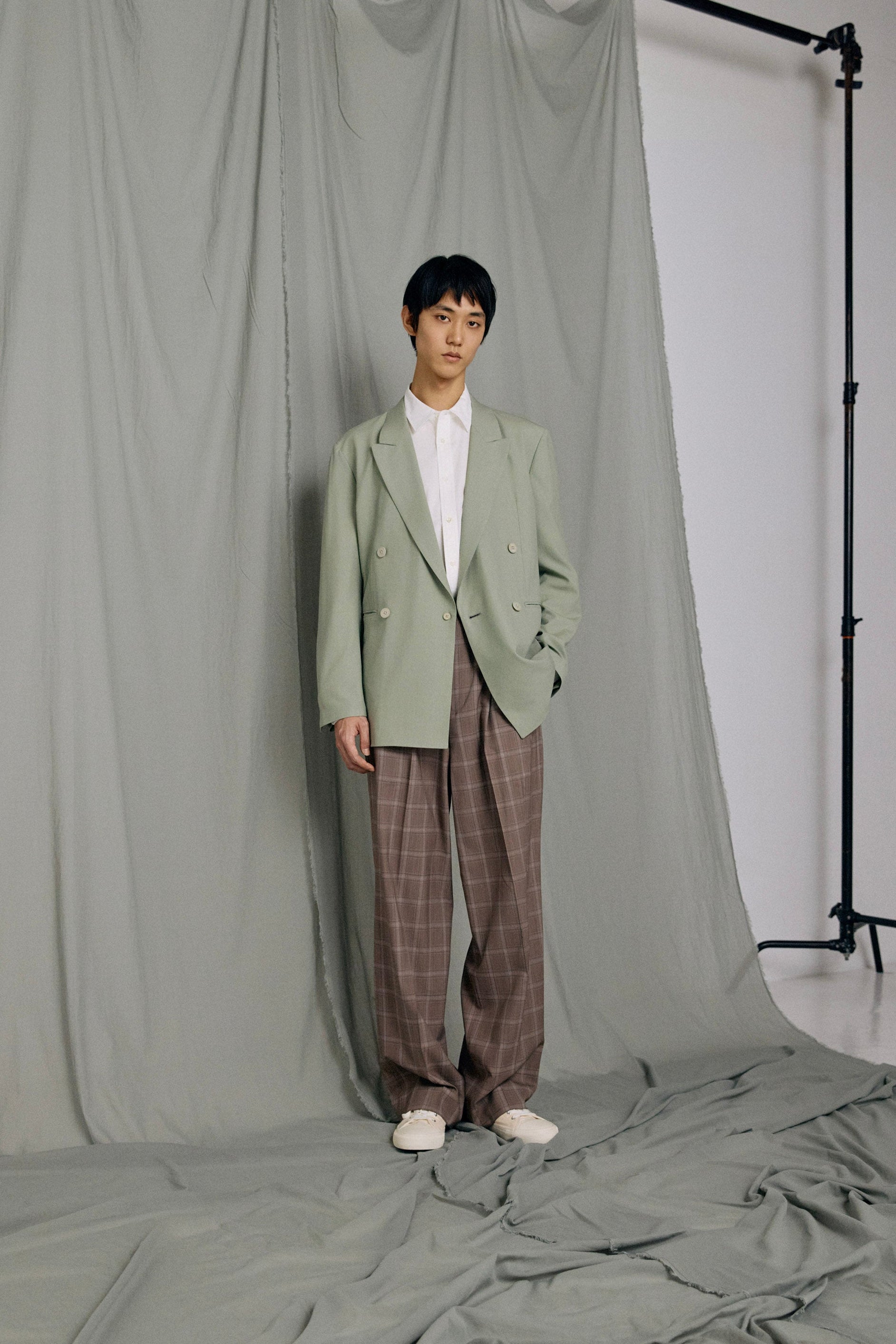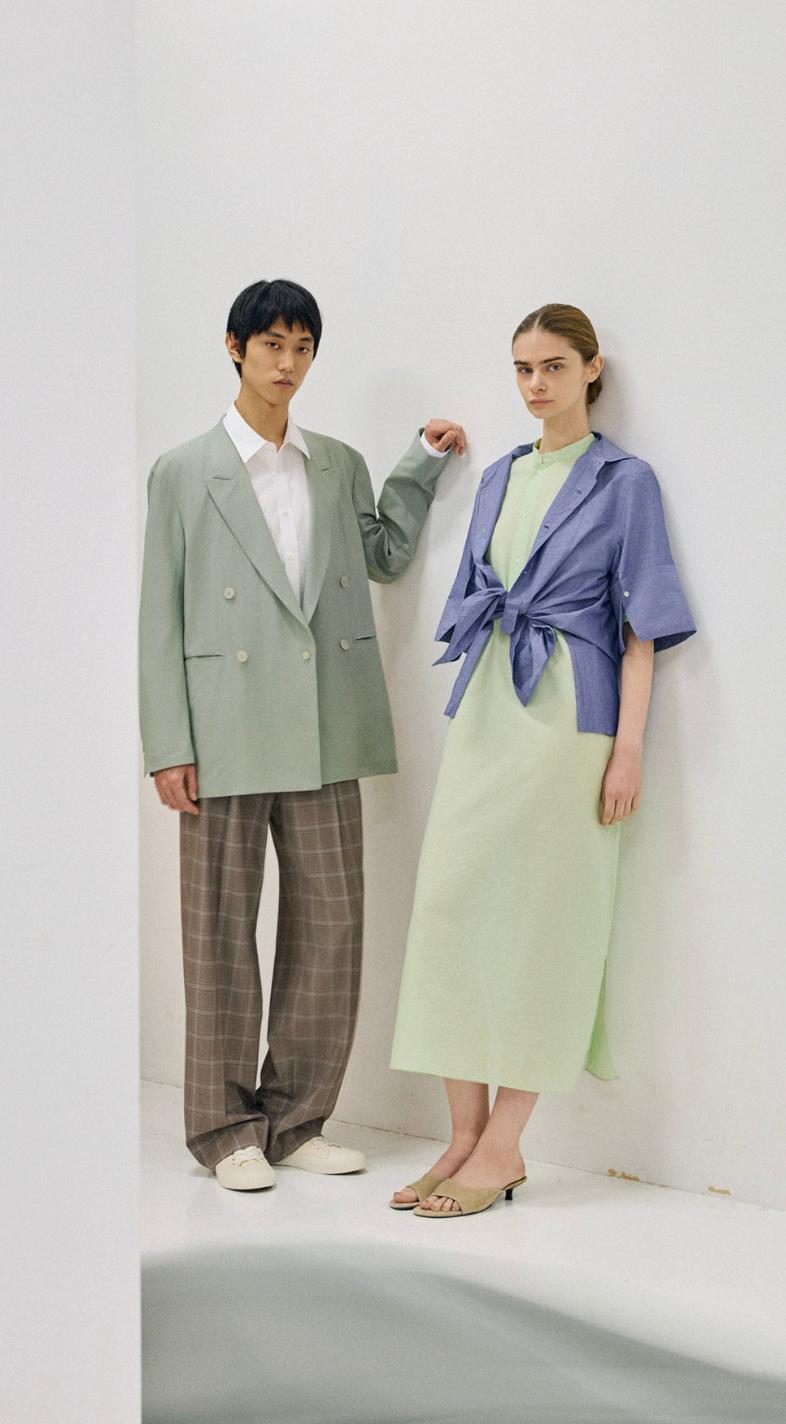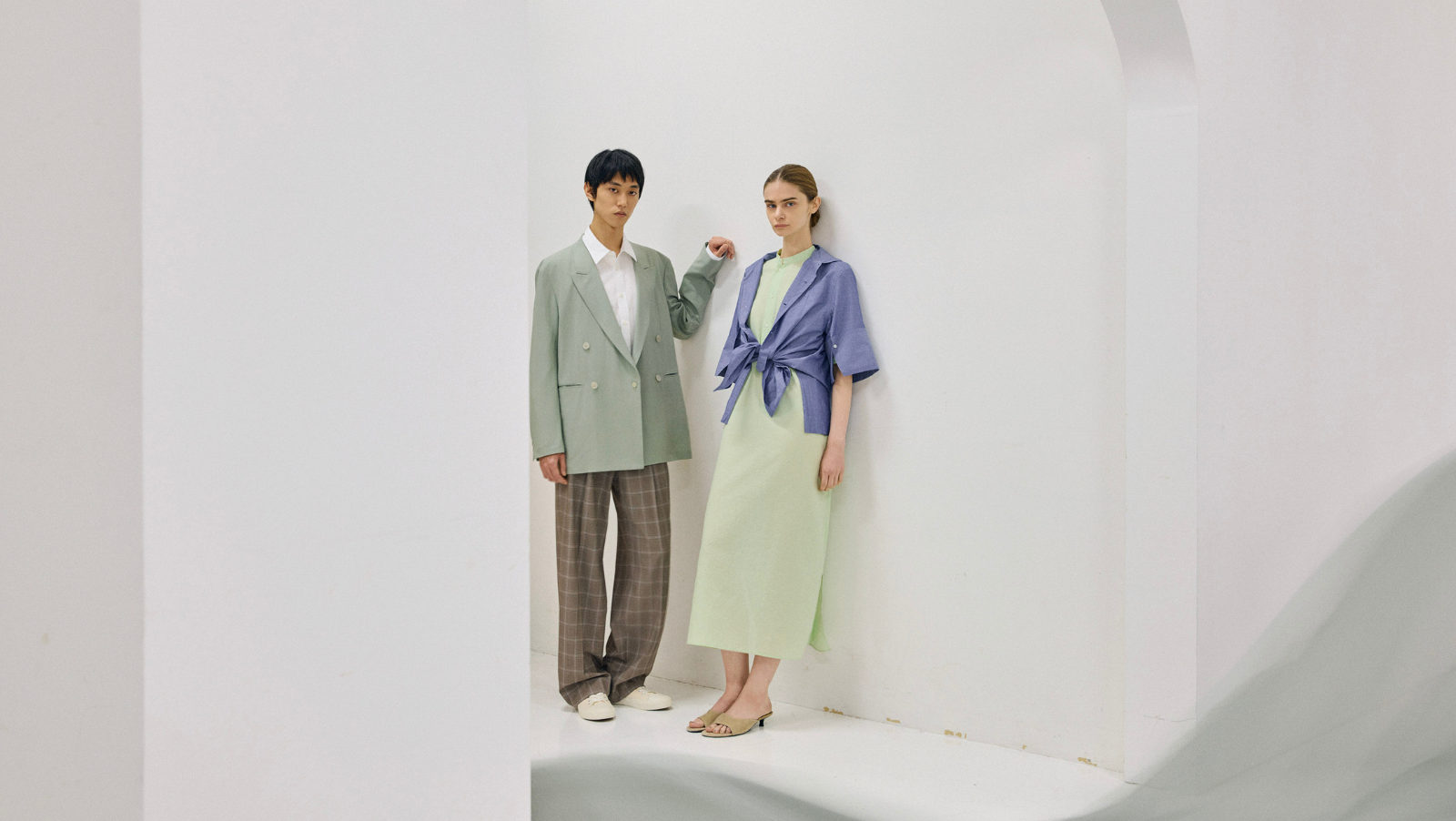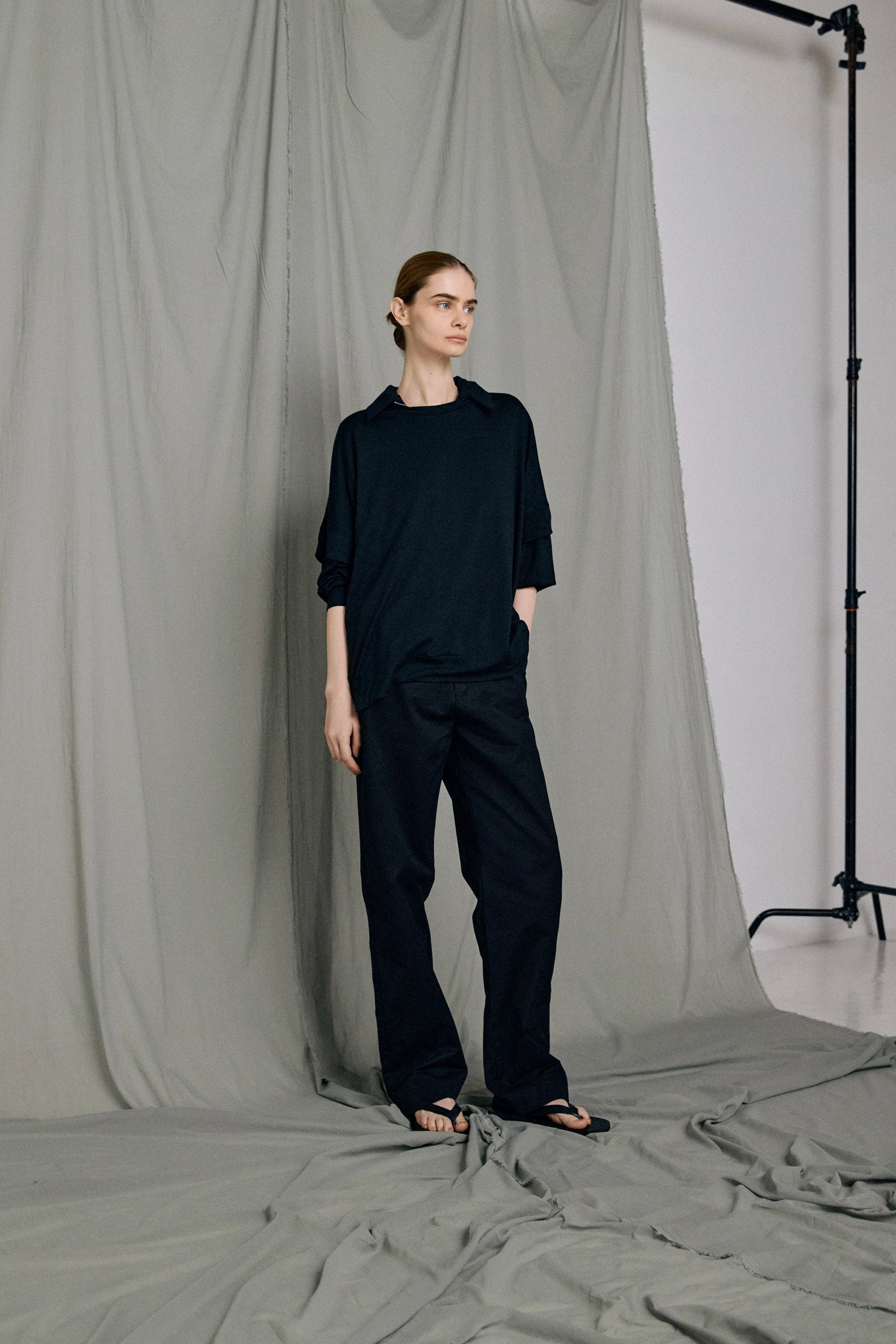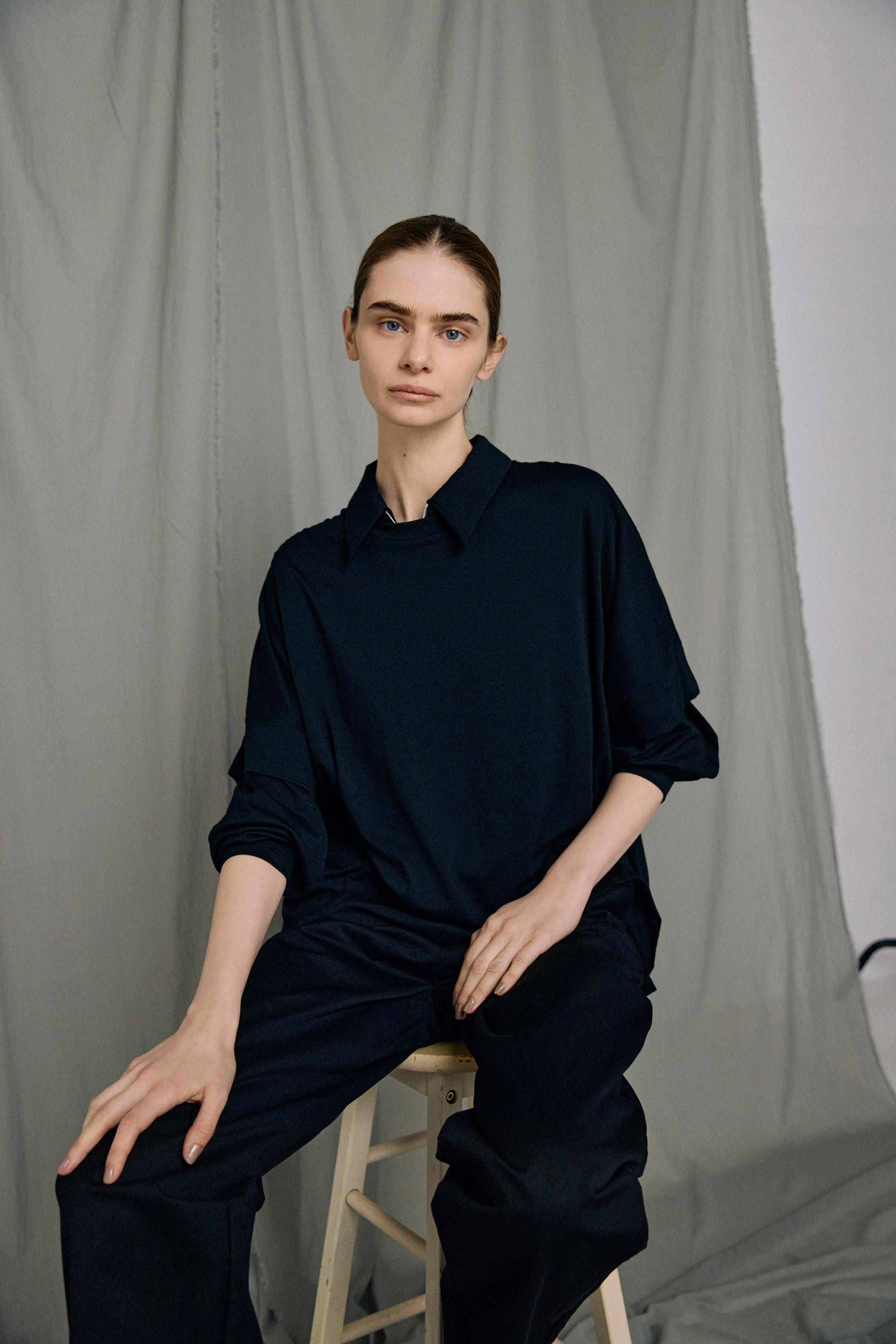重ねた2型のトップスは、ともにSuper140の極細ウールを使用したクリアウール素材。なめらかな表面感と軽やかな着心地に加え、吸放湿性や防臭性も備え、暑い季節にも快適に着用いただけます。