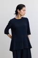 ウエストに向かってゆるやかに細くなるコクーン型のシルエットが特徴的な8分袖のブラウス。ドロップショルダーを採用し、腕の付け根をはっきりとさせないことで、気になる肩の丸みや肩幅も上手にカバーします。ウエストと手首を細く見せてくれる視覚効果があるデザインにすることで、ぴったりとしないからこそすっきり見えるマジックが。