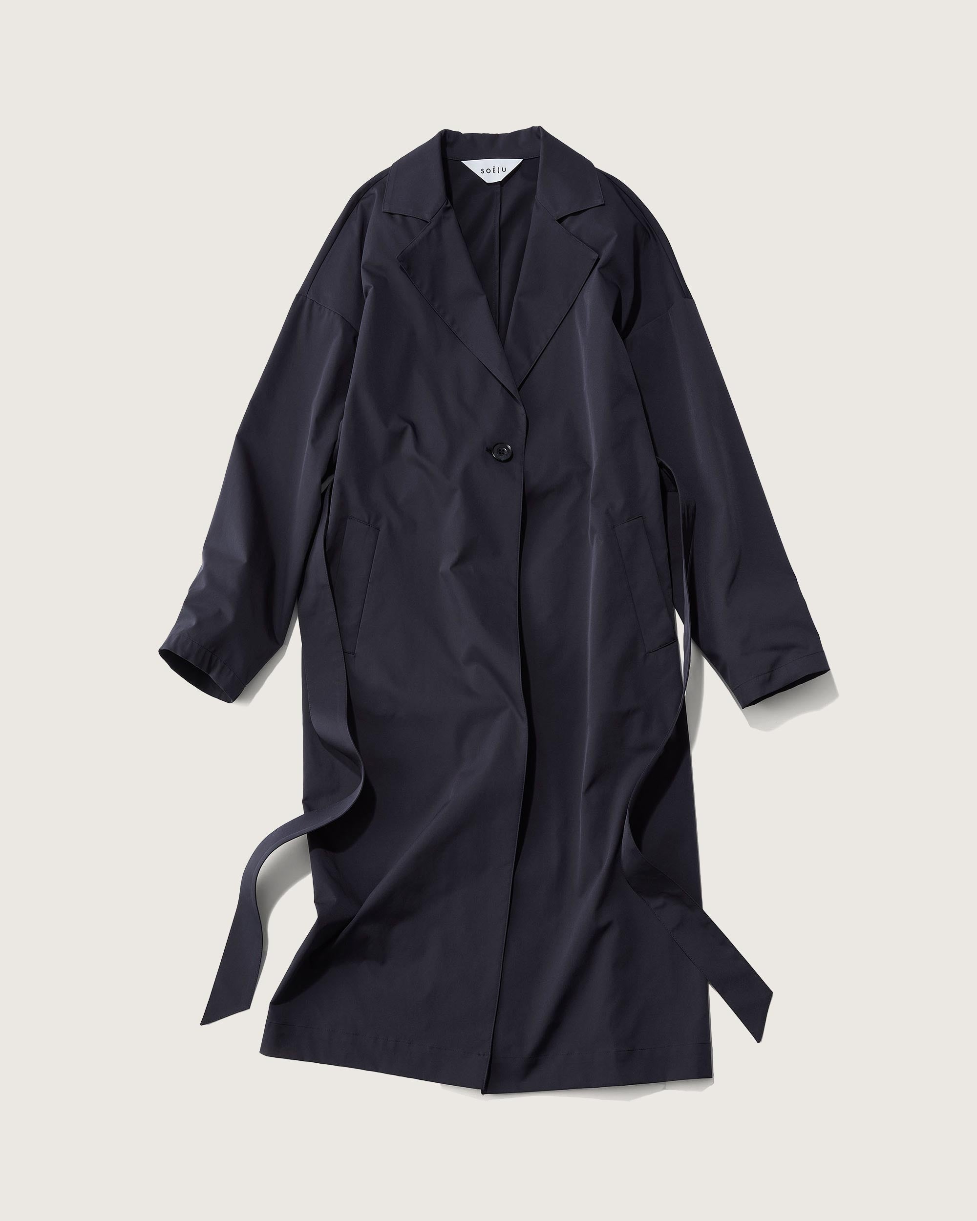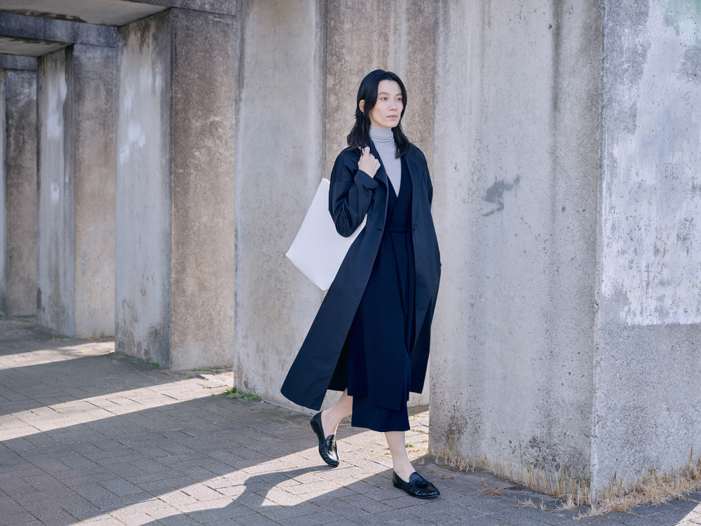 持ち運びに便利なパッカブルコートをさらりと羽織ると、更にクリーンな表情に。