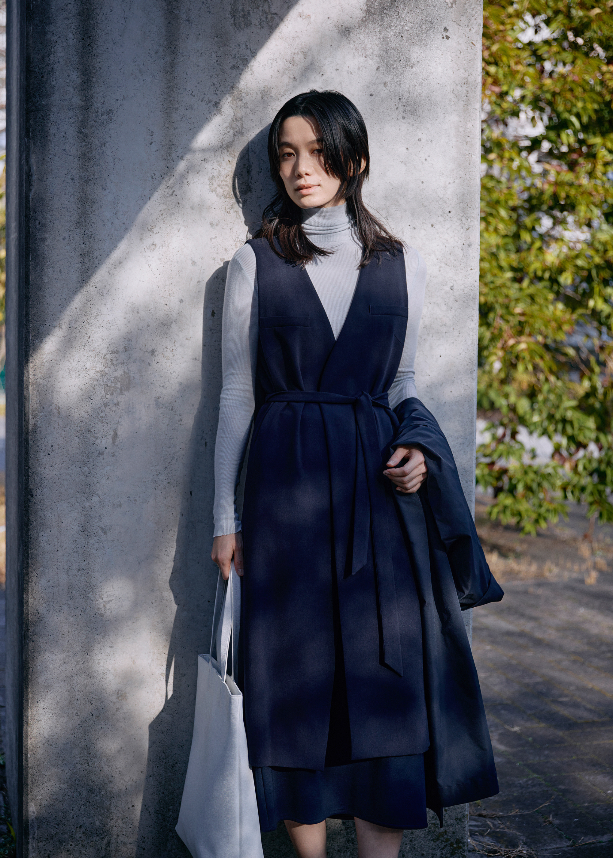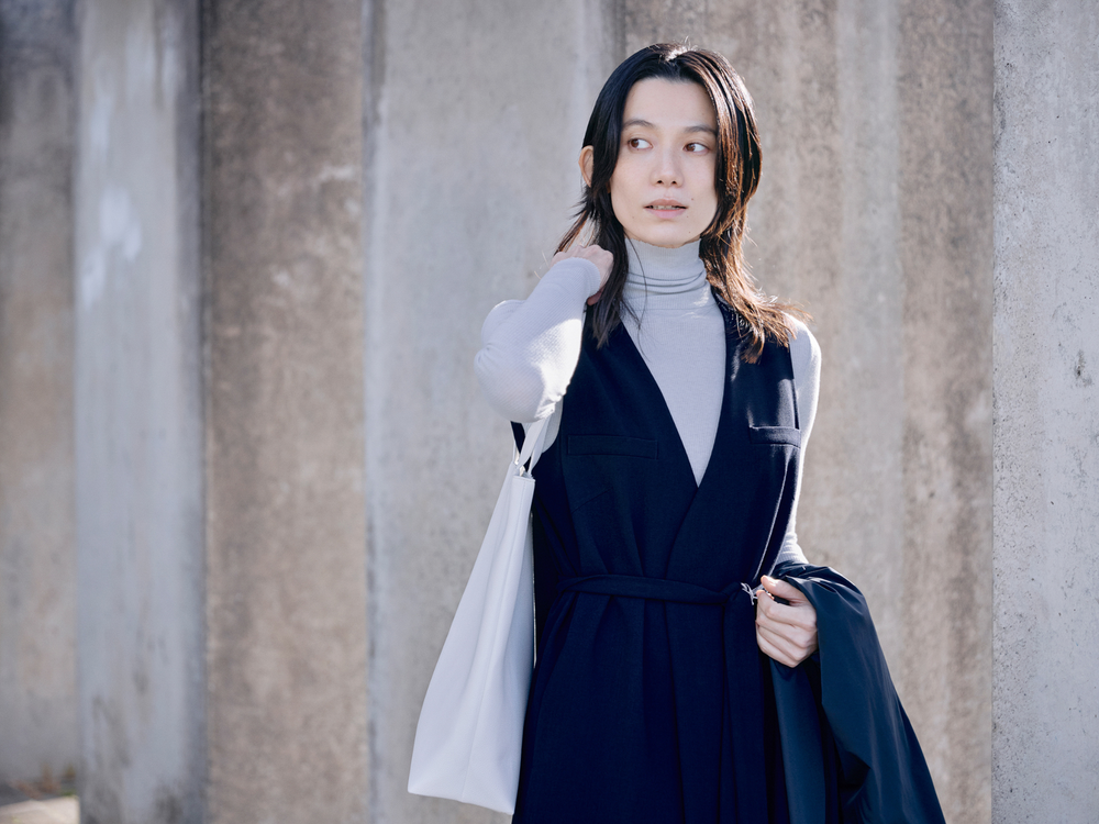薄手のタートルネックカットソーにネイビーのジレをレイヤードしたスタイル。ジレの作り出すVネックラインが顔まわりをすっきり見せてくれます。