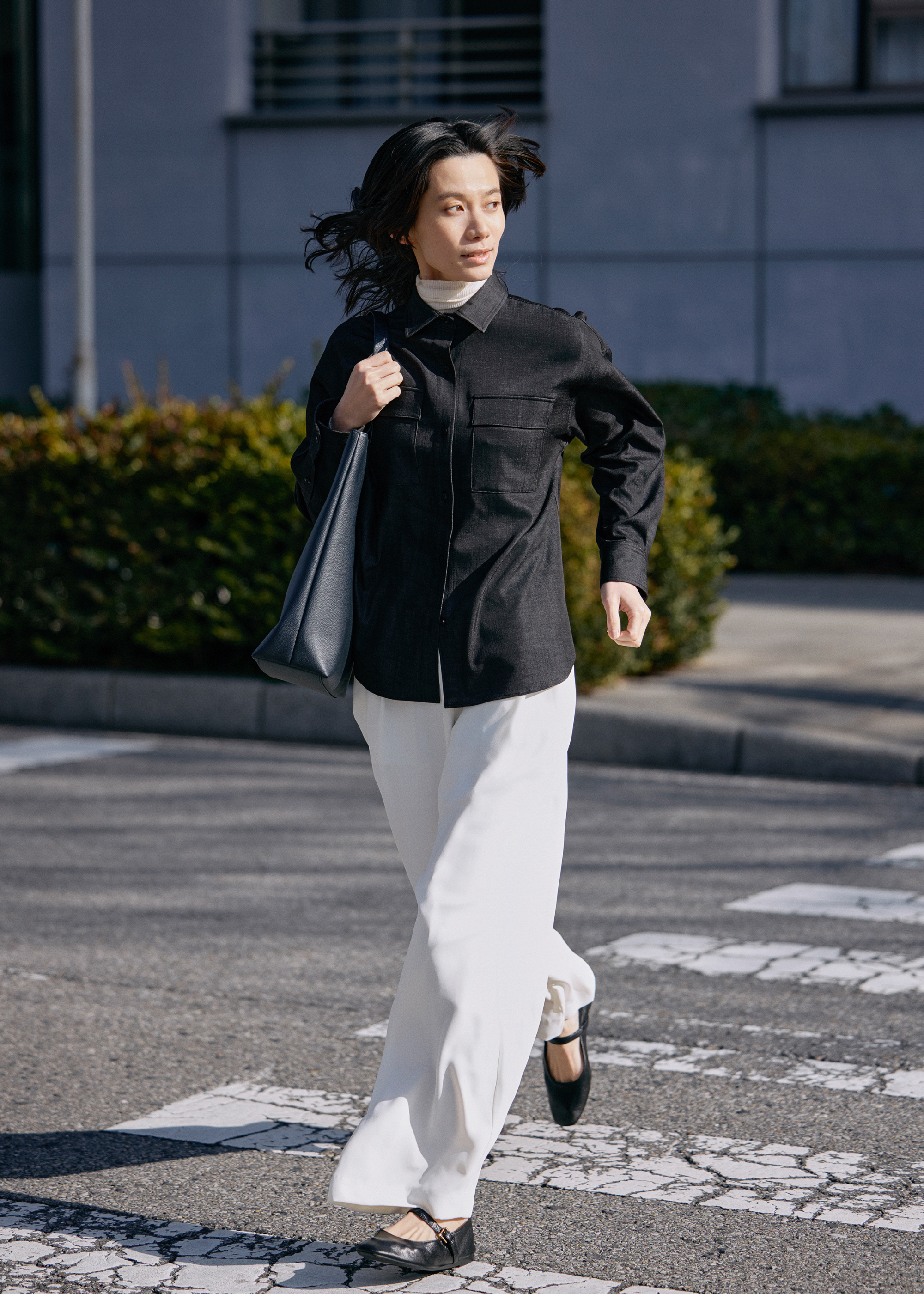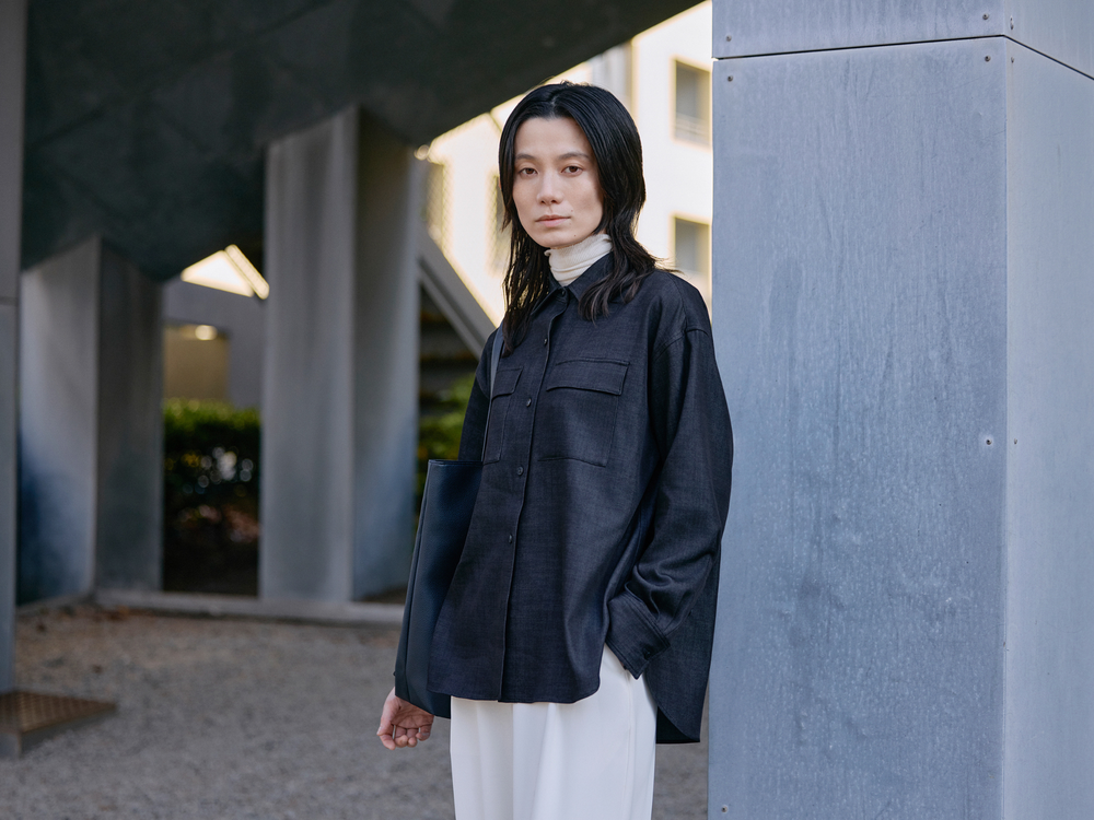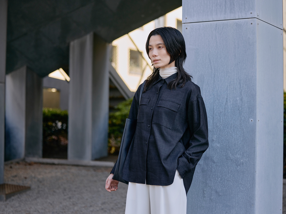ブラックのシャツは、デニム風の素材が程よい抜け感に。肌寒い時期はインナーにニットをレイヤードして防寒を。