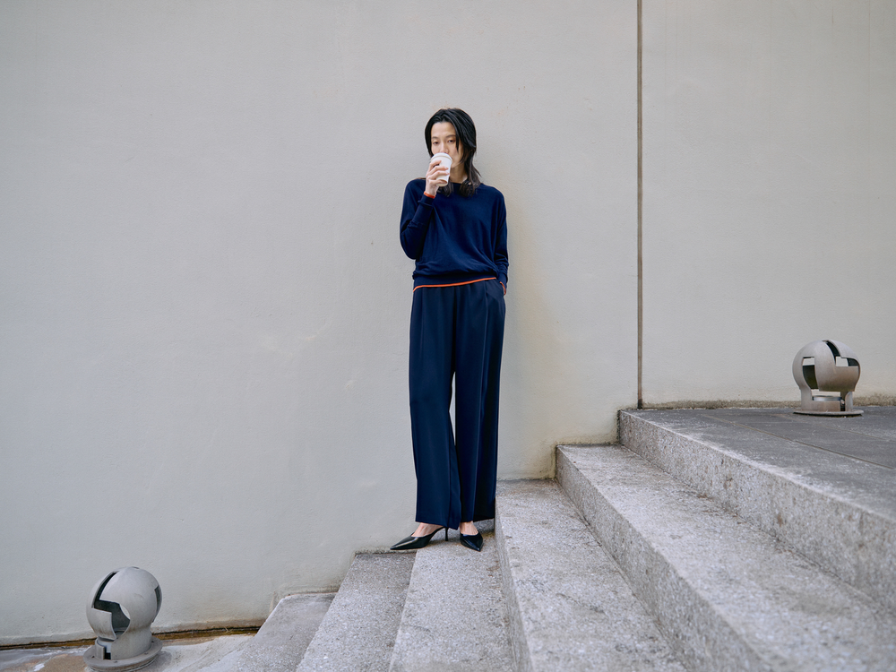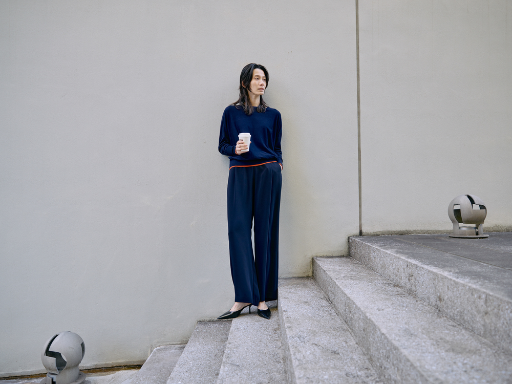 リラクシーな着心地のパンツとシルク&コットンのニットで、デスクワークも快適。
