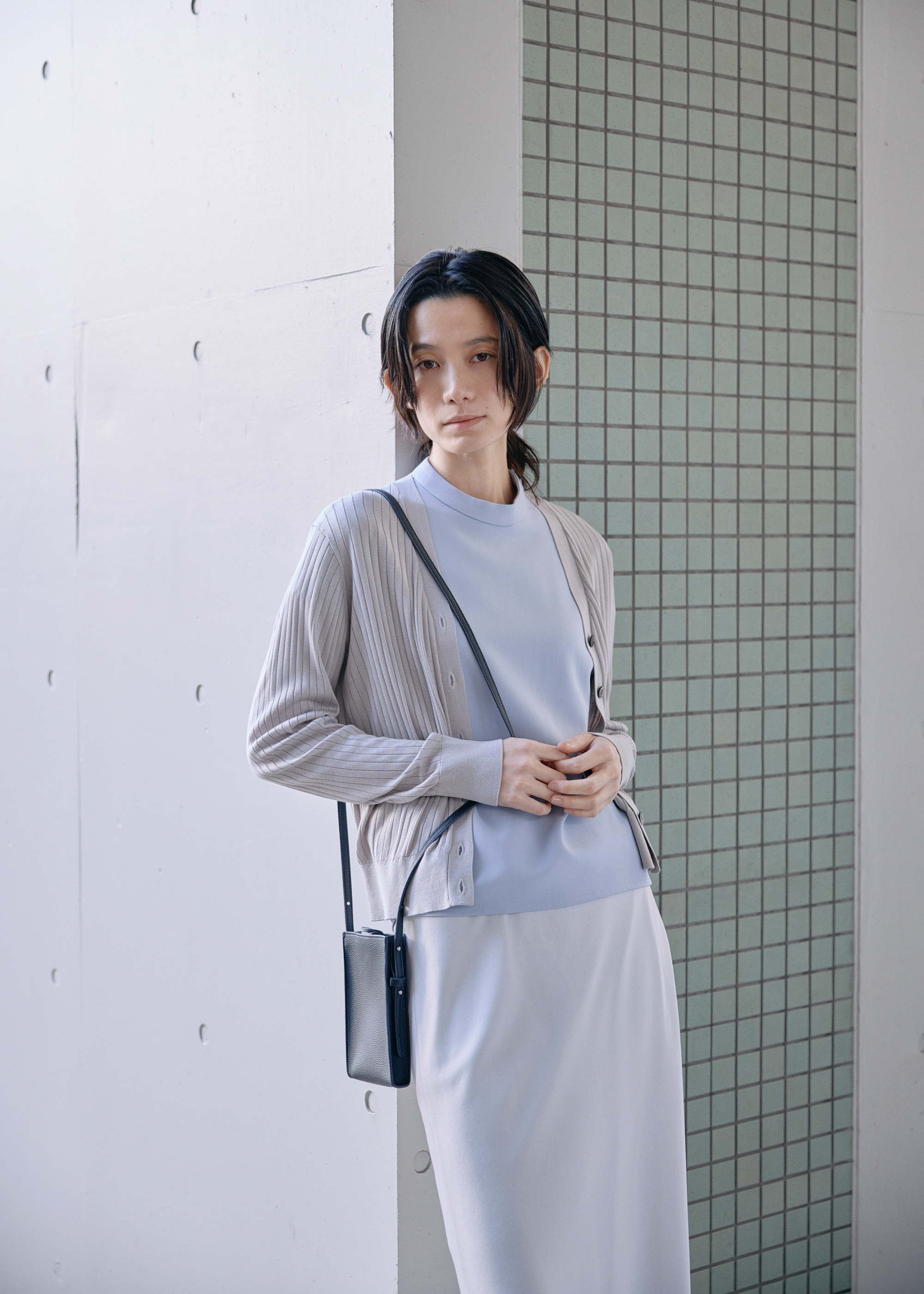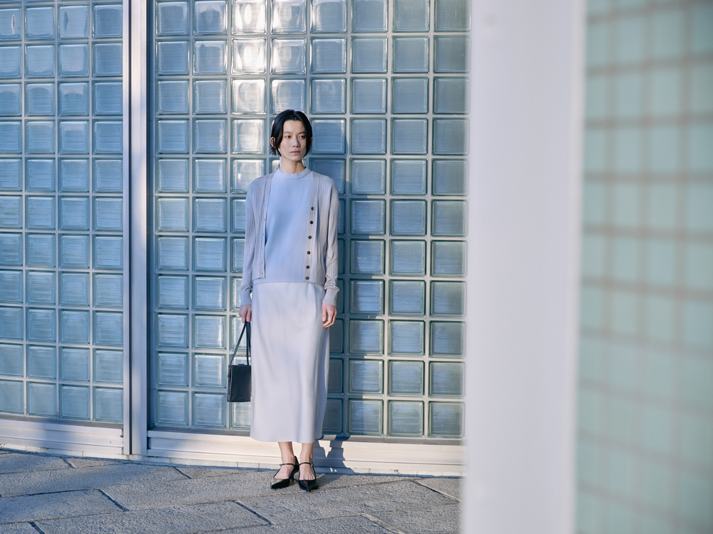春に映えるやわらかなライトブルーを主役に、ニュアンスカラーでまとめたスタイル。