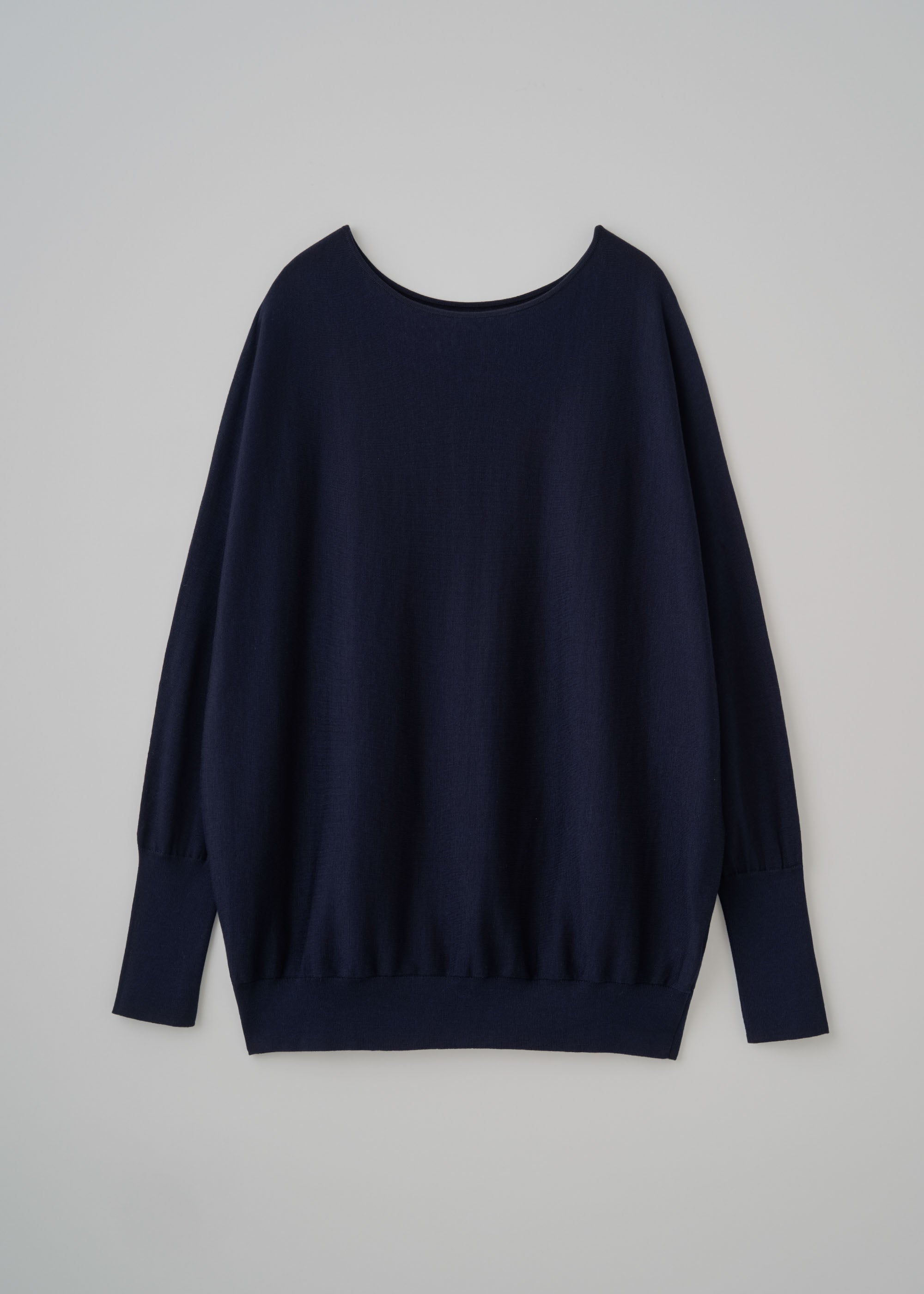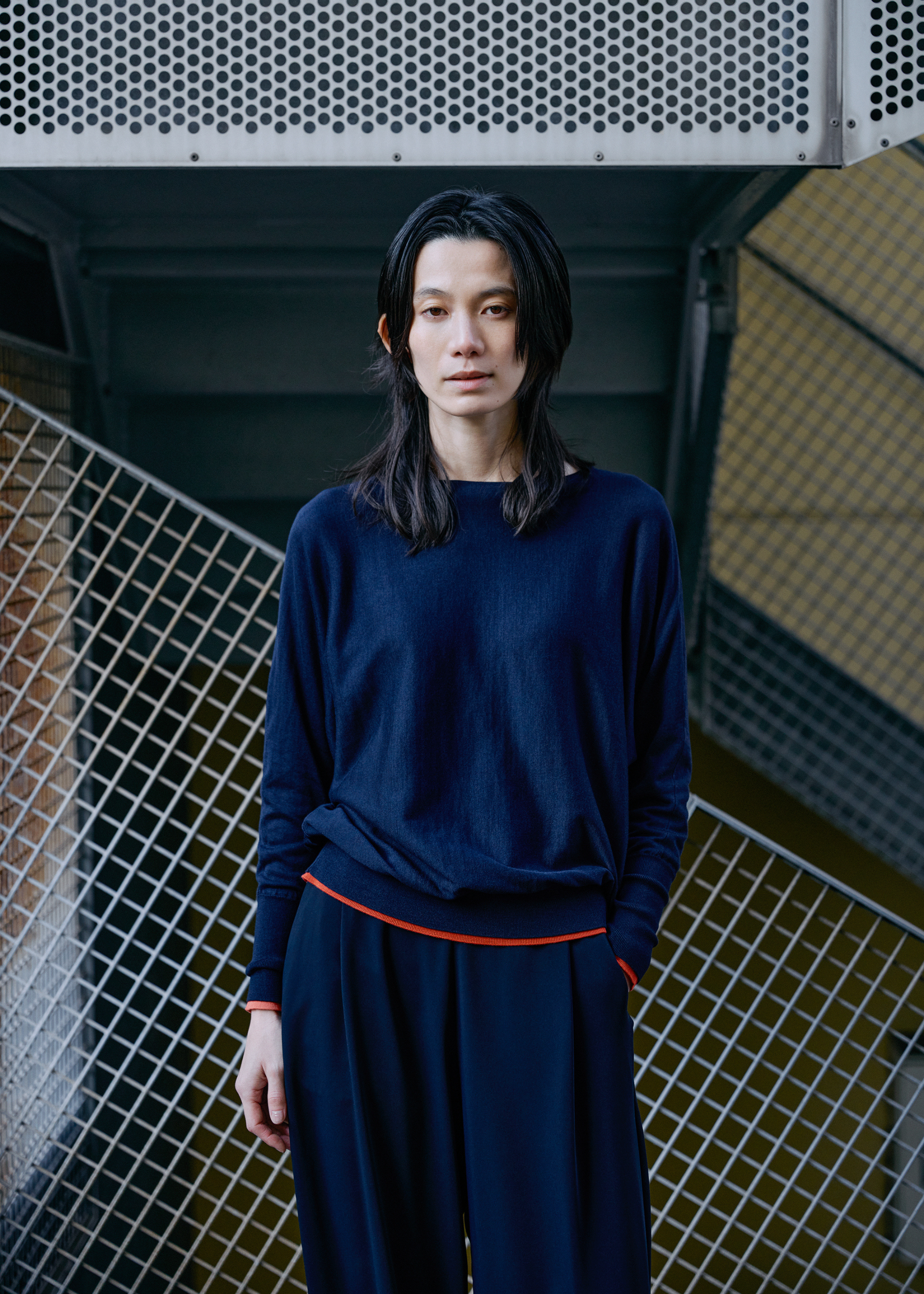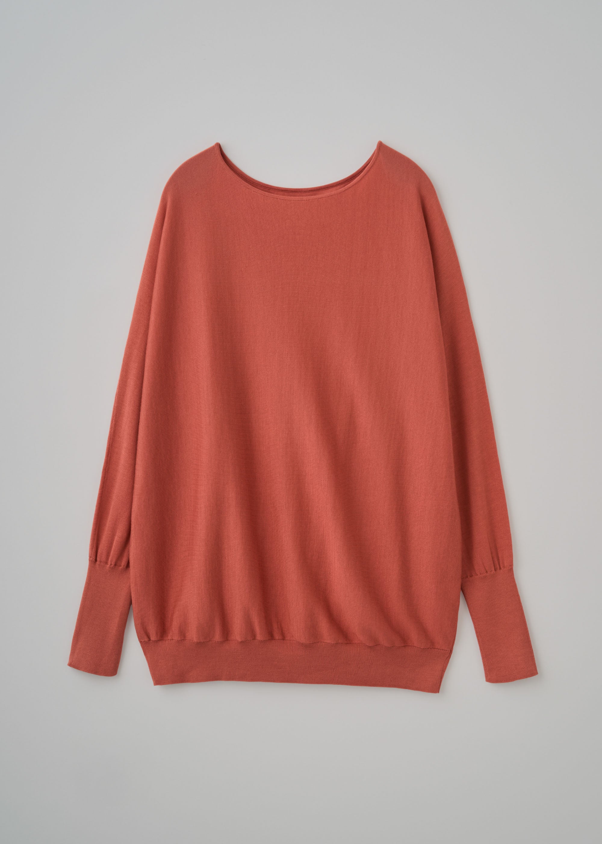 Tops:シルクコットンボートネックニット(CORAL ORANGE&NAVYの重ね着)