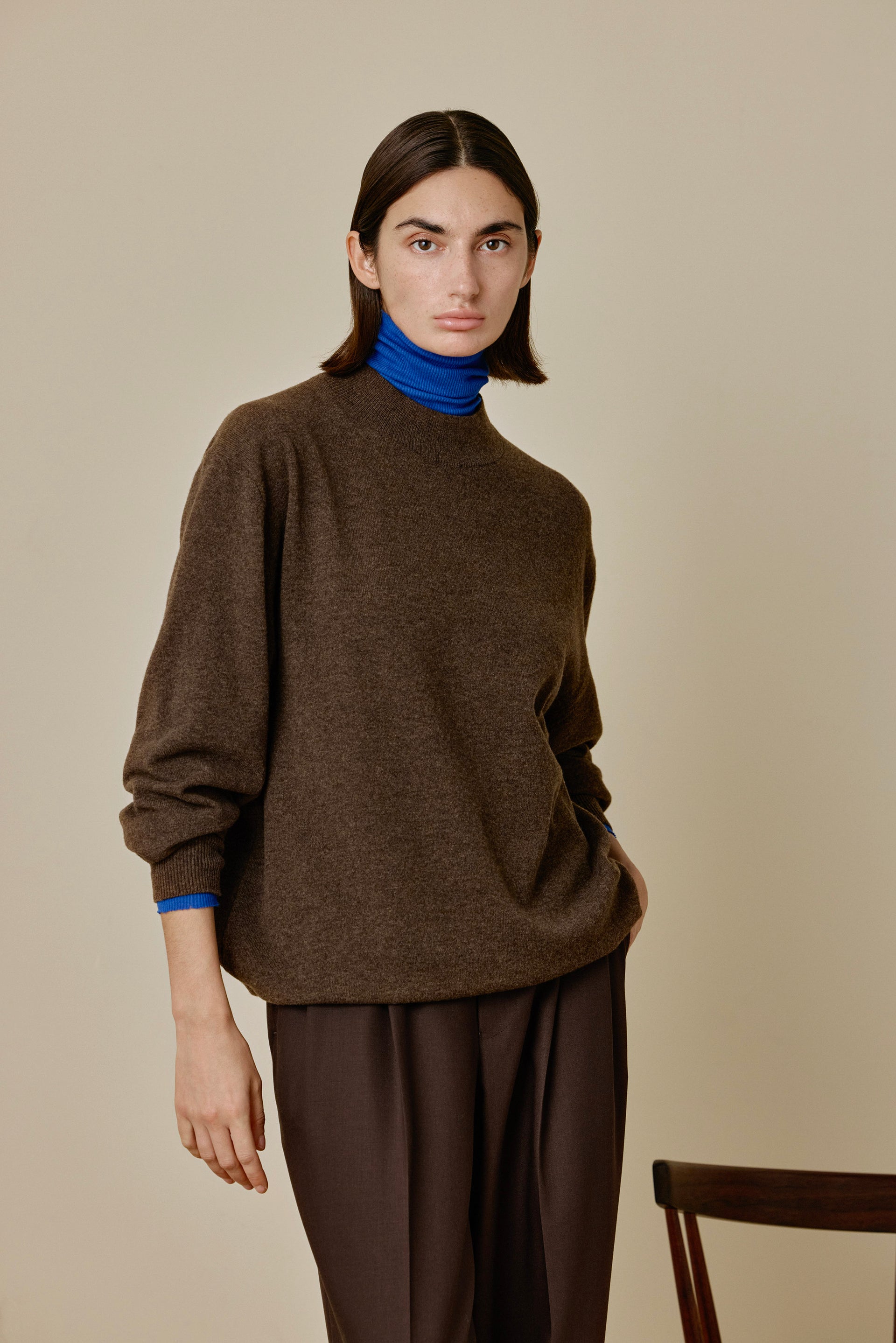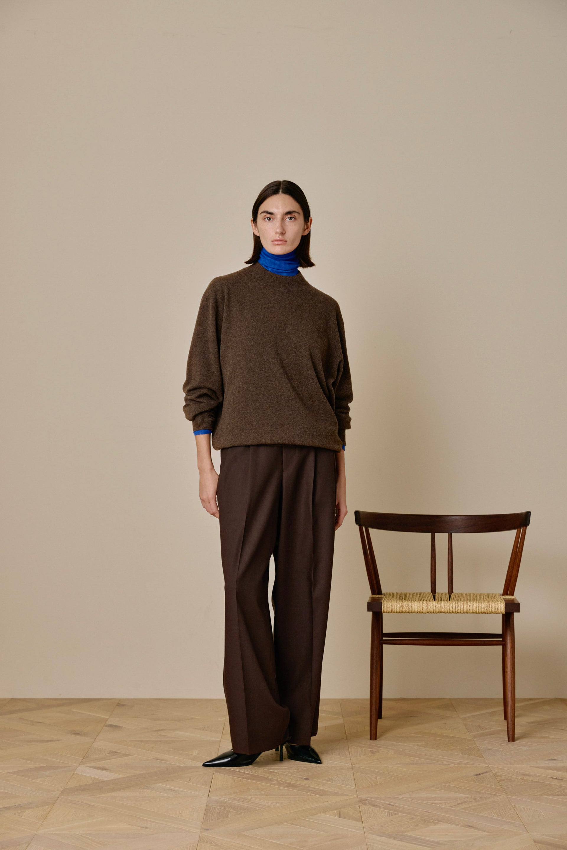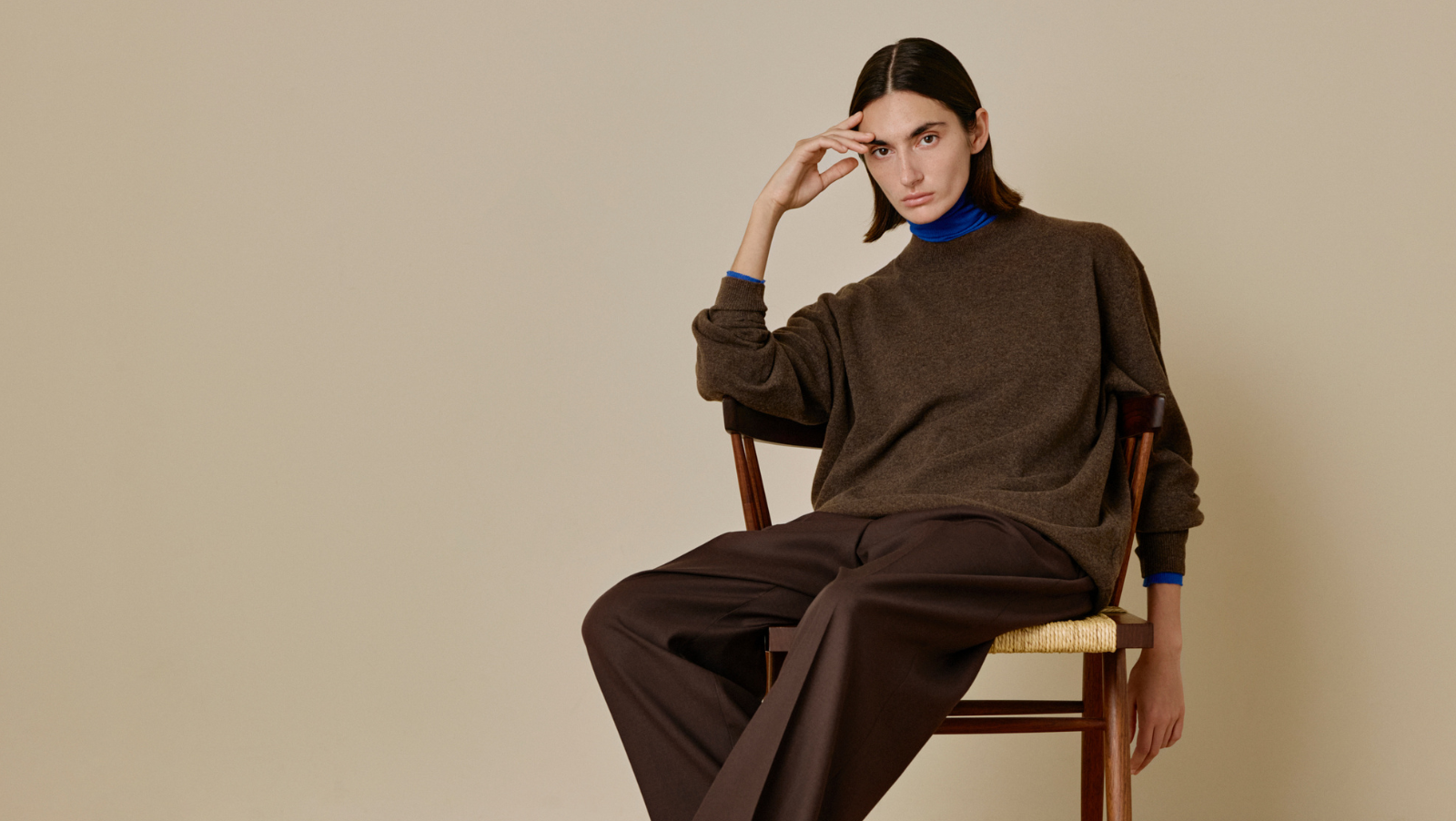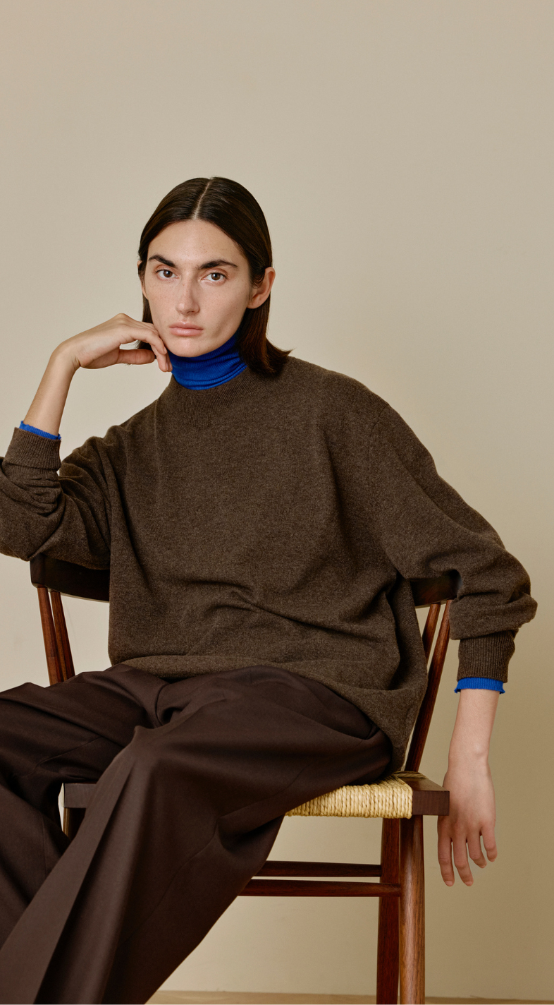 カシミヤのような風合いのブラウンニットに、鮮やかなブルーのタートルネックを差し色として活用。シックなダークブラウンのトラウザーと合わせることで、ブルーの美しさが際立つ洗練されたカラースタイルが完成。