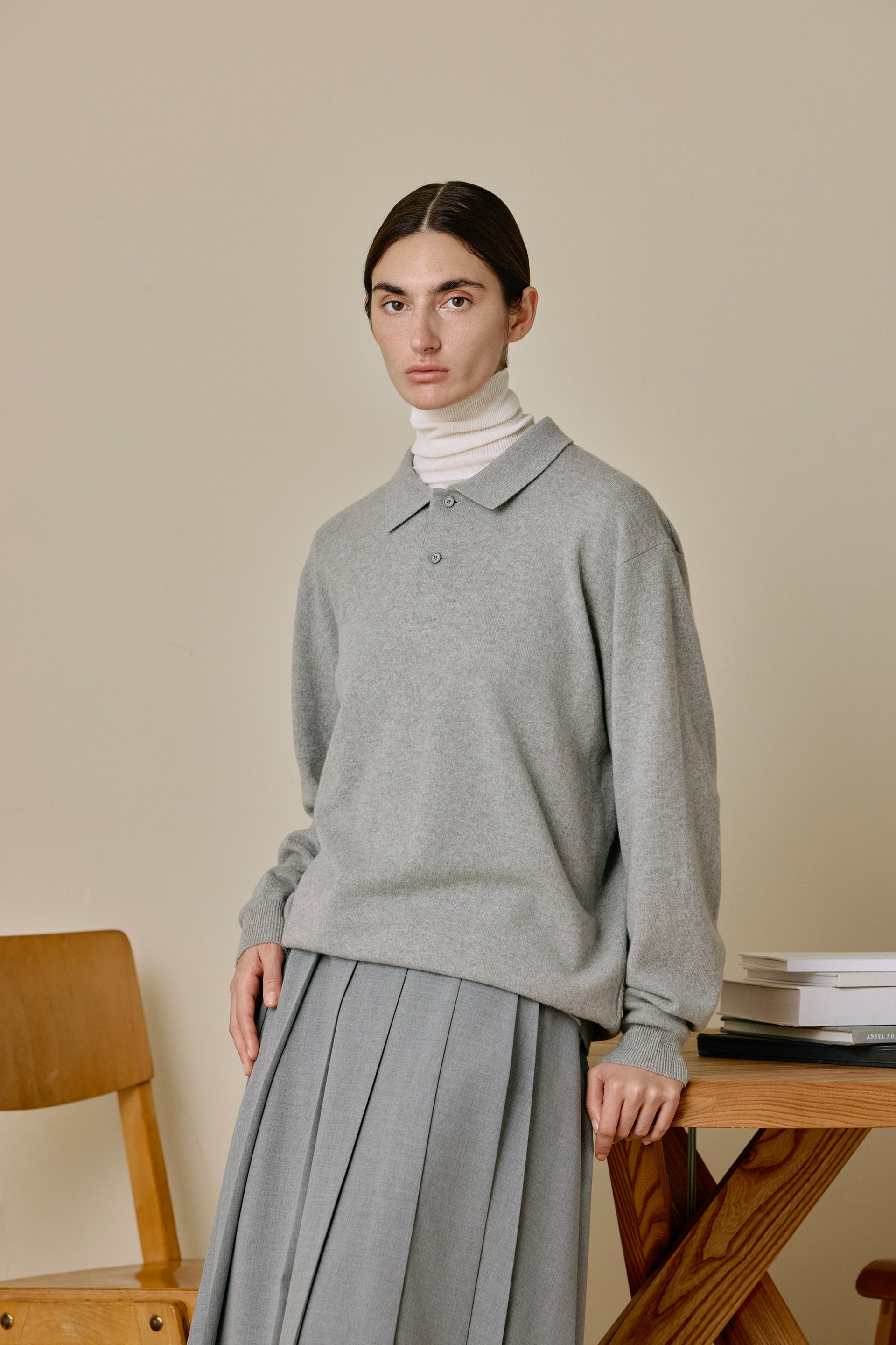 柔らかなポロニットと優雅なプリーツスカートで構成された、清潔感のあるワントーンルック。インナーの白タートルネックが抜け感をプラス。上質な素材感が際立ち、オフィスから休日まで知的な女性像を演出します。