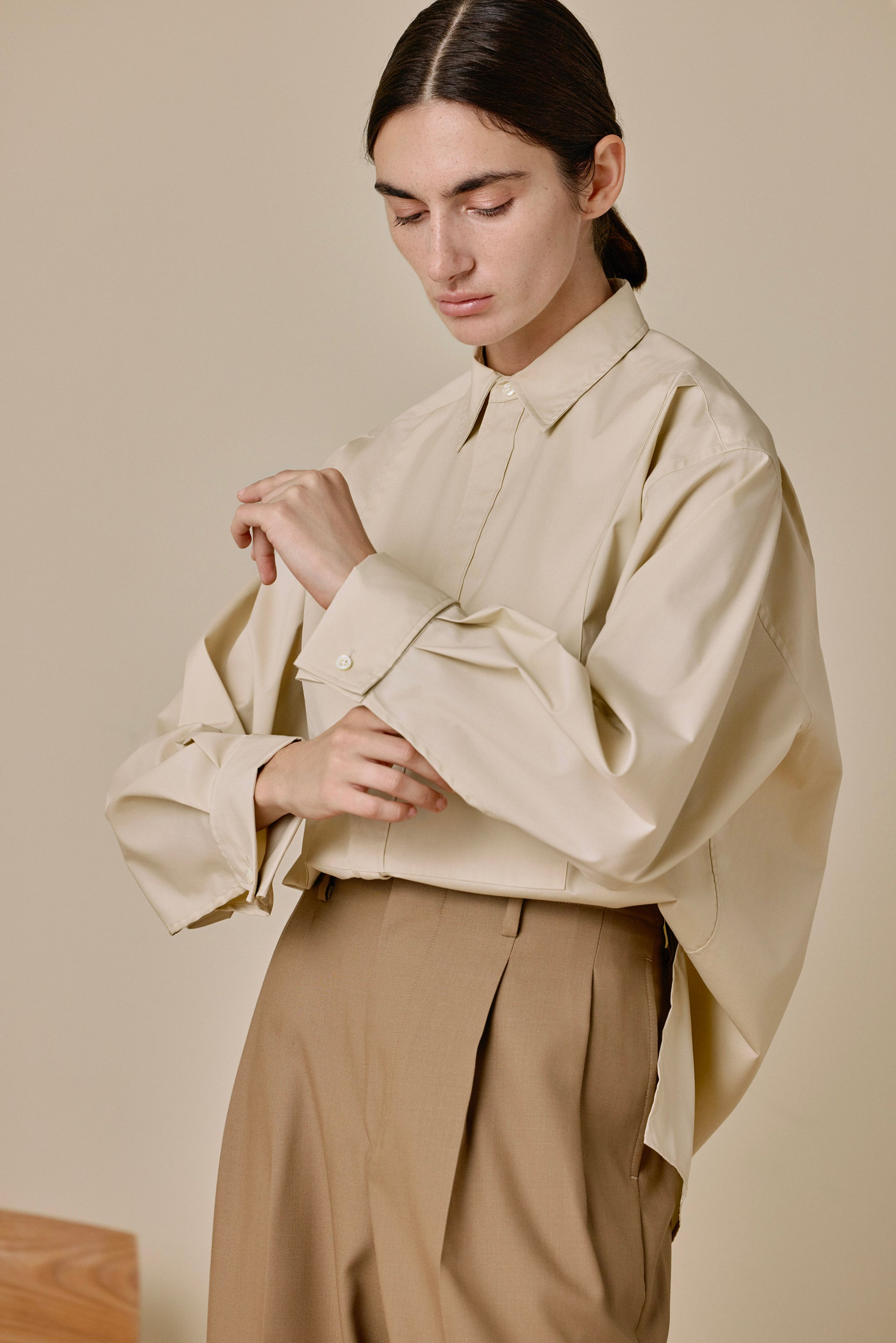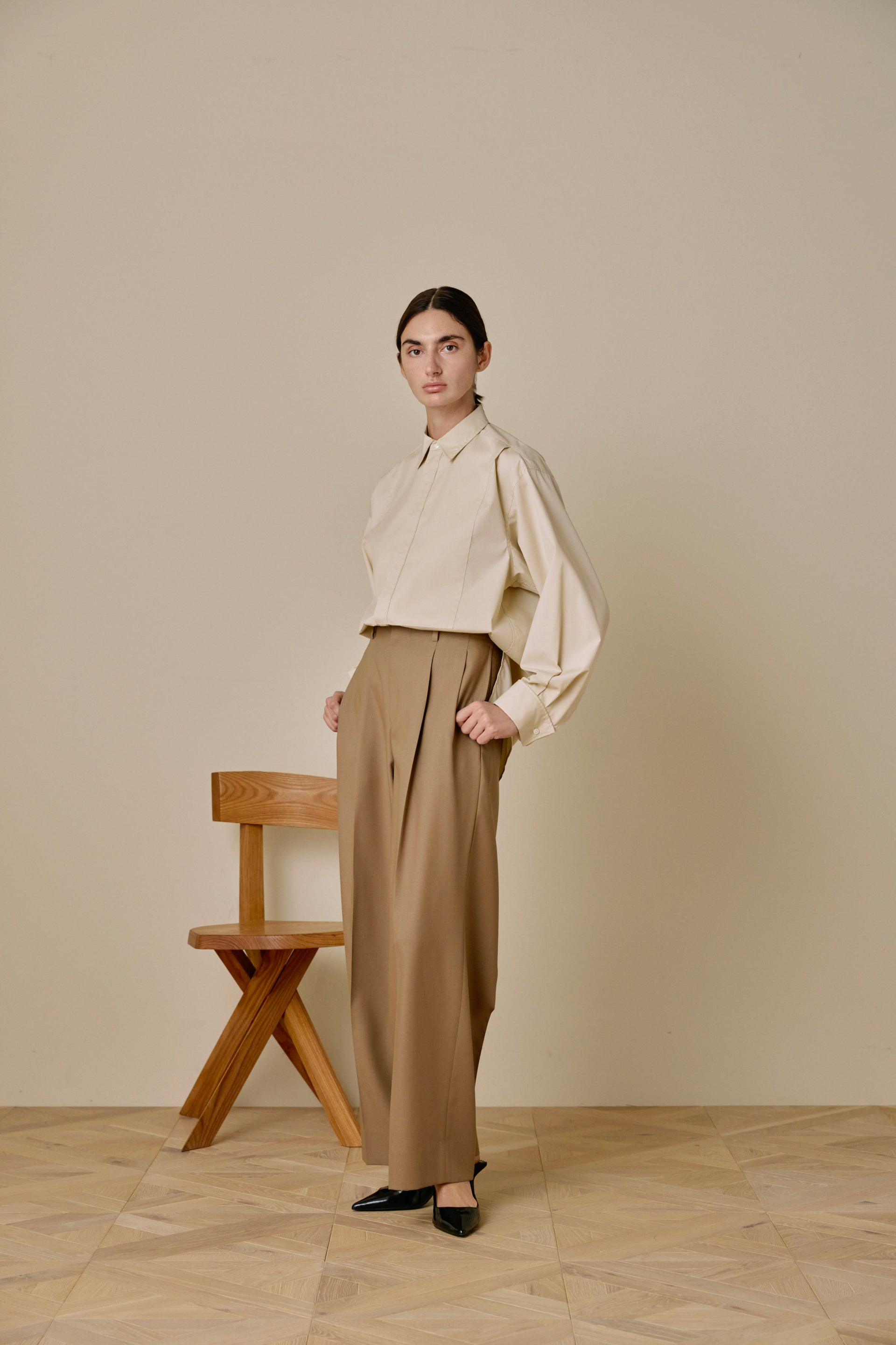 ボリュームスリーブシャツと深めタックのワイドパンツによるエフォートレスなスタイリング。淡いベージュトーンで統一することで、素材のしなやかさと構築的なシルエットが引き立ちます。