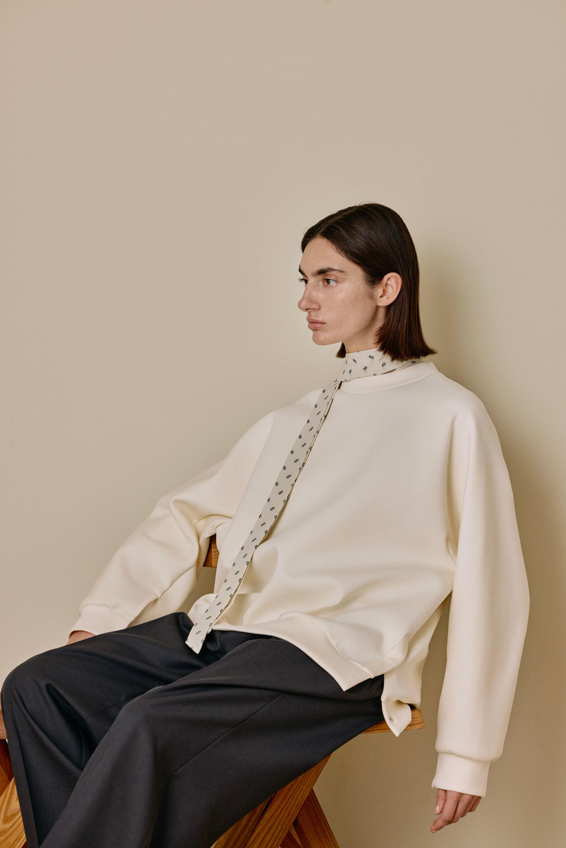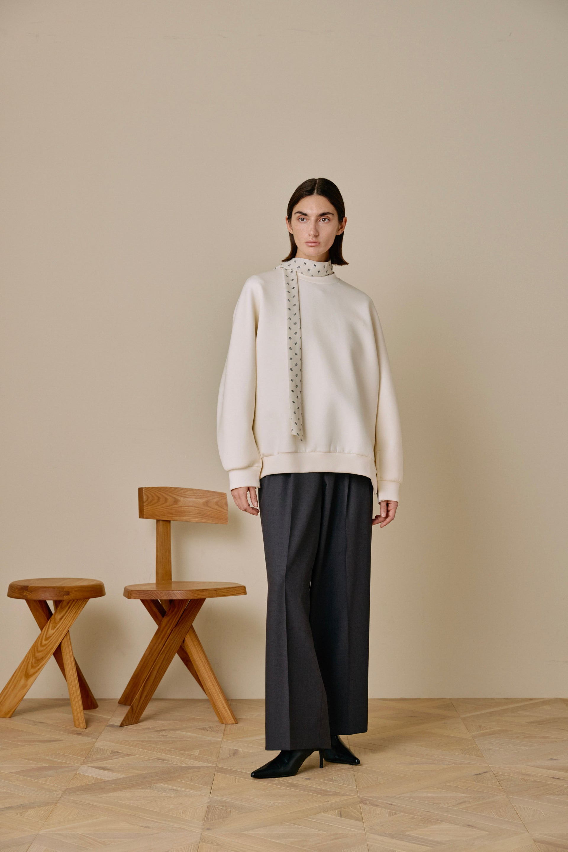 ハリのある素材と立体的なシルエットが特徴のオーバーサイズスウェット。首元のスカーフが小粋なアクセントに。ダークグレーのワイドパンツと合わせ、リラックス感とクラス感を両立した大人の遊び心を感じる着こなしです。