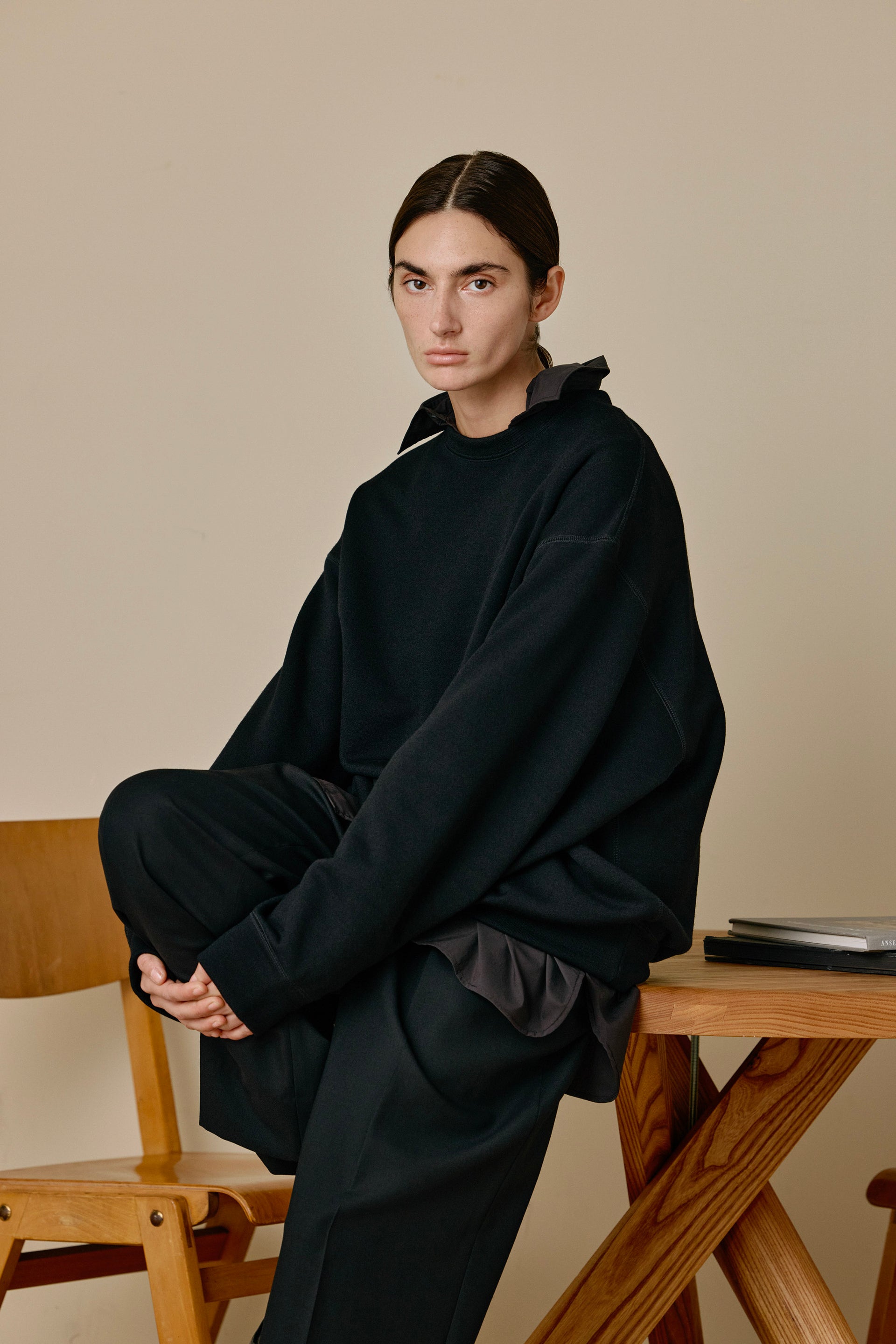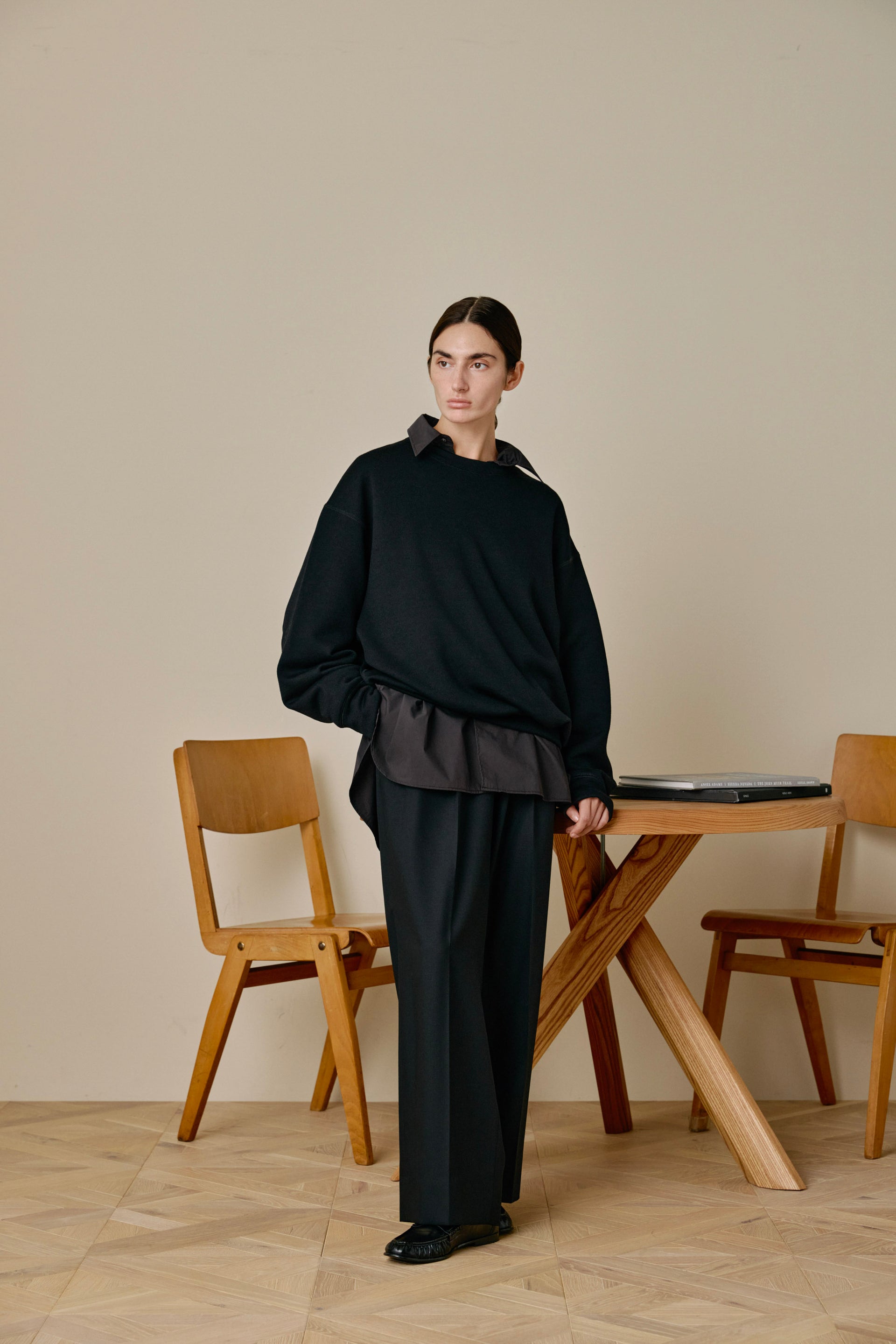 上質な黒のオーバーサイズのスウェットにチャコールグレーのシャツを重ね、軽やかな抑揚をプラス。リラックス感のあるトップスと流れるようなワイドパンツのバランスが絶妙です。マニッシュな中にも柔らかさを秘めたモードな着こなしです。