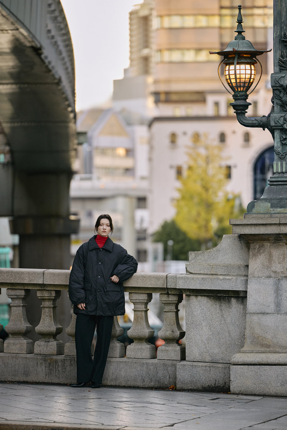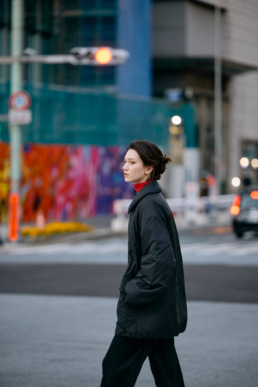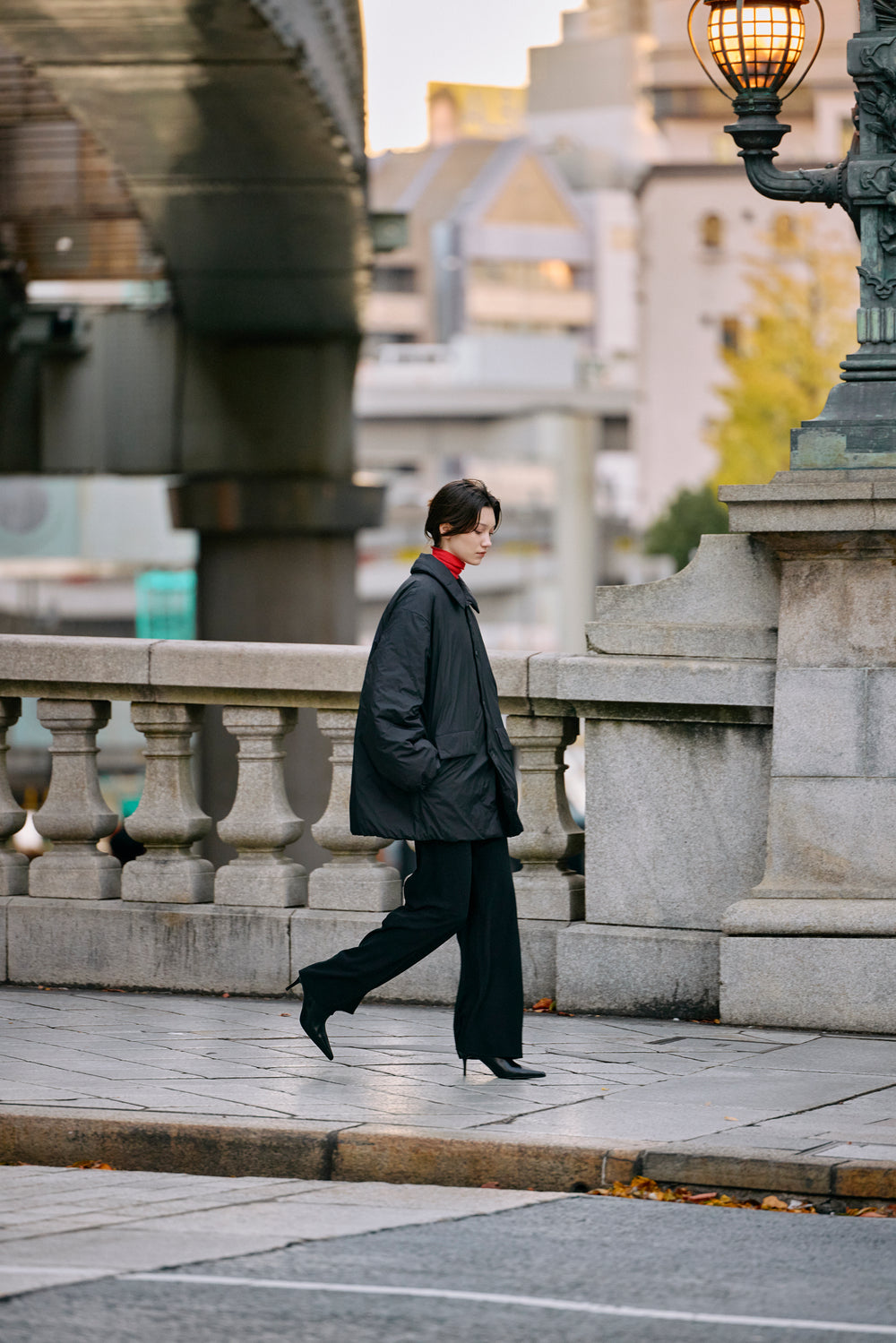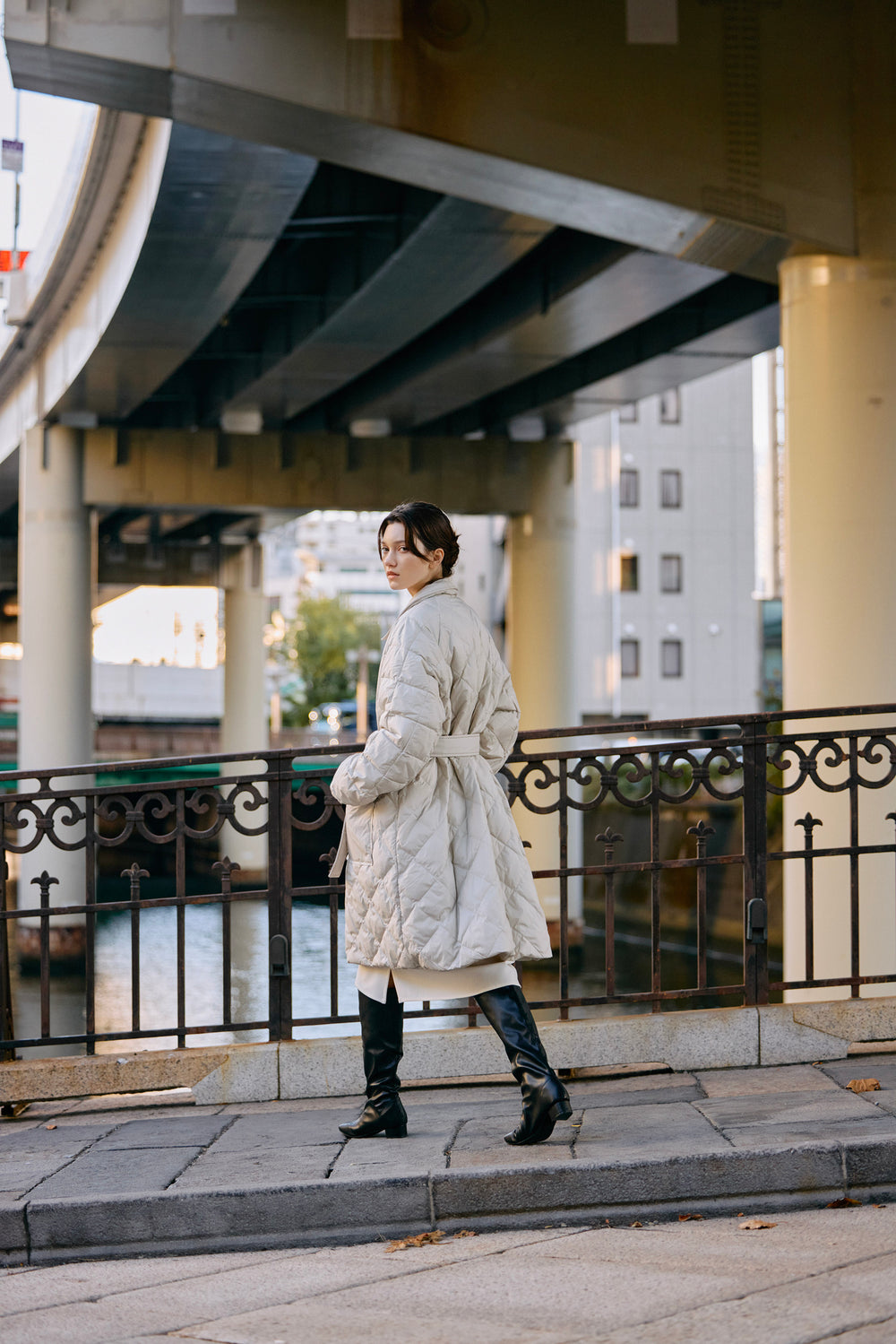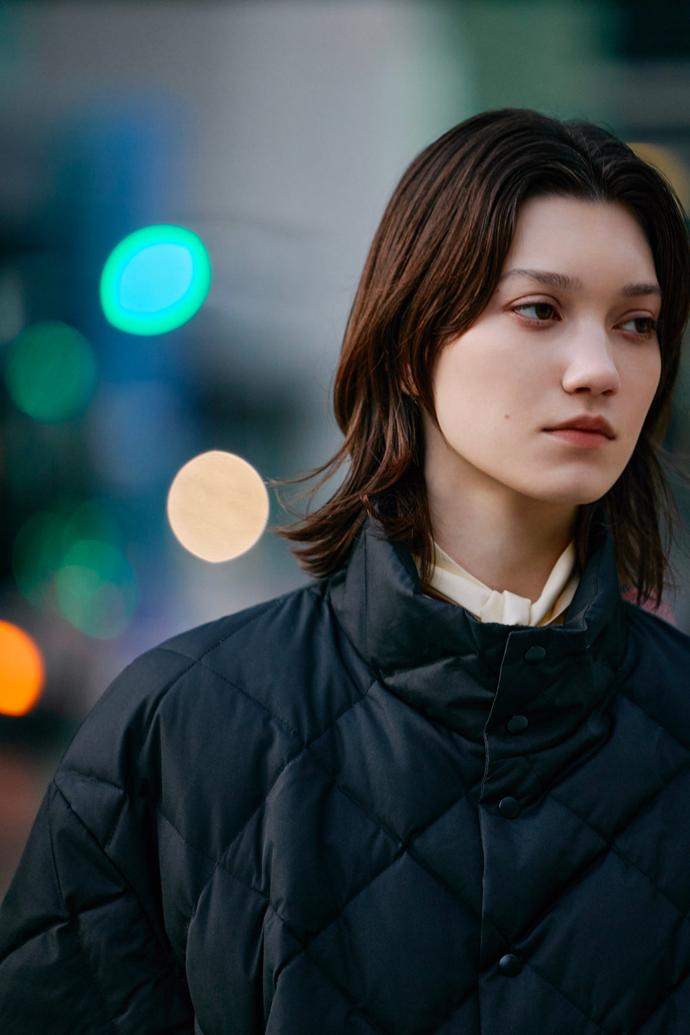 構築的なシルエットが映えるキルティングダウンには、ダークカラーのフレアスカートを合わせたモダンな着こなしを。実用的なのにスタイリッシュに決まるスタンドカラーデザインによって、着るだけで程よくモードな印象に仕上がります。