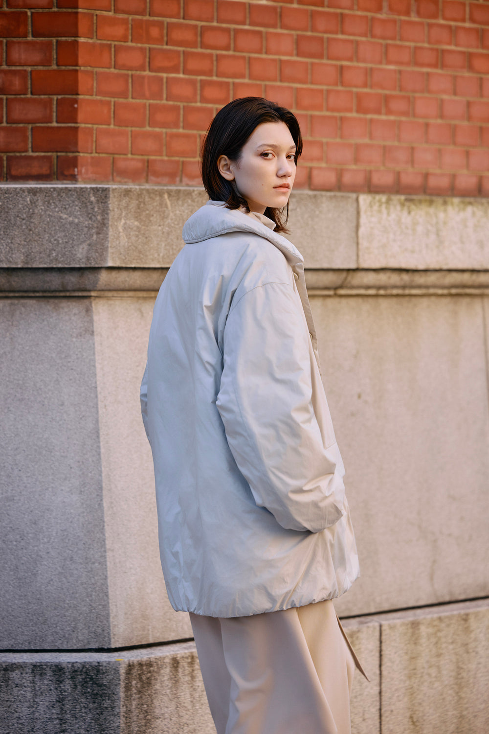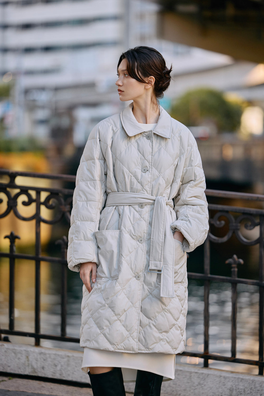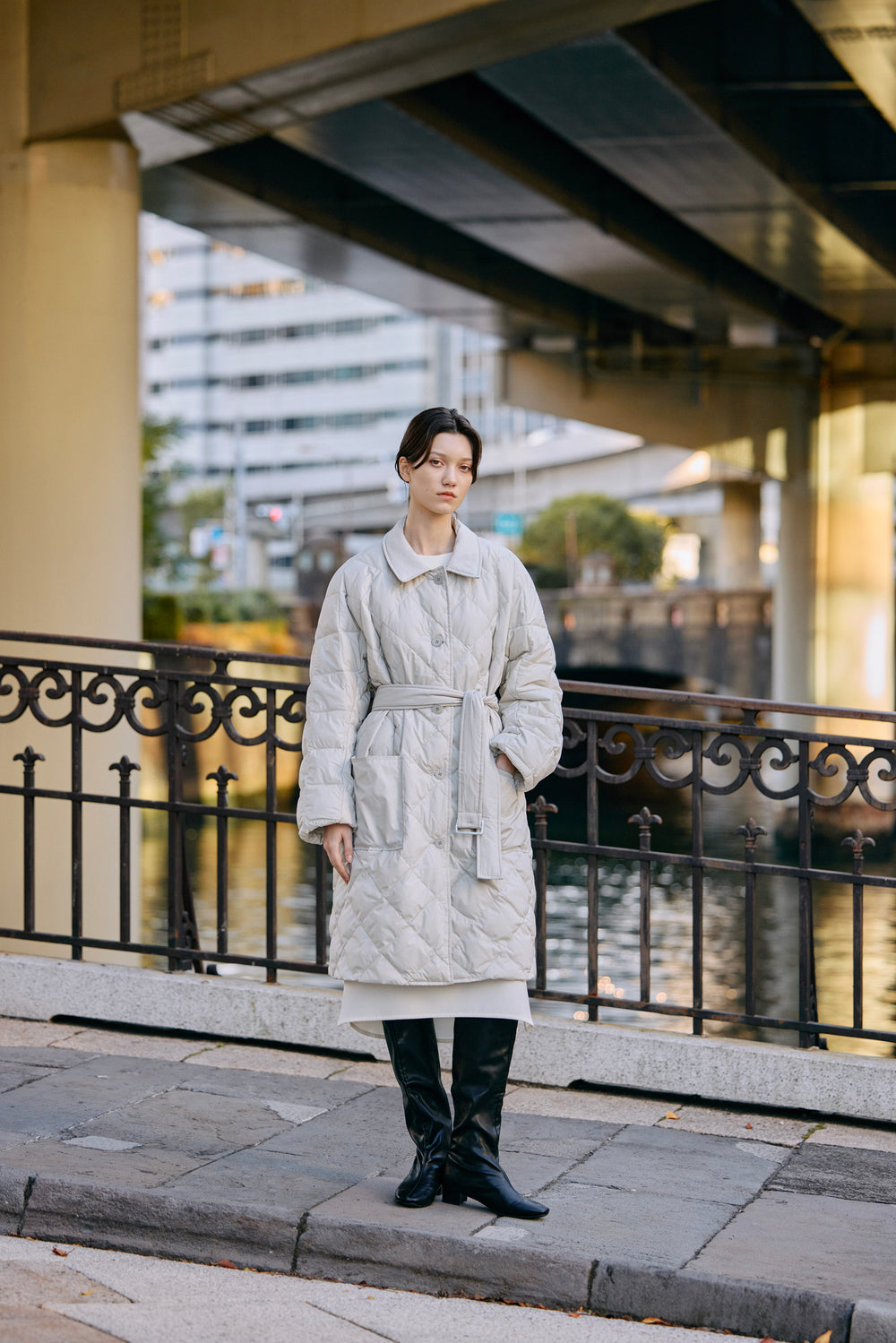 リバーシブル着用可能なステンカラーダウンコートは、ダウン特有のカジュアル感を一掃する優雅なロング丈。表情豊かなキルティング側を表に出すことで、奥行きのある柔らかなワントーンスタイルに。