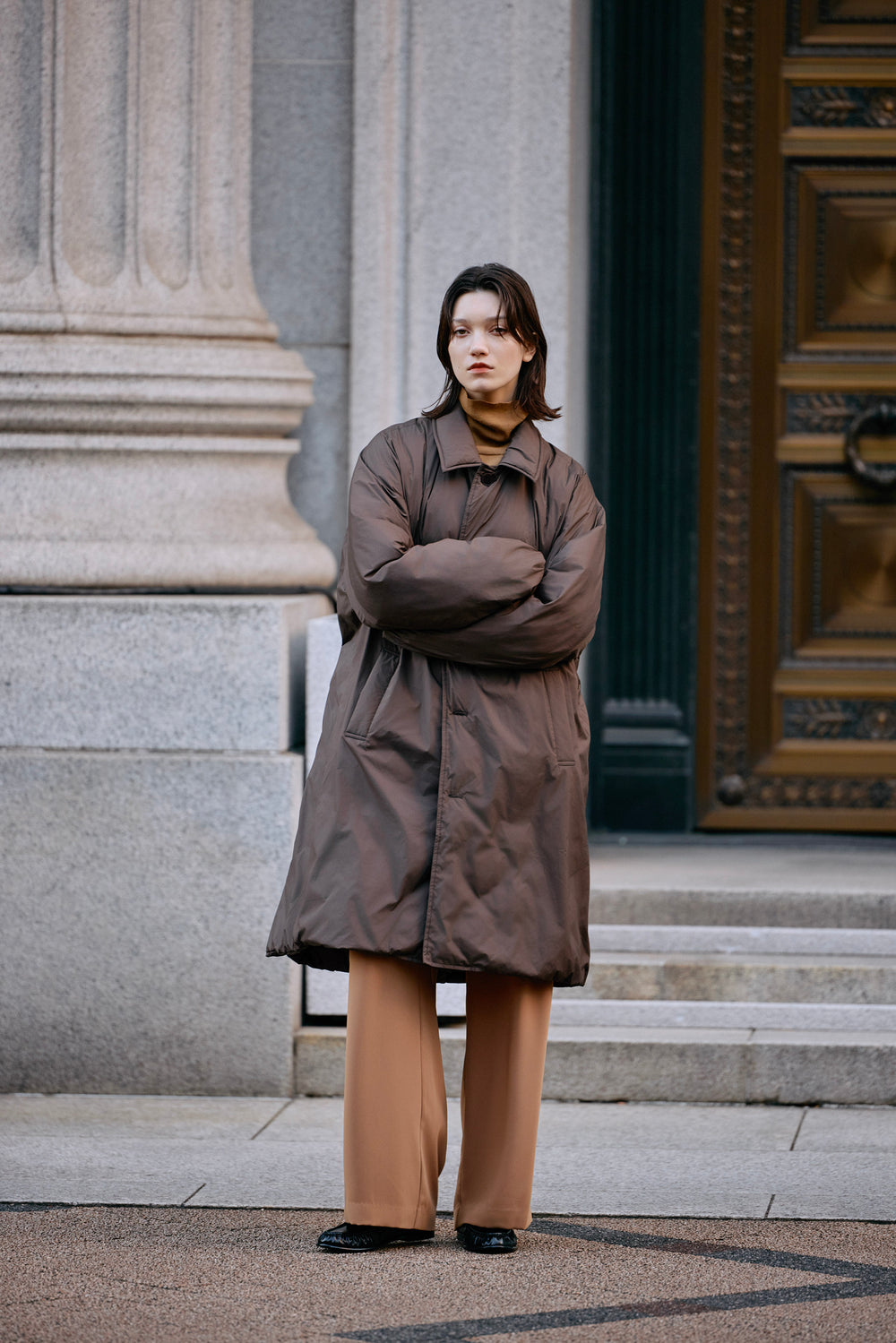 光沢を抑えたマットな質感のダウンは、カジュアルすぎず品格のある佇まいに。ふわっと空気をまとうようなシルエットが、シンプルな装いをワンランク上へと引き上げます。