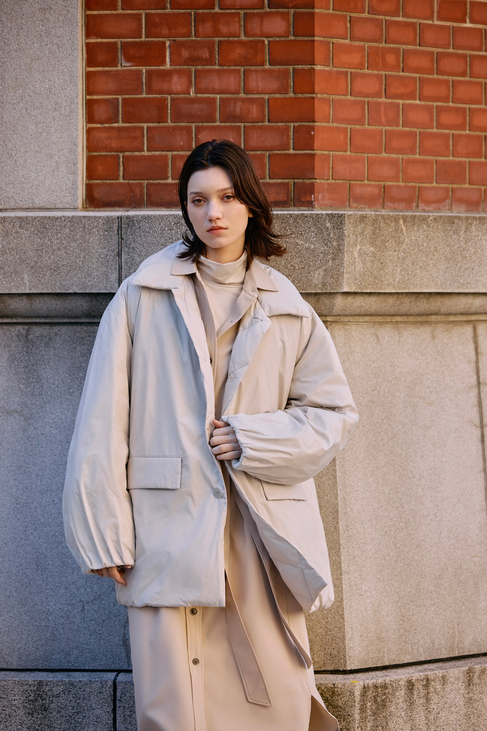顔周りを明るく見せる優しいペールトーンのショートダウン。ベージュやライトグレーのインナーで、上品なワントーンスタイルに仕上げました。