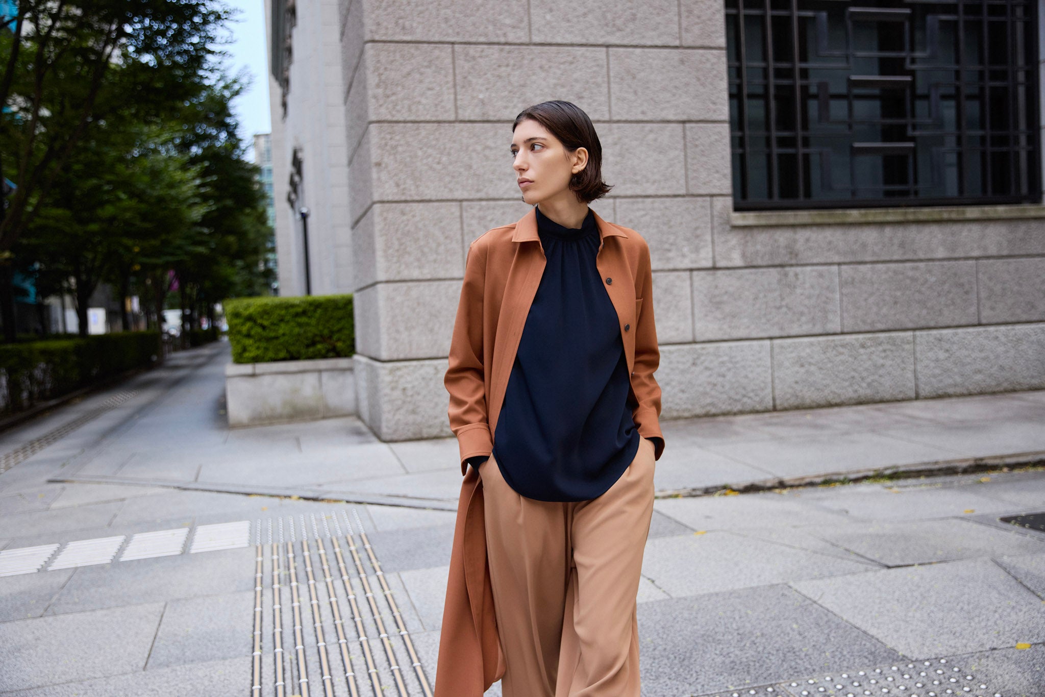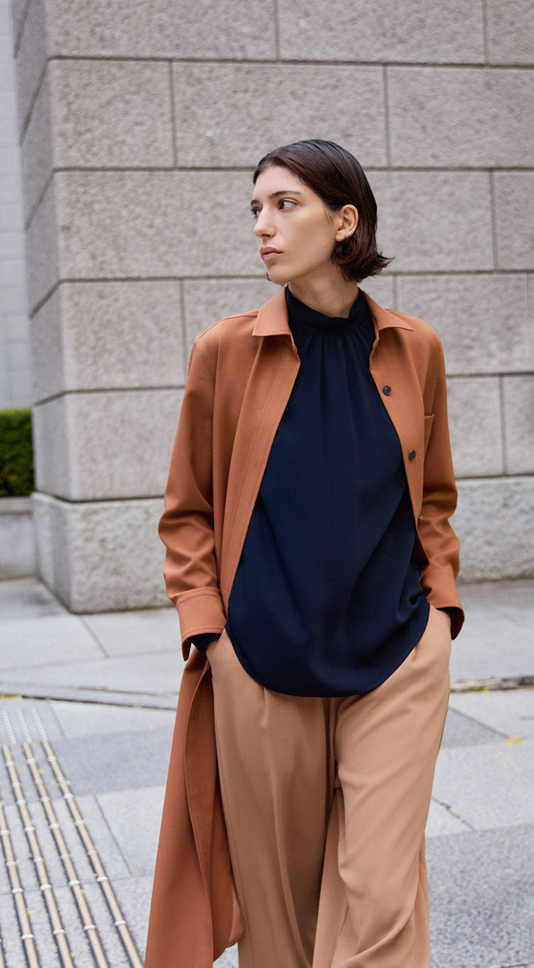 深みのあるテラコッタブラウンのシャツワンピースを羽織りとして活用。ネイビーのブラウスと同系色のパンツが都会的な洗練を引き立て、マニッシュな雰囲気の中に軽やかさを添えます。