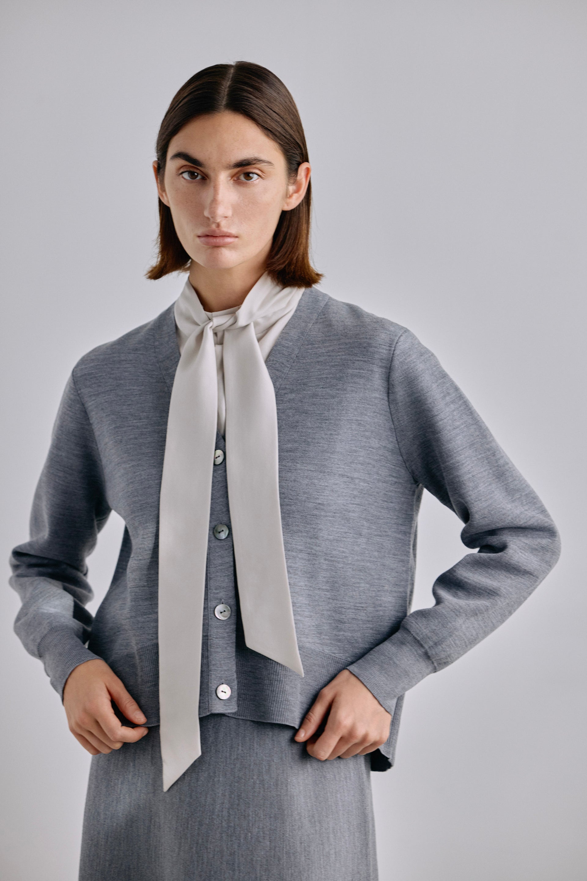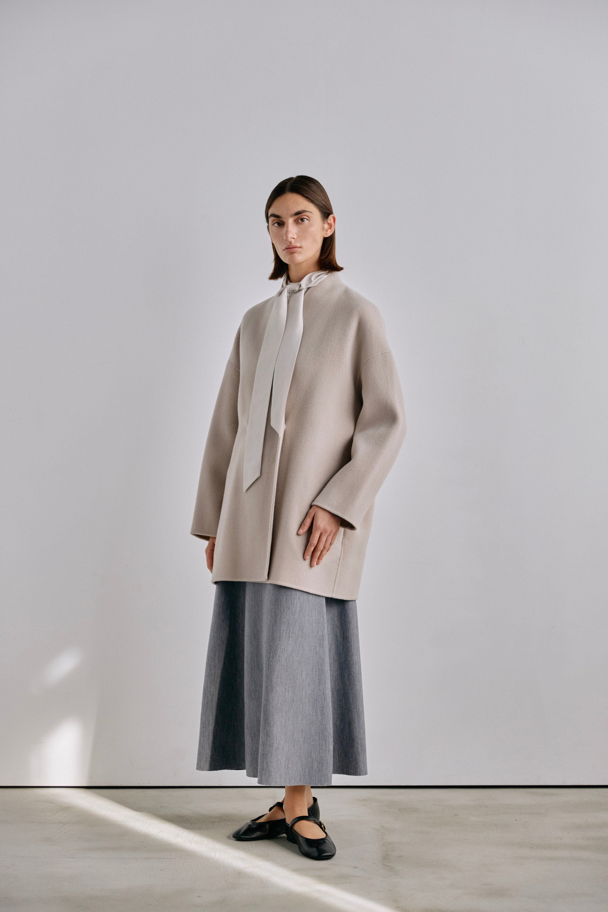 グレージュのノーカラーコートに、グレイッシュなスカートを合わせた優美なAラインシルエット。首元に添えたリボンタイのブラウスが、顔周りにクラシックな華やぎを添えています。