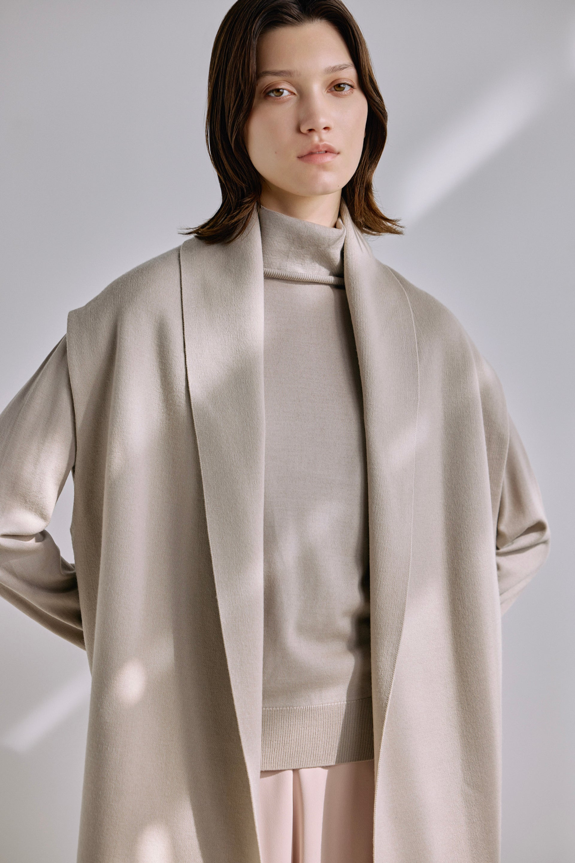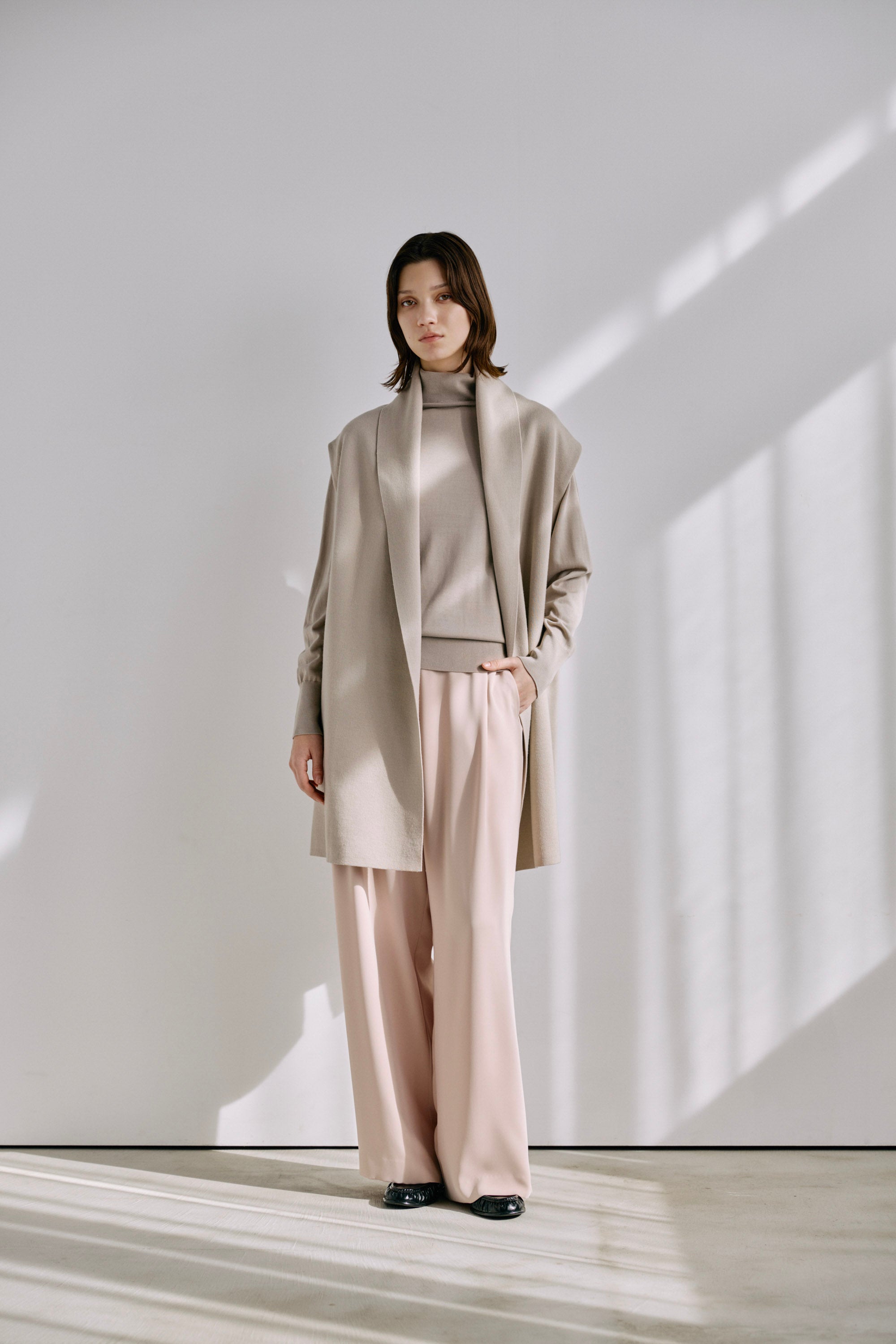ニュアンスの異なるベージュを重ねた、奥行きのあるワントーンスタイル。ショールカラーのジレが、タートルネックにリラクシーな表情を加えつつ、縦のラインを強調してスマートな印象に。