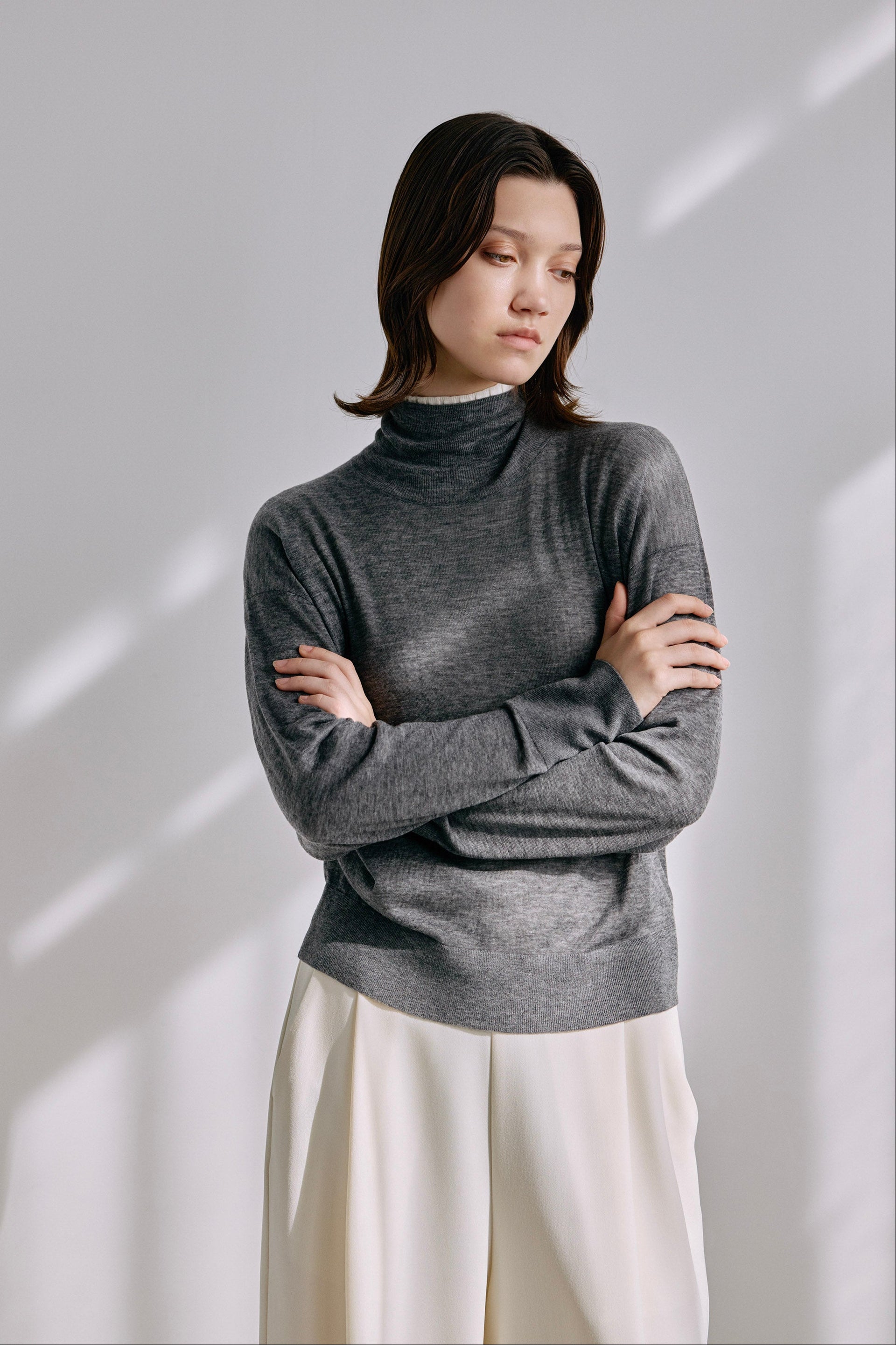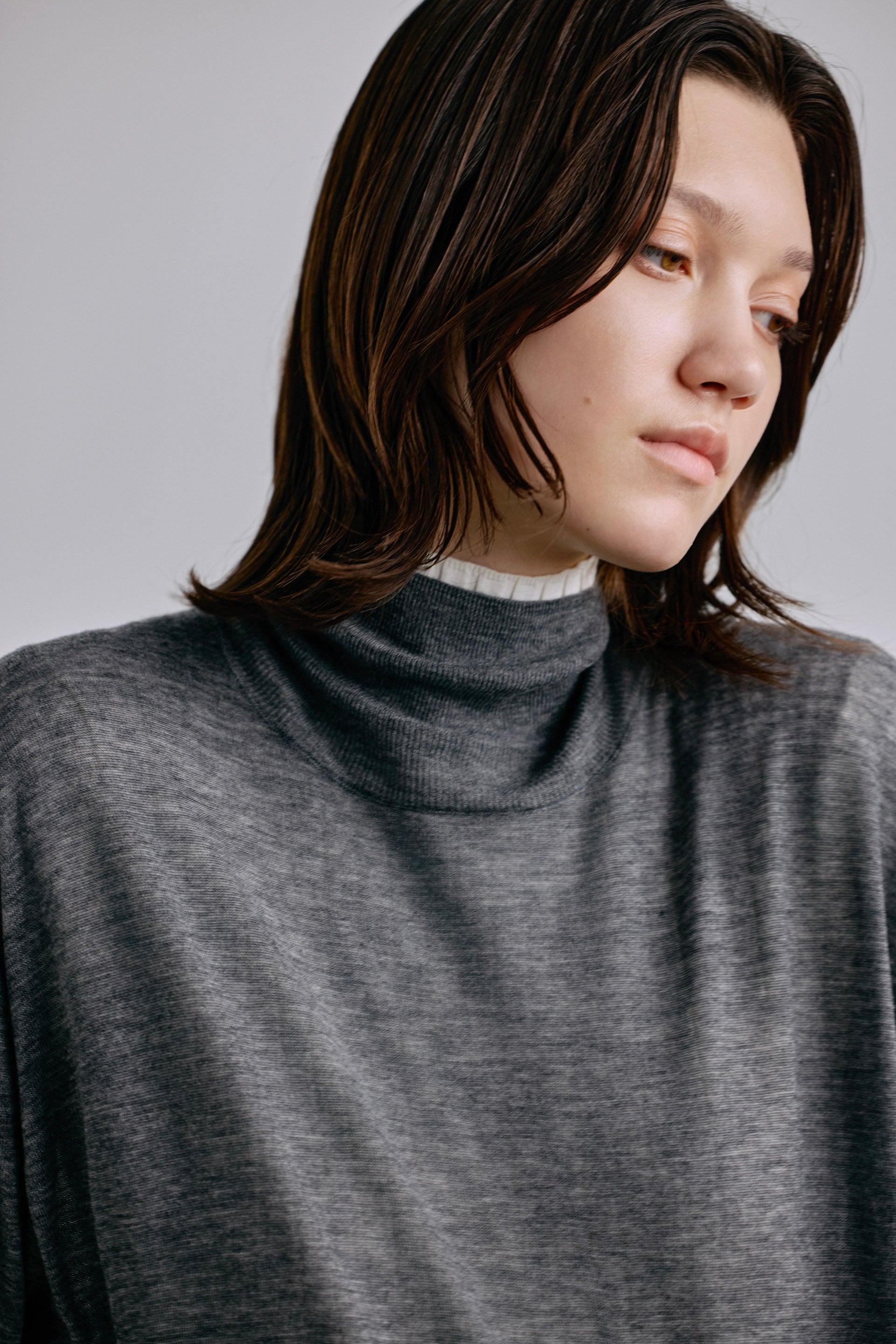 ピュアなホワイトとグレーを組み合わせた、透明感あふれる装い。シアーなニットにリブのタートルにネックをレイヤードして重厚さを抑え、顔周りを明るく演出しました。