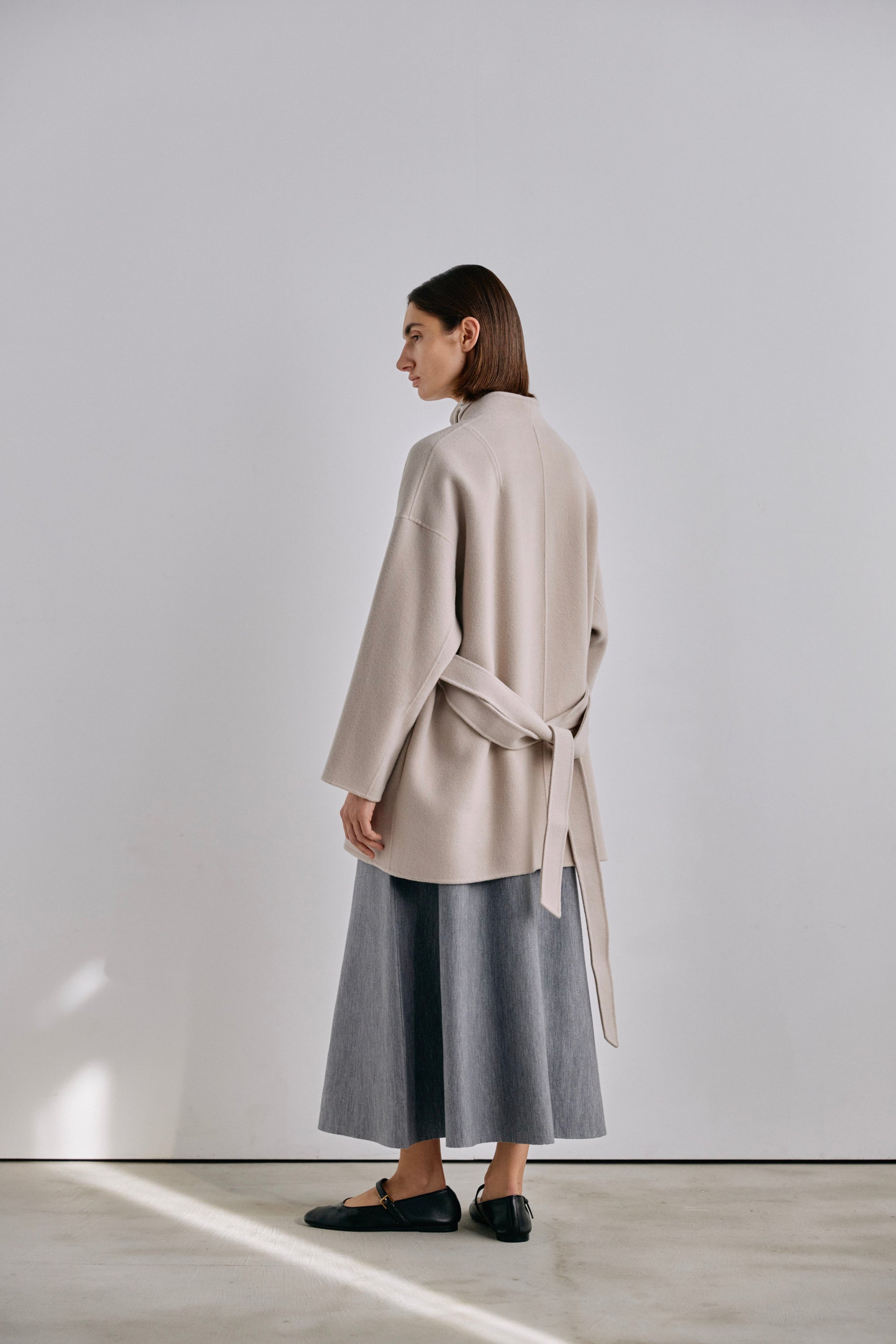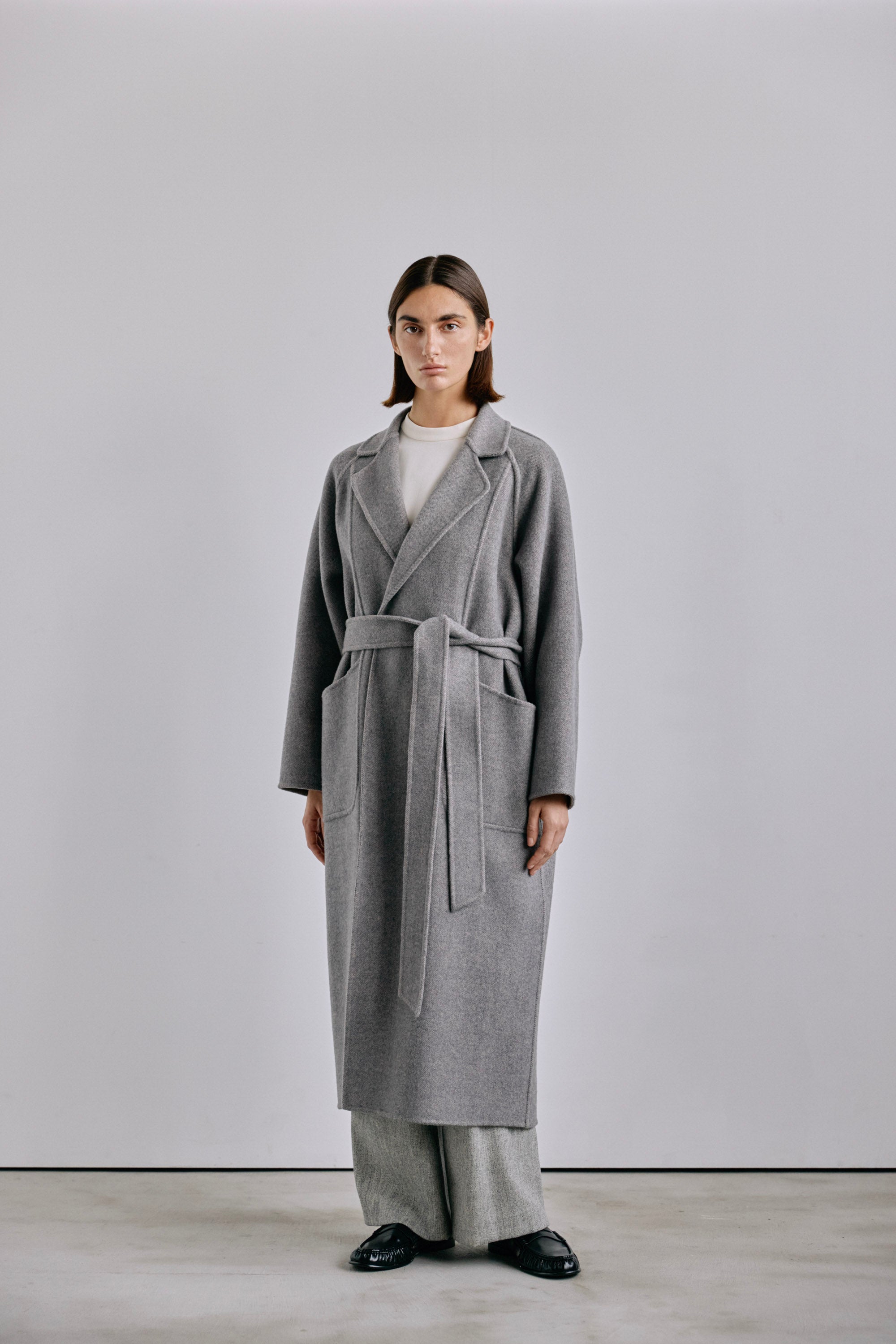 冬の定番グレーを、ミニマルかつ構築的なシルエットでモダンにアップデート。ウエストマークしたロングコートは、ガウンのように羽織るだけで凛とした佇まいを叶えます。