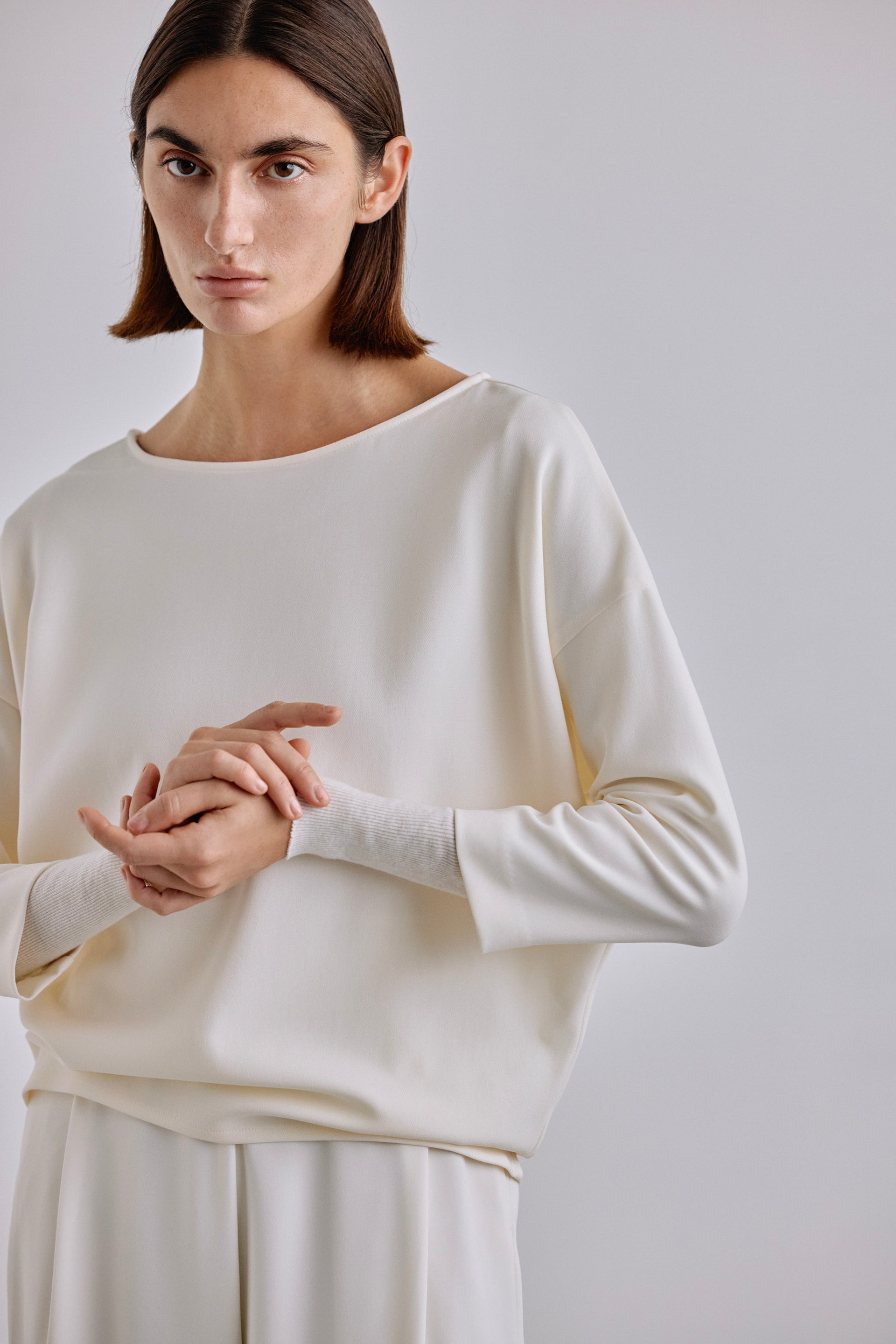 クリーンなホワイトのプルオーバーとパンツで構成された、潔いワントーンルック。ドロップショルダーのリラックスしたシルエットが、今の気分を反映しています。