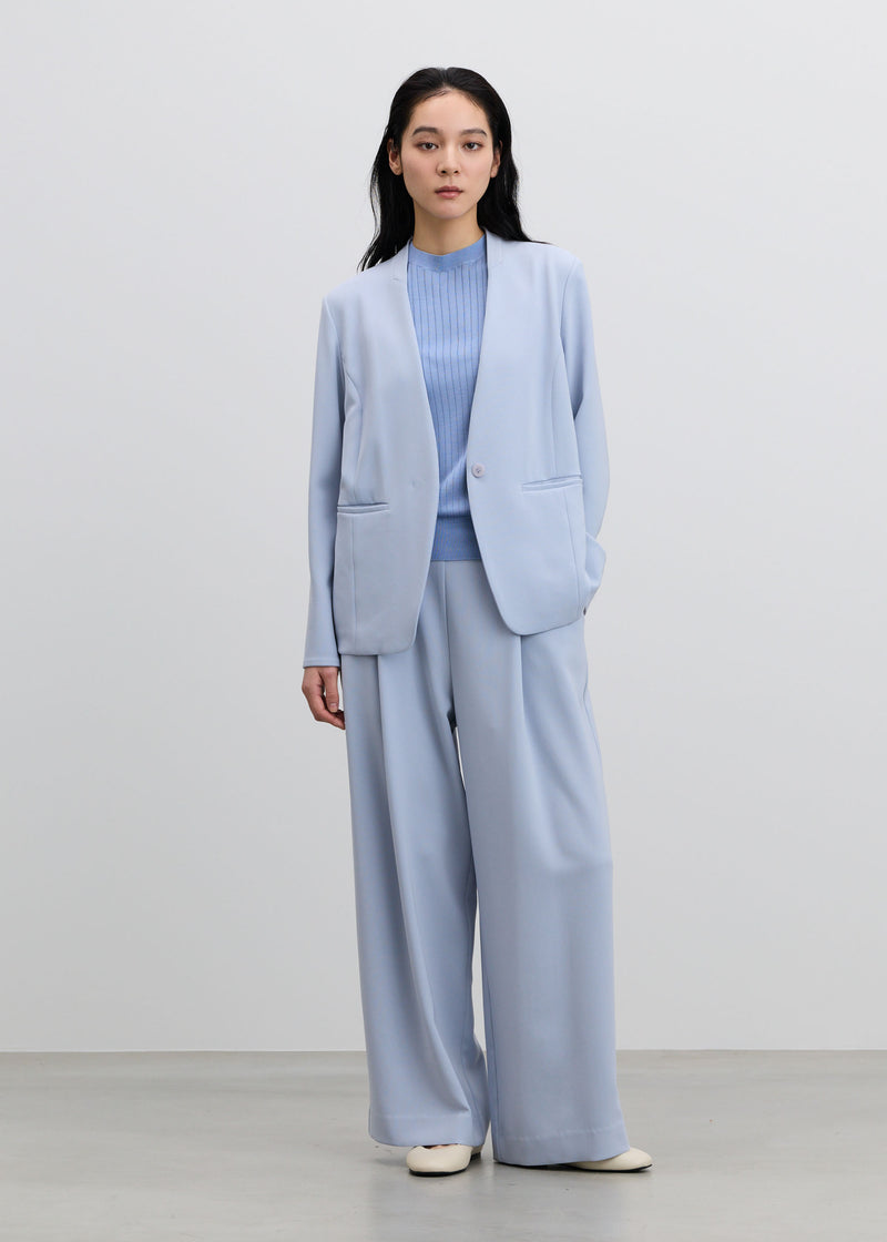 おすすめの着回しは、ソージュの同素材シリーズとのセットアップ。ジャケットのカラーをワイドパンツと合わせて、オフィスシーンなどきちんとした場面にも対応できるスタイリングに。