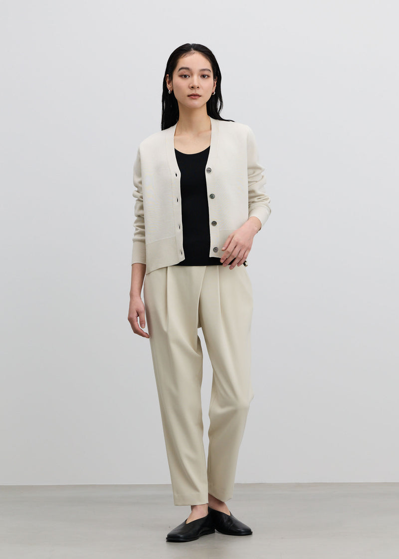 ソージュ定番のタックパンツと同仕様のデザイン。程よくゆとりがありながら足首に向かって細くなるテーパードシルエットにフロント部分の斜めに入ったタックデザイン、バックウエスト部分はゴムにするなど、細部までこだわりました。