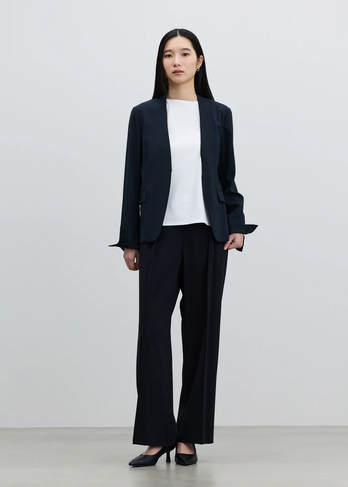 同シリーズのノーカラージャケットと合わせた、ネイビーのセットアップスタイル。インナーにホワイトのニットソーを入れて、クリーンに仕上げて。颯爽とした空気感が好印象です。
