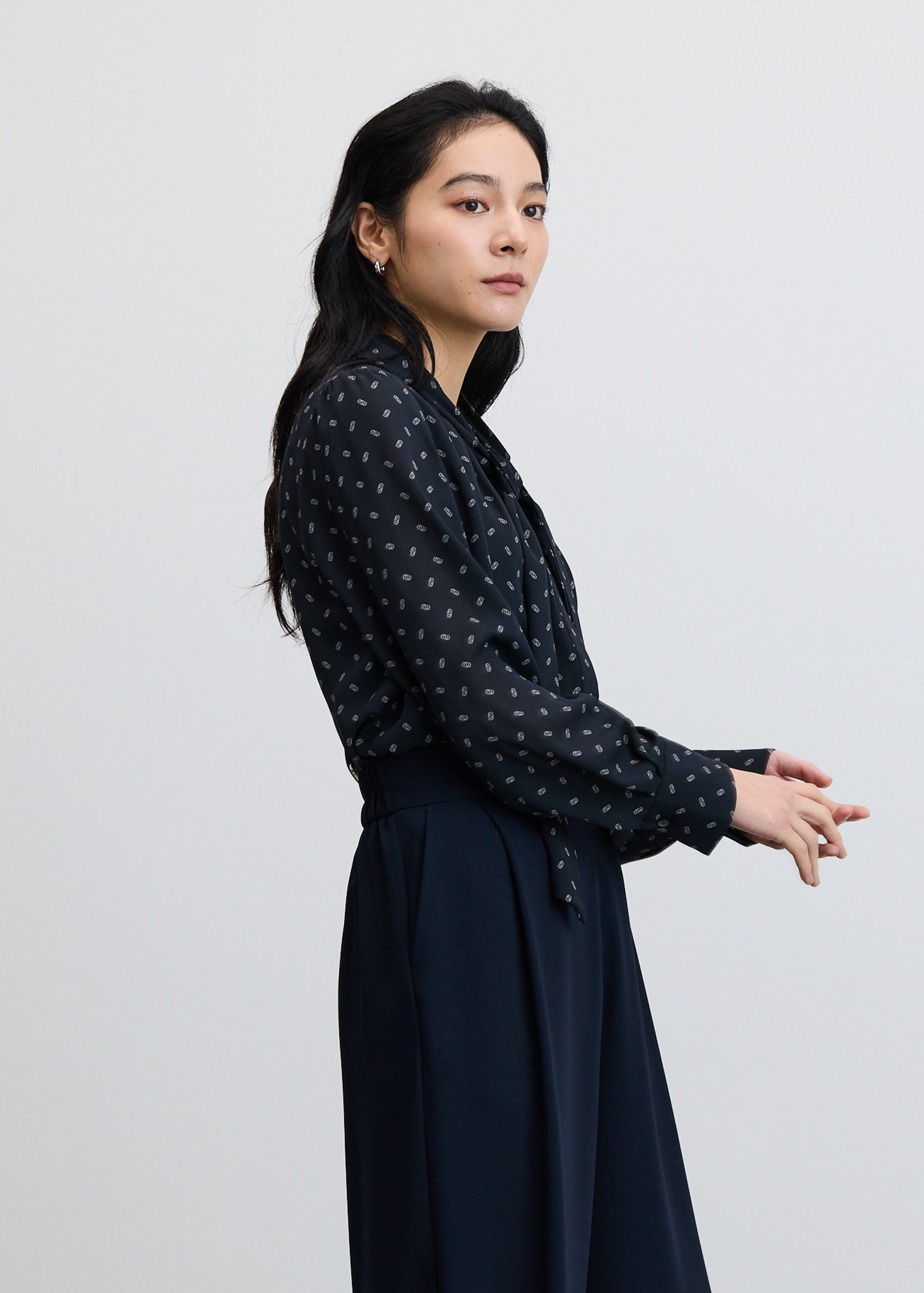 ふんわり軽やかな生地の特徴を活かし、スカーフはボウタイブラウスに比べて幅をやや太めに。結んでも垂らしても、スカーフが程よい存在感を示します。