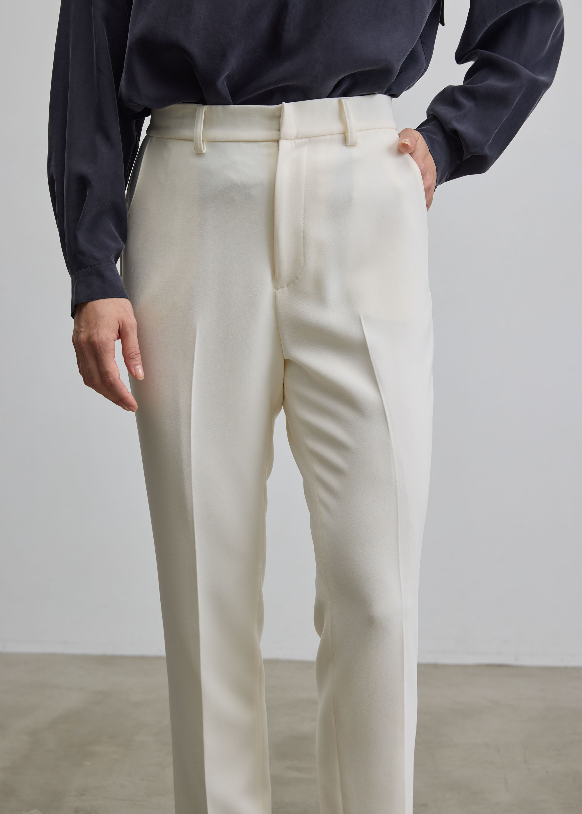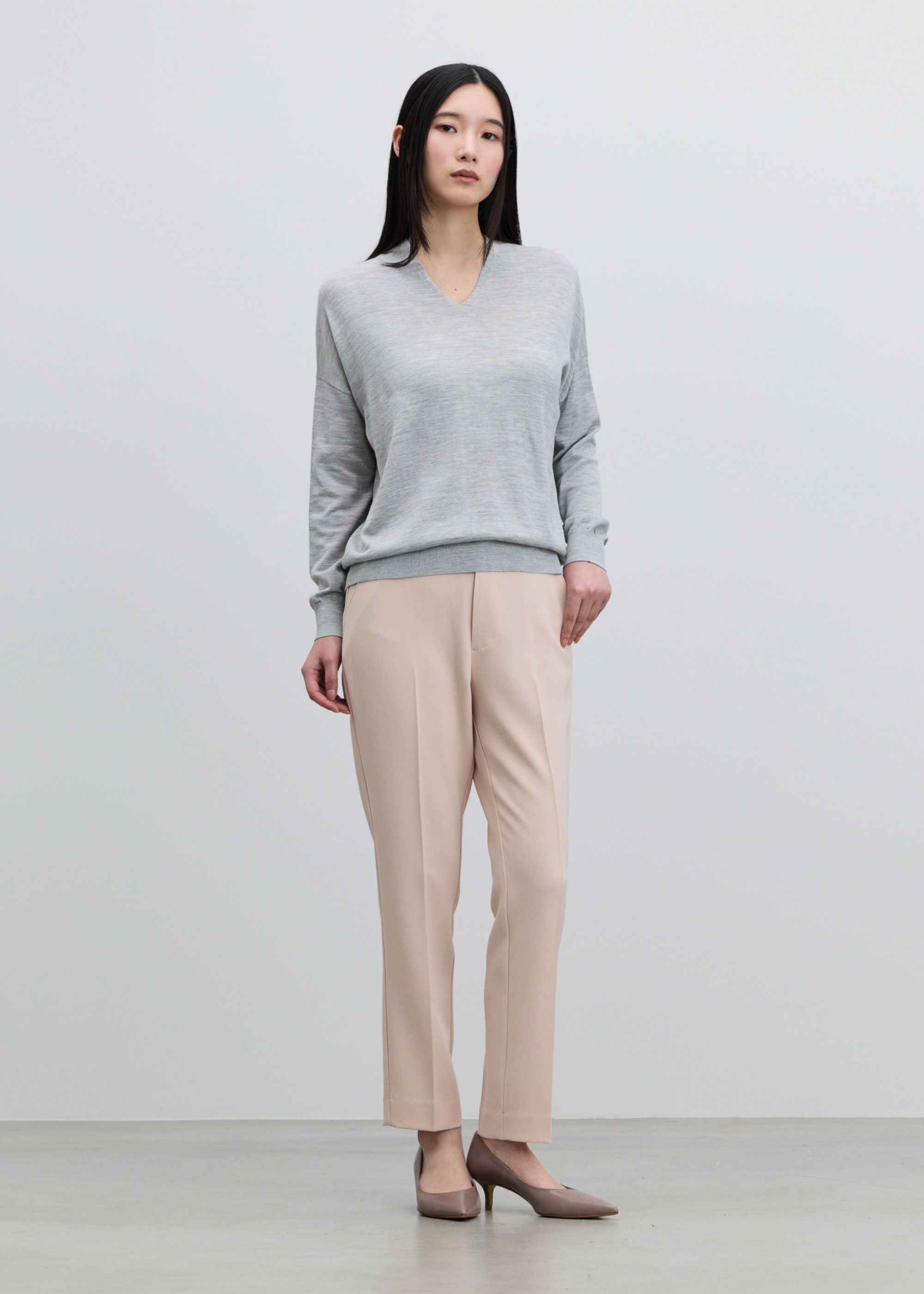 同生地のコクーンブラウスと合わせてジャケットレスなきちんとスタイルを、ノーカラージャケットと合わせてスーツとしても着用いただけます。カジュアルダウンした着こなしもおすすめで、オンオフ問わず着回しできる万能な一本です。
