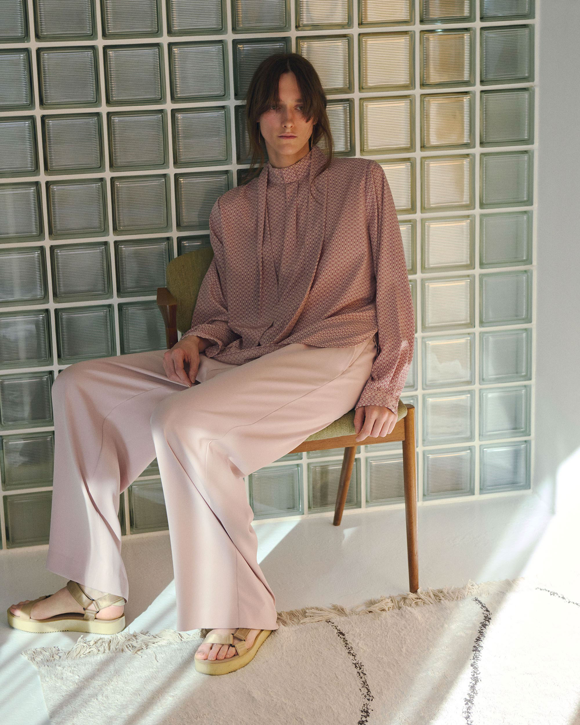 まず、立ち襟という形。日本では格式の高い場では襟元を詰めた服装を選ぶ方が多いことも考慮に入れ、ブラウス一枚でフォーマルな雰囲気を出せるようにしました。その際、ハイネックが苦手と感じる方でも襟周りが苦しくならないよう、首周りにはややゆとりをプラス。
