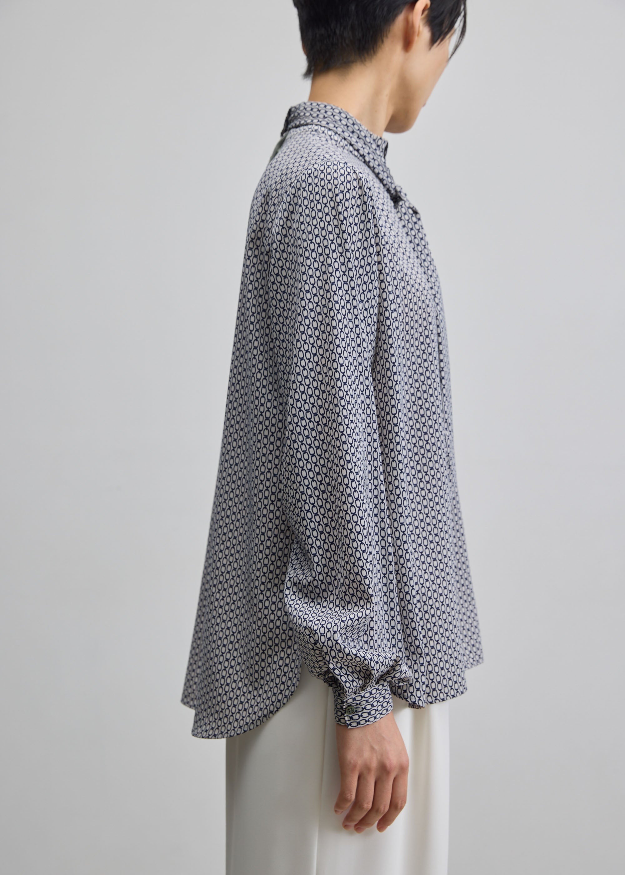 華やかでありながら、シンプルで上品なプリント柄ブラウスに仕立てるため、ブラウス自体のデザインは「クラシカルであること」にこだわりました。