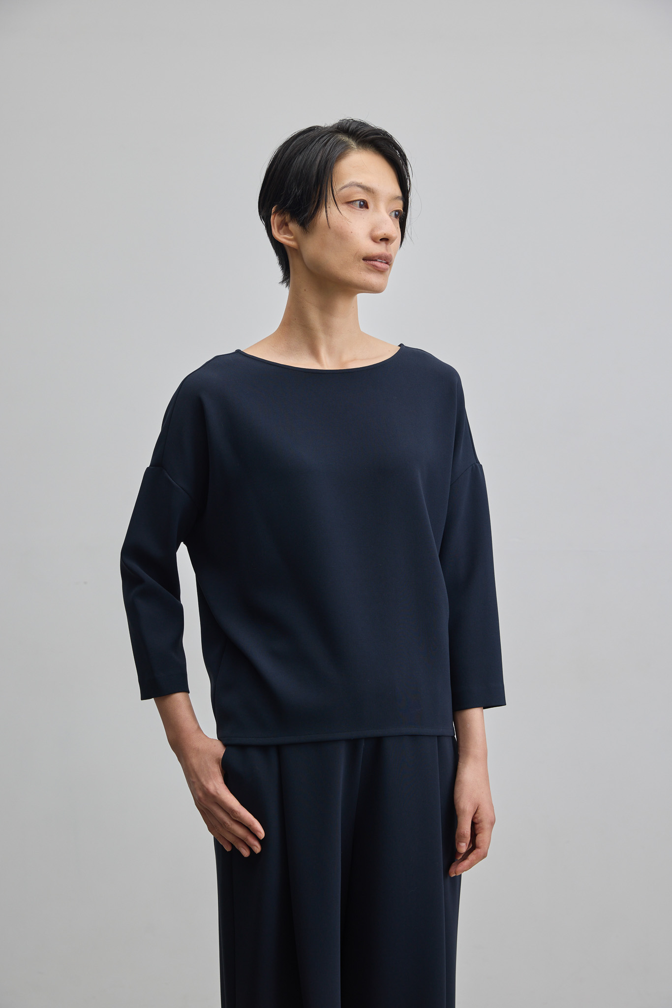 華やかな生地とシルエットで、一枚でサマになるのはもちろん、ジャケットなどのアウターを羽織る際にも袖がもたつかない少しタイト目の開きのアームホールもポイント。サイドタックワイドパンツやプリーツスカートとも好相性でボトムスを選ばず日々の装いをお楽しみいただけます。