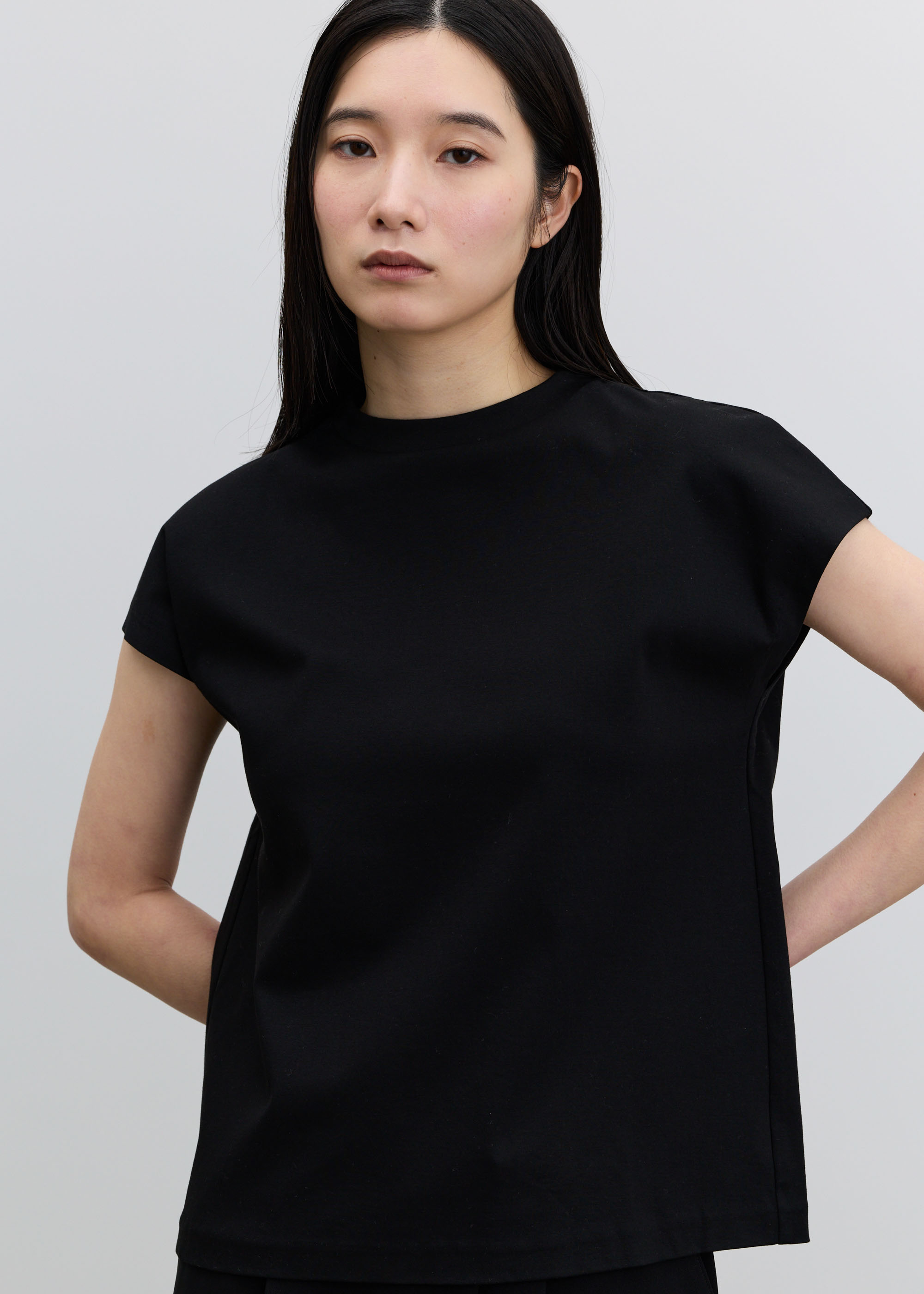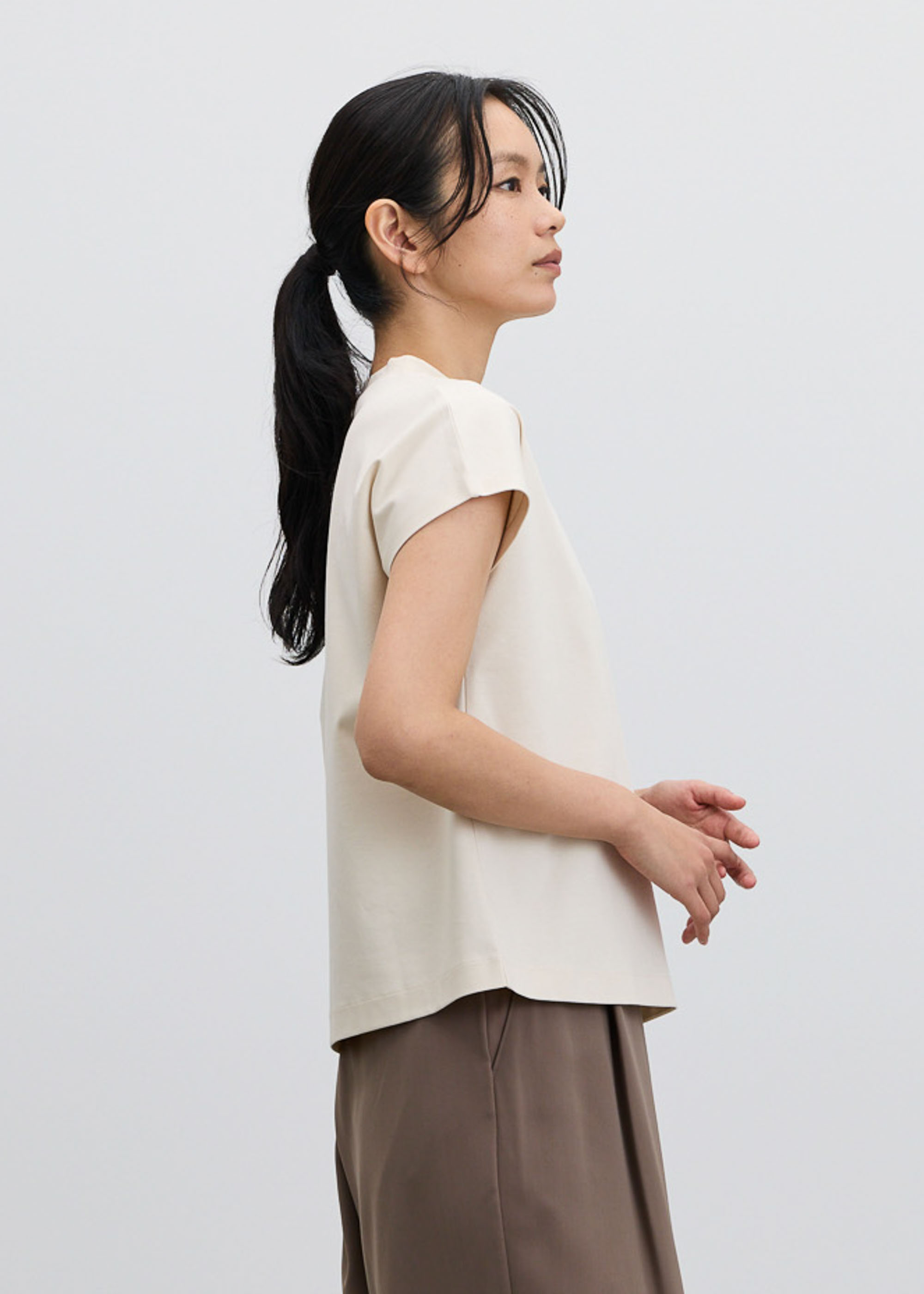 ほどよく詰まった首元、気になる二の腕をきれいに見える短めの袖などデザインにもこだわりました。一枚ではもちろん、ノーカラージャケットなどのインナーにもぴったりで、オンオフ問わずに活躍します。