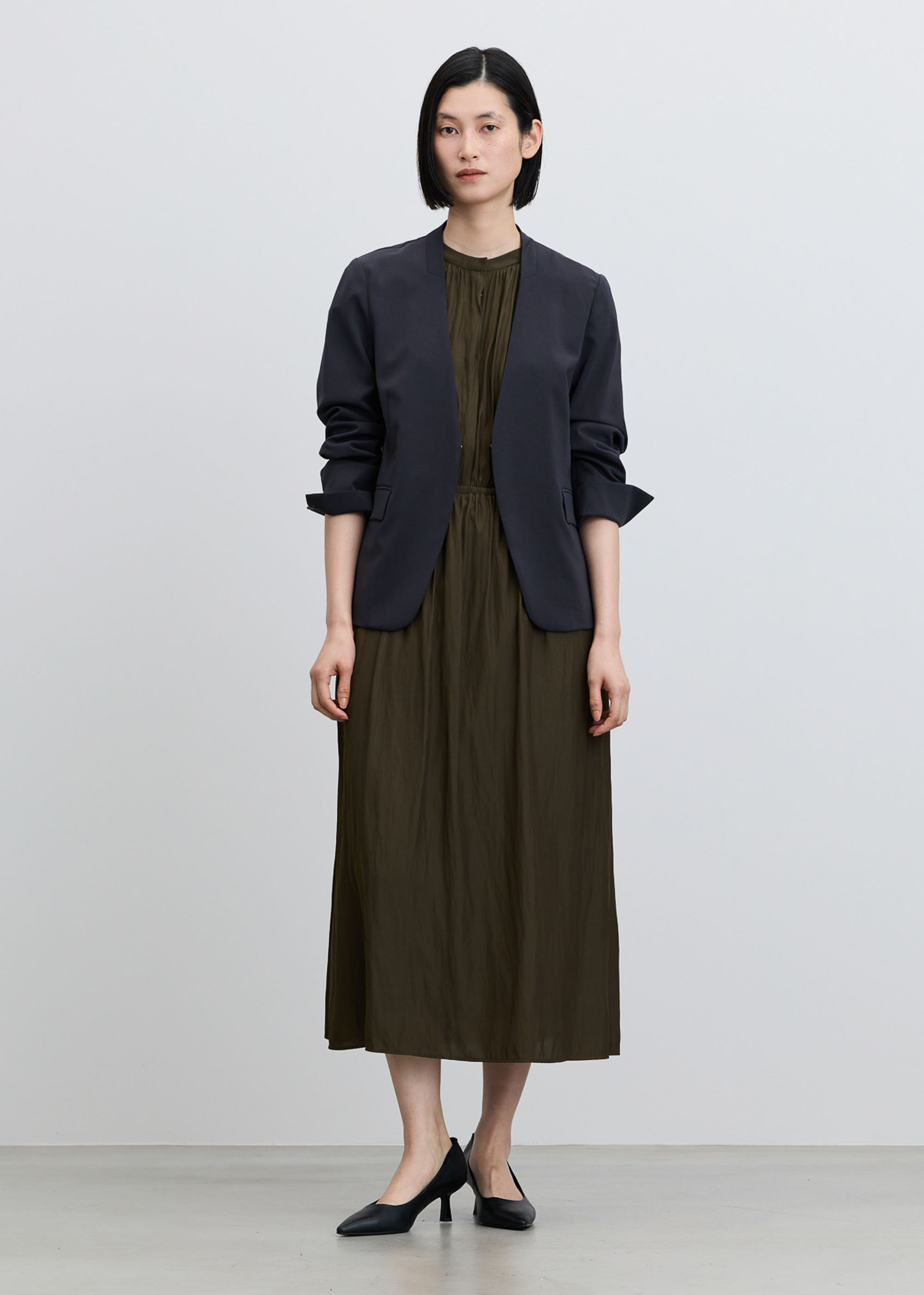 深いネイビーのジャケットを重ねたシックなオフィススタイル。胸元のギャザーやドレープの効果で、ノーアクセサリーでも表情豊かに見えます。袖を無造作にたくし上げると、ふっと肩の力が抜けたこなれ感ある装いに。