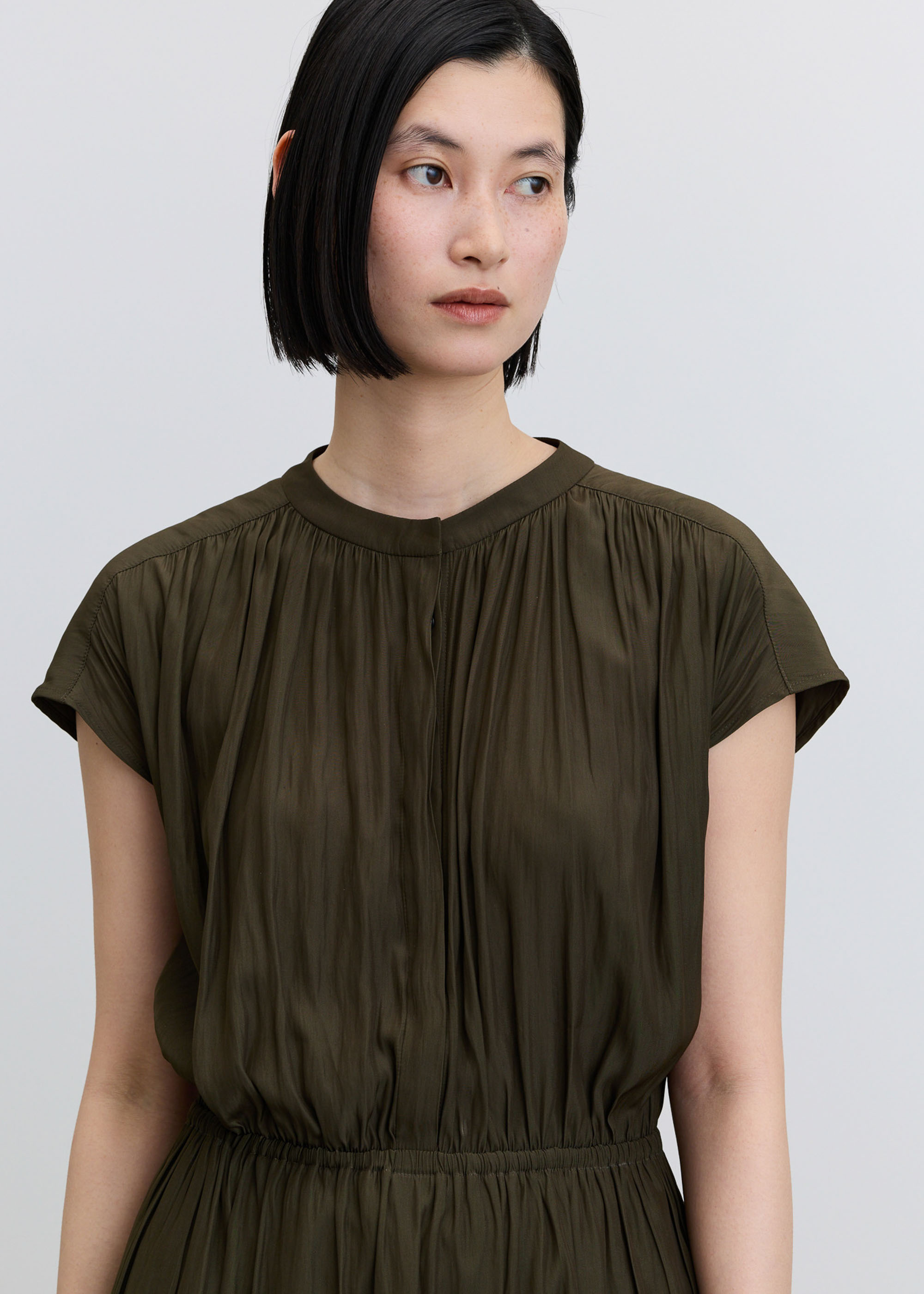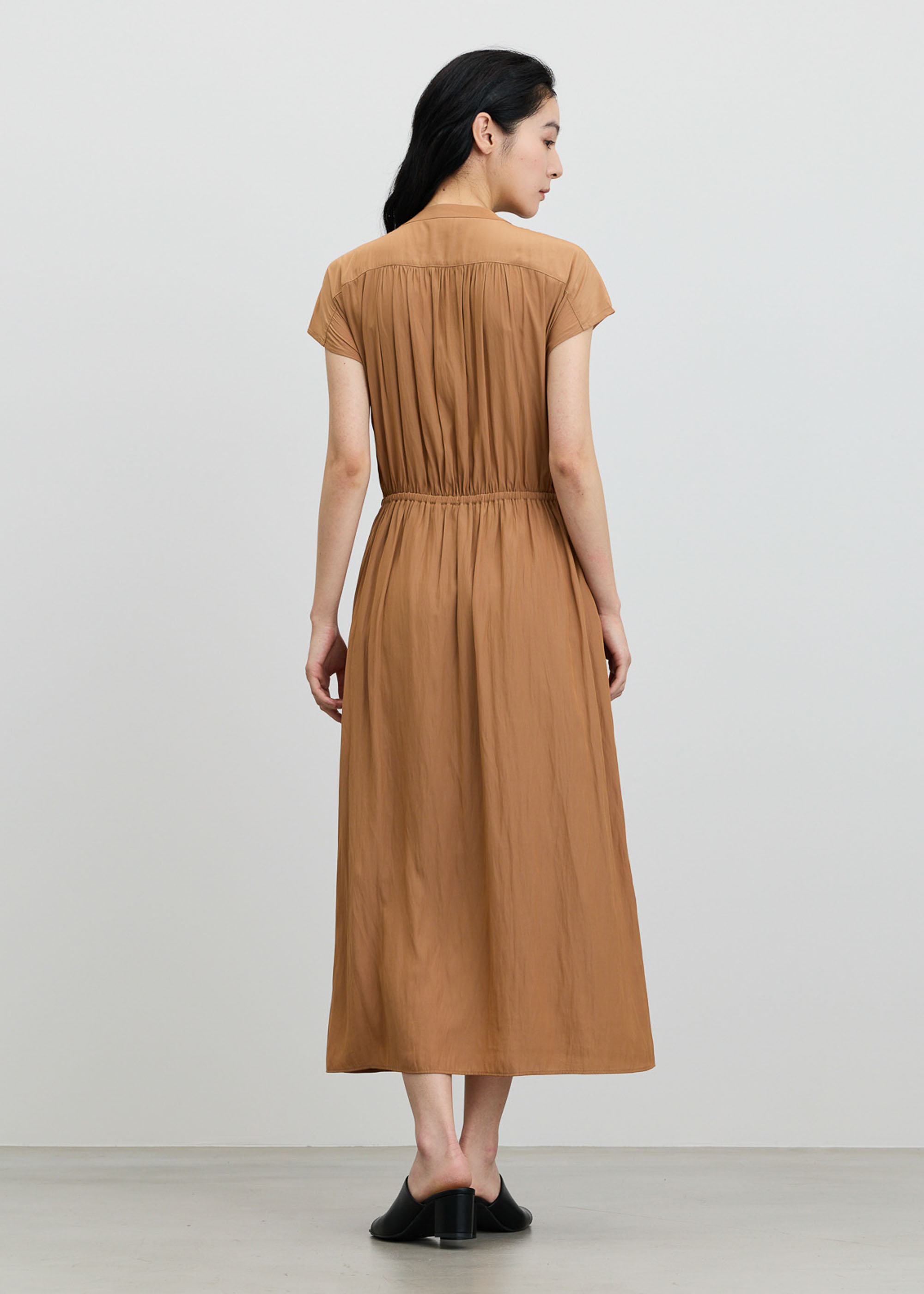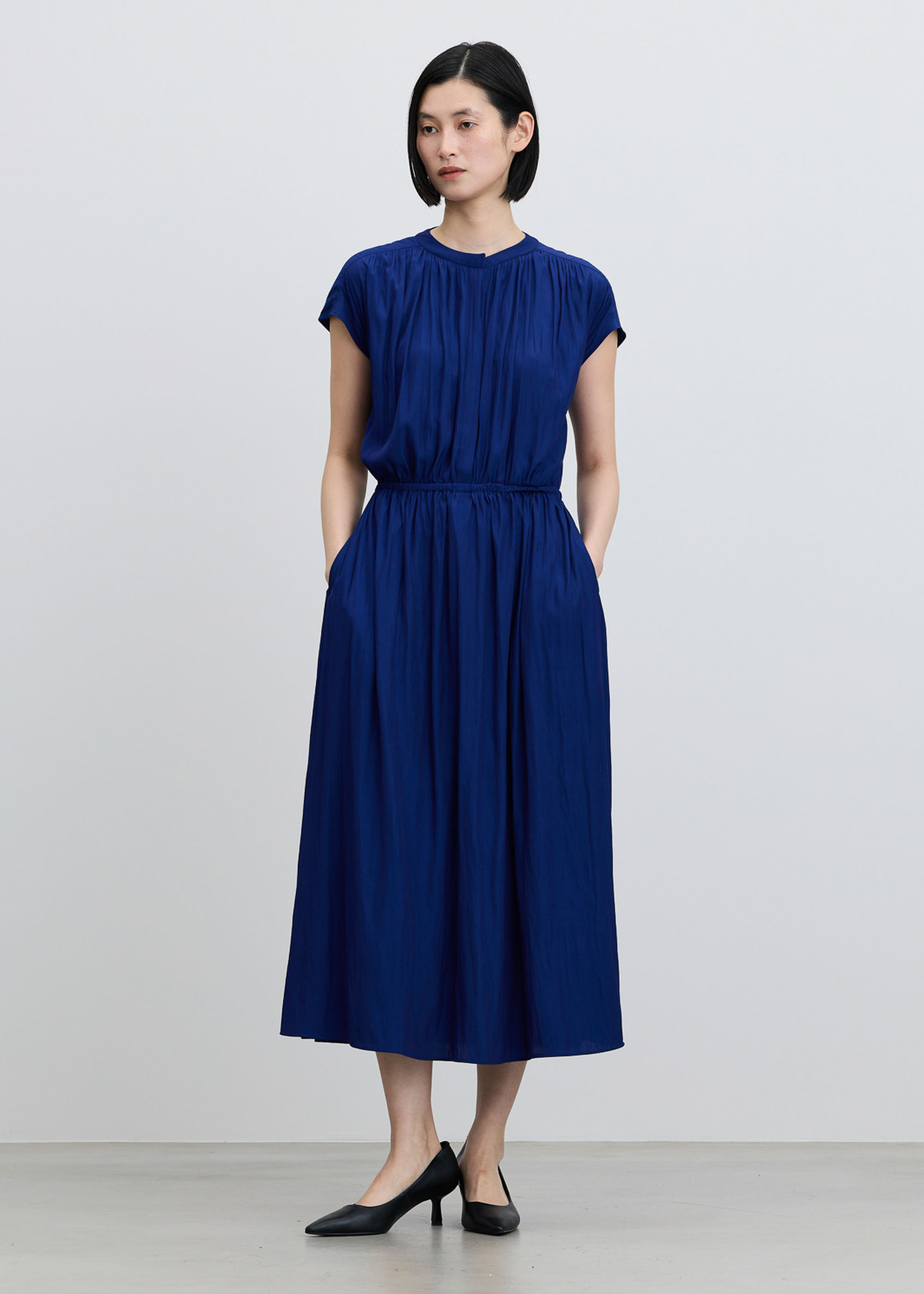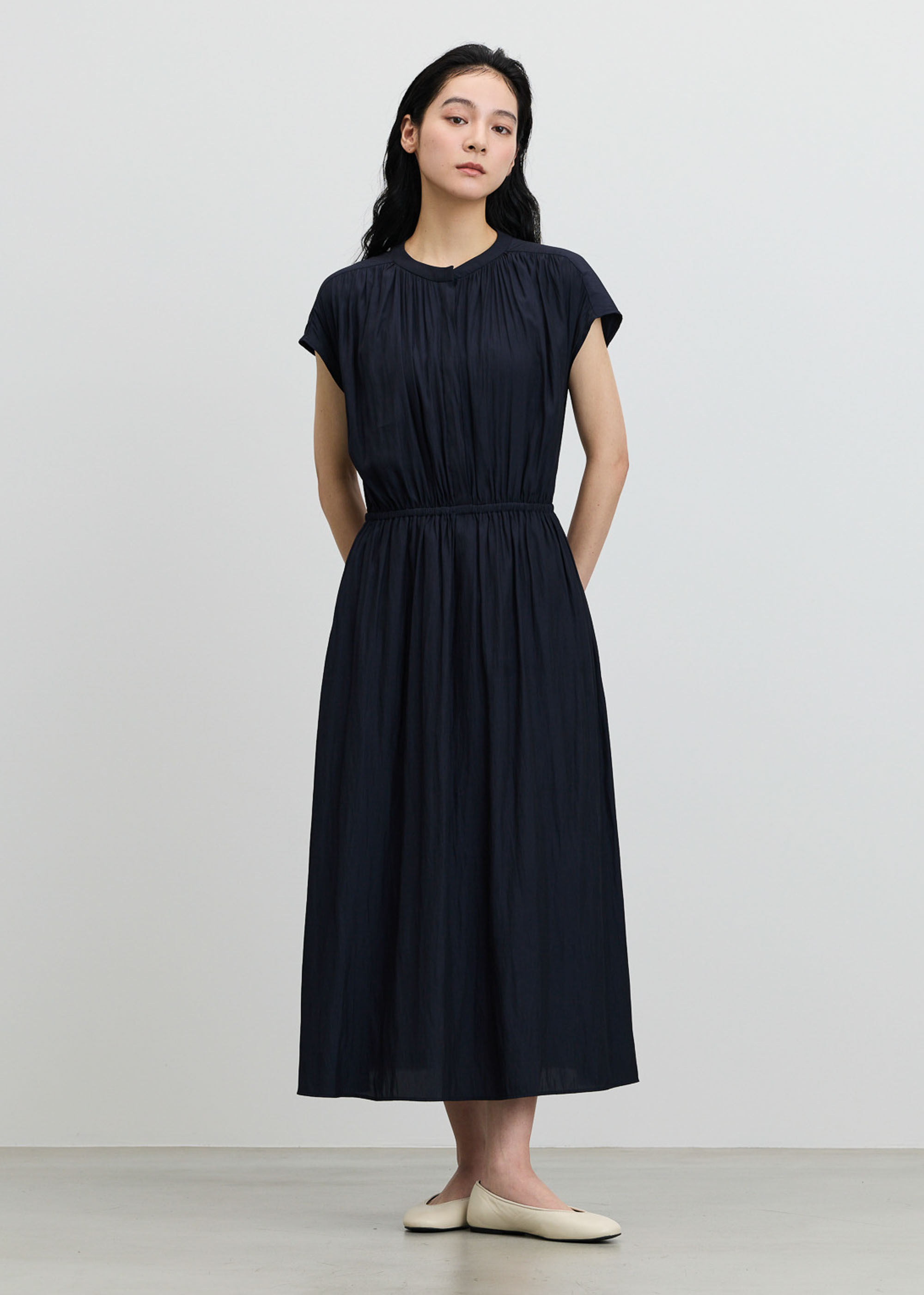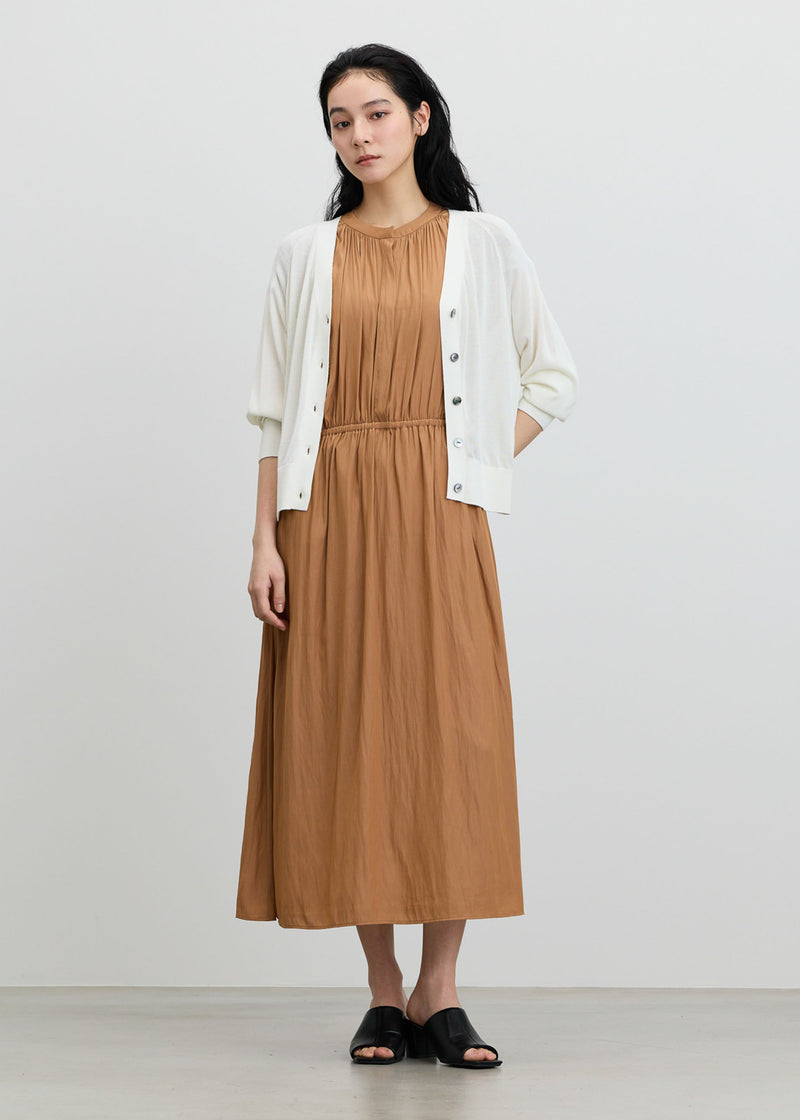 肌にさらりと軽やかに。一枚着もジャケットインも映えるデシンギャザーワンピース