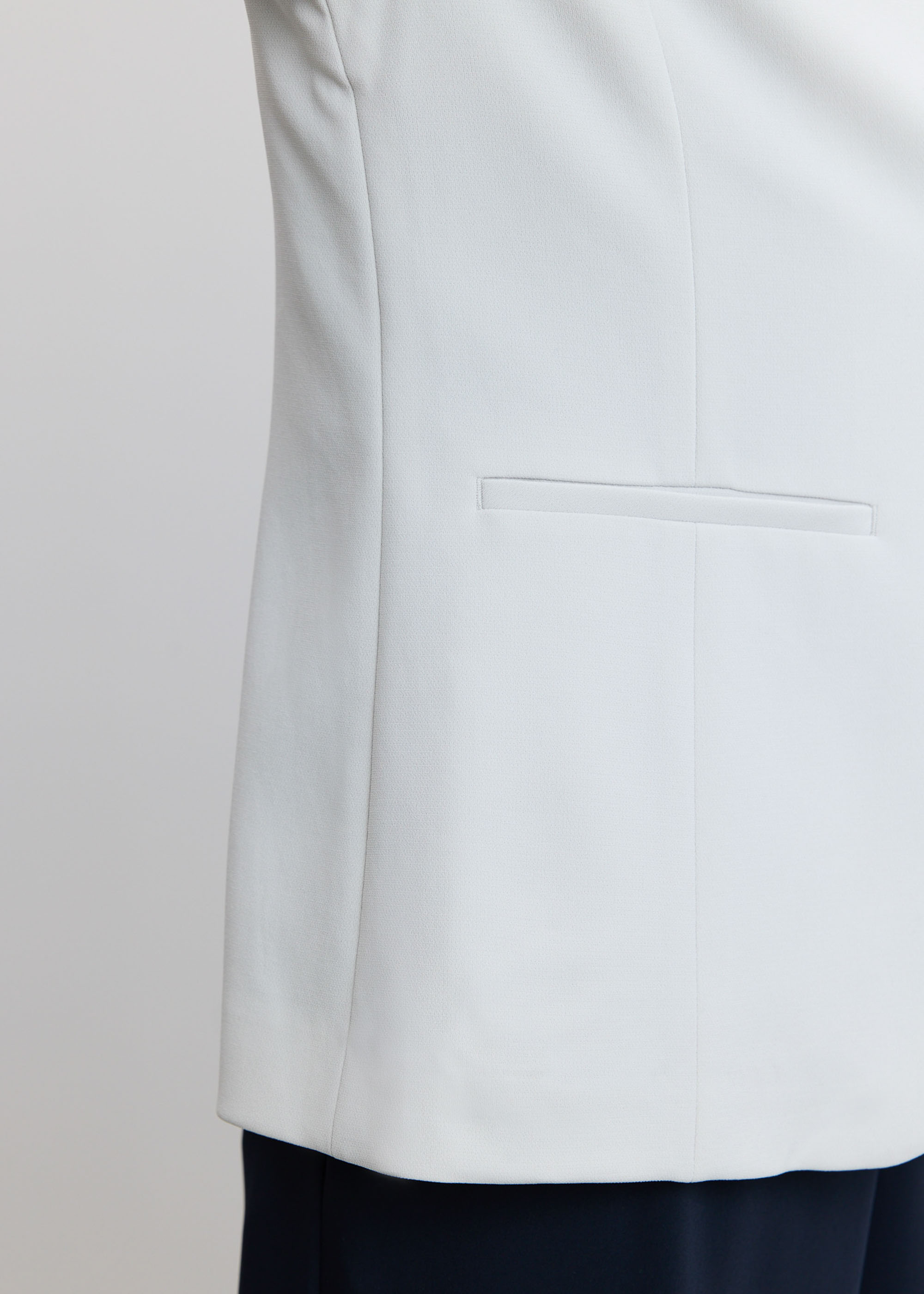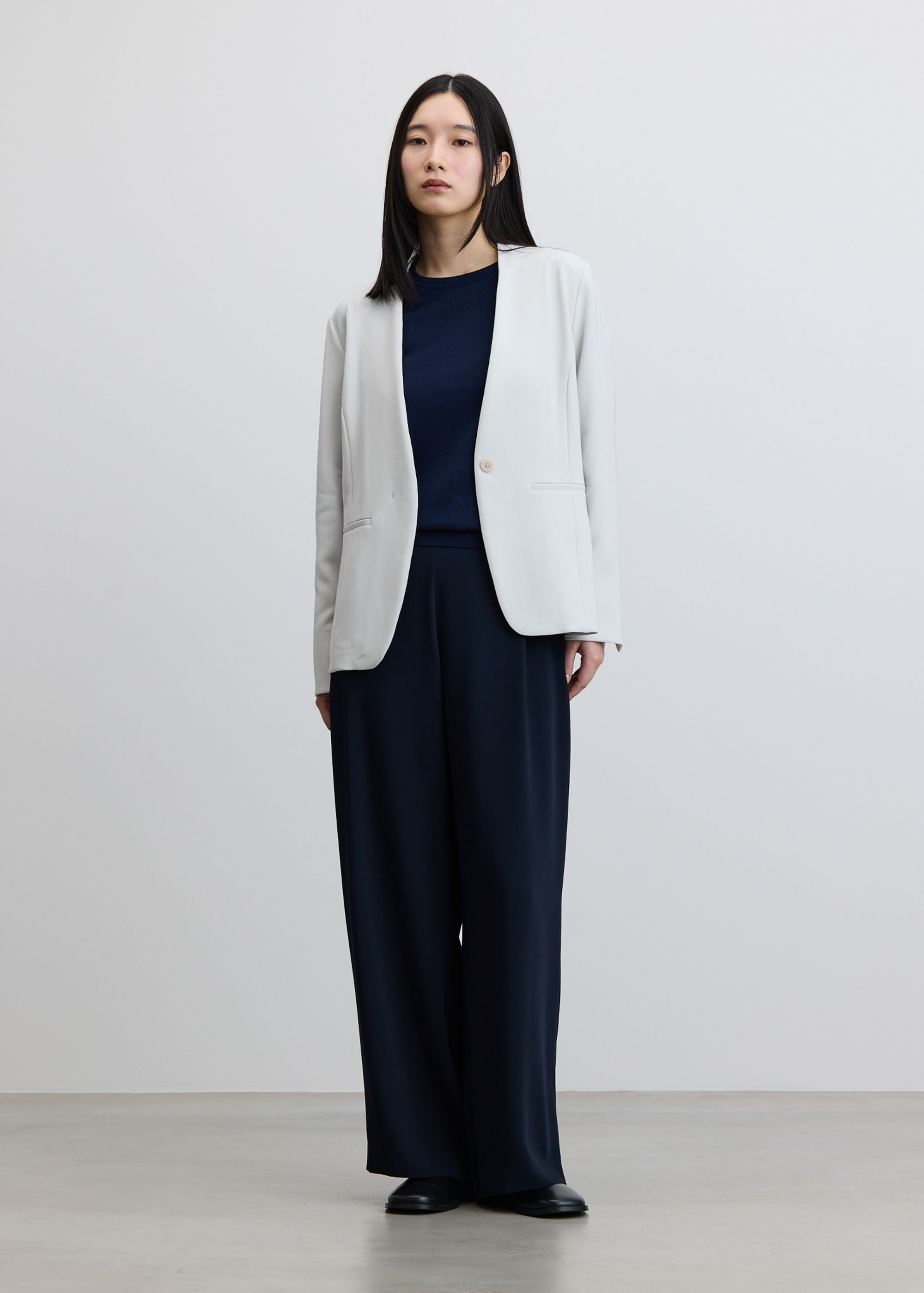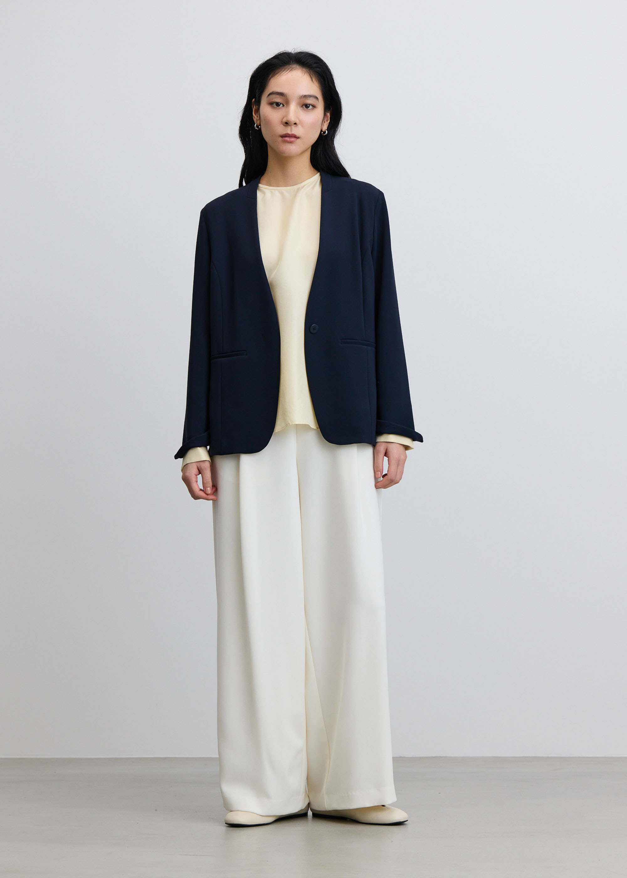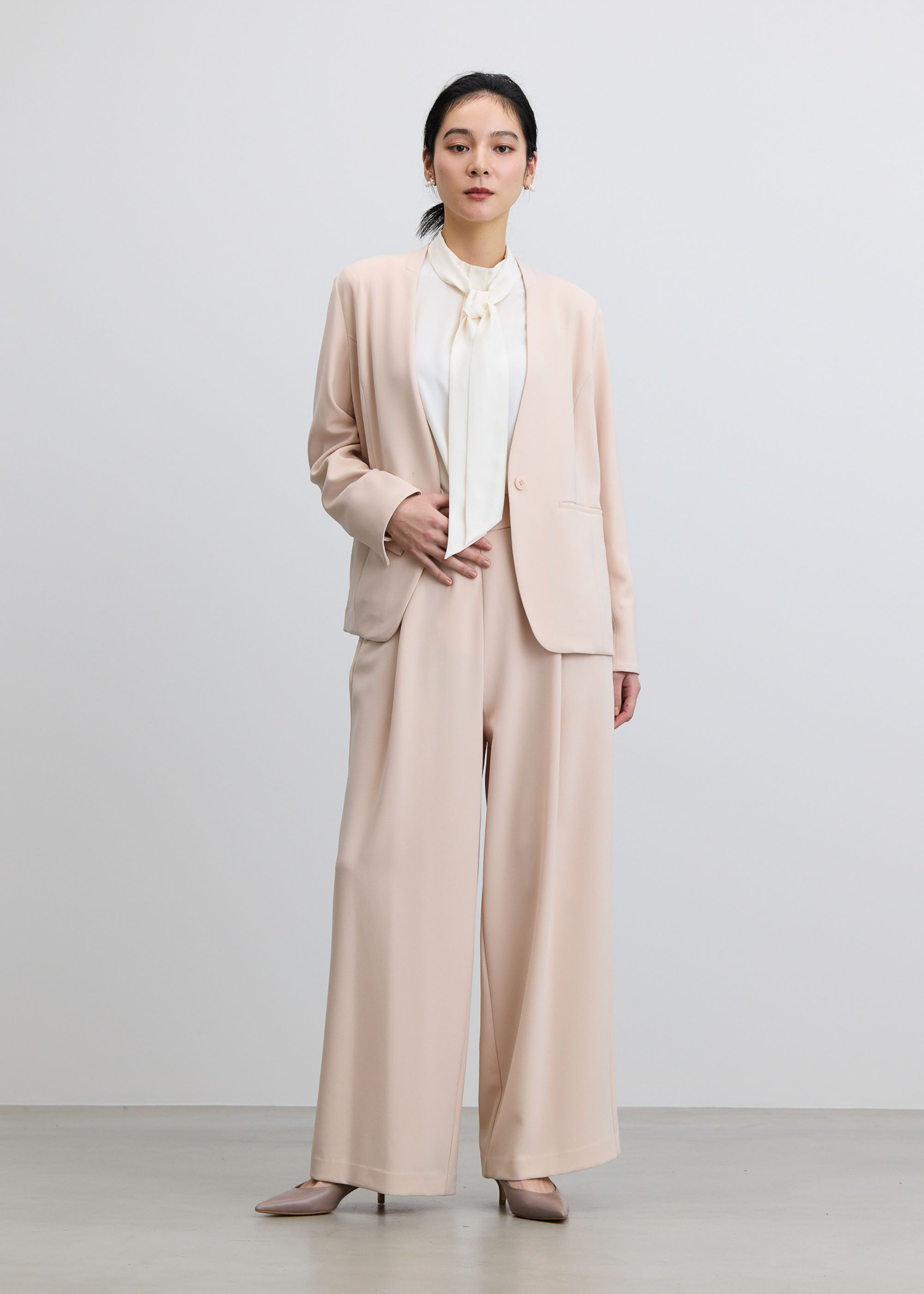 同素材のセンタープレスパンツやタイトスカートと合わせてスーツとしても、さらにインナーにコクーンブラウスを合わせて3pcsセットアップでの着用もおすすめです。