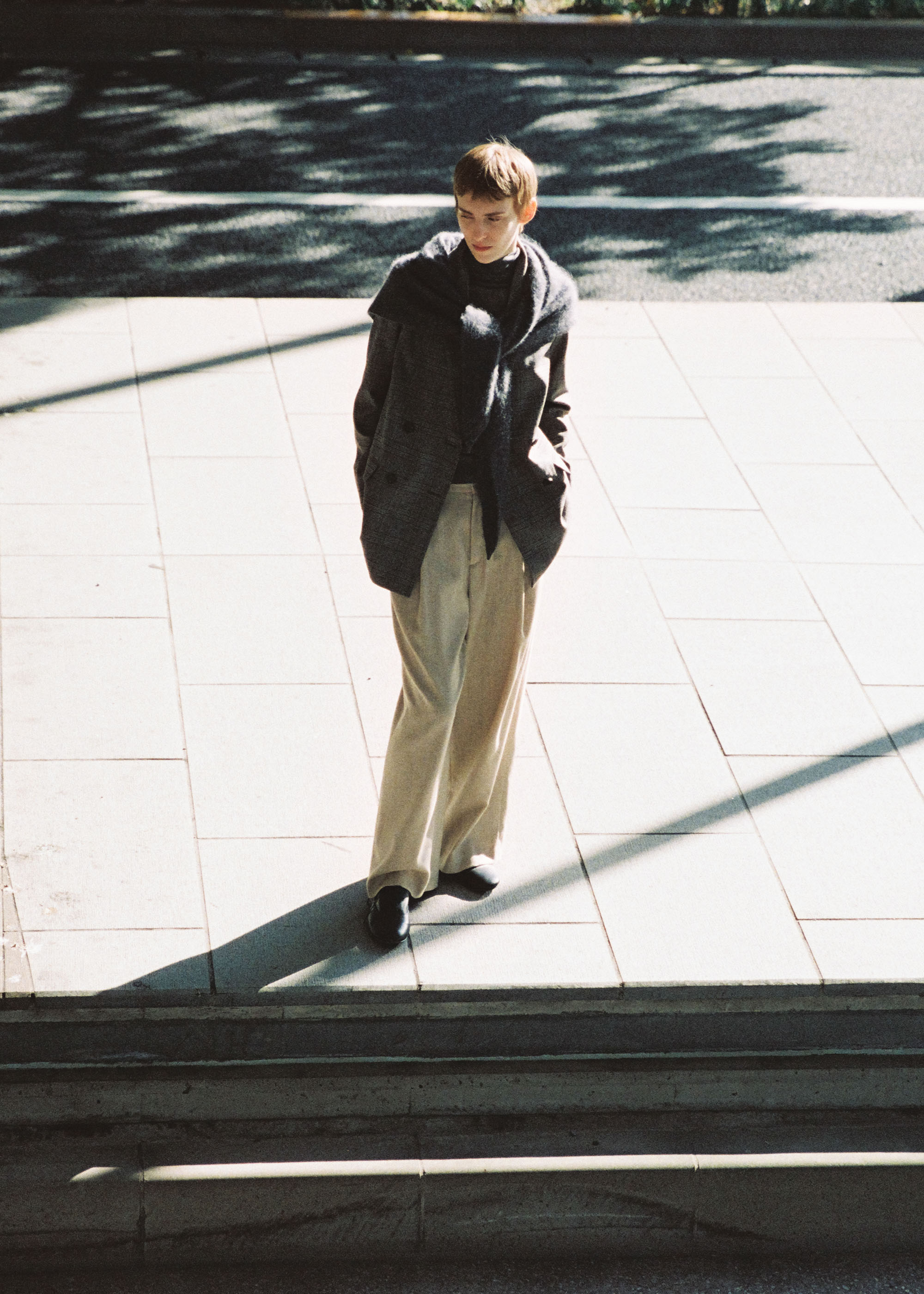 裾を広げ過ぎず腰から真っ直ぐ落ちるようにすることで、縦ラインが強調されるこのシルエットを、ヘリンボーンタックワイドパンツも踏襲しました。