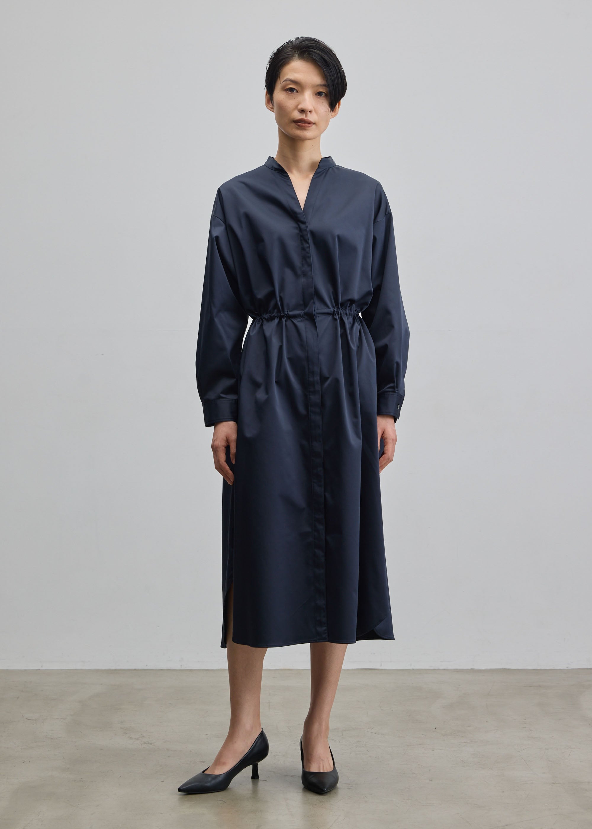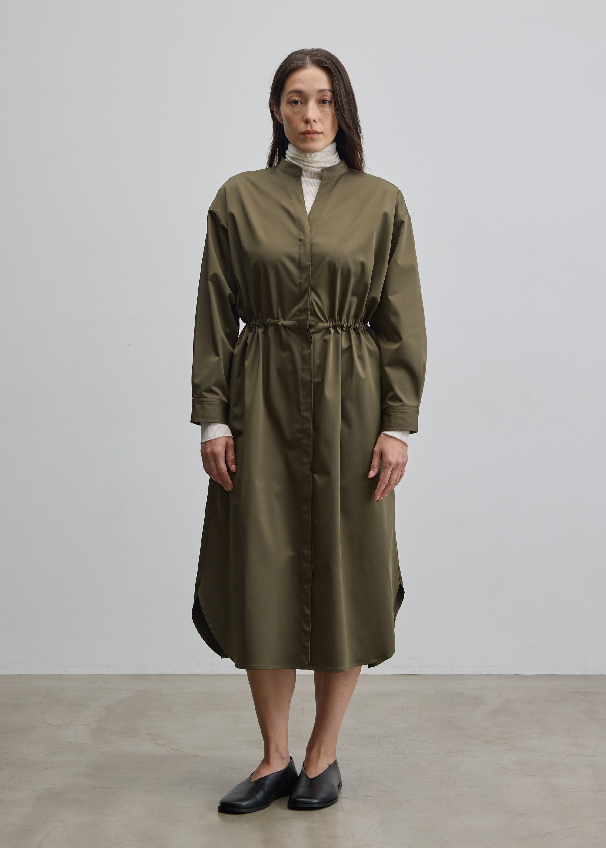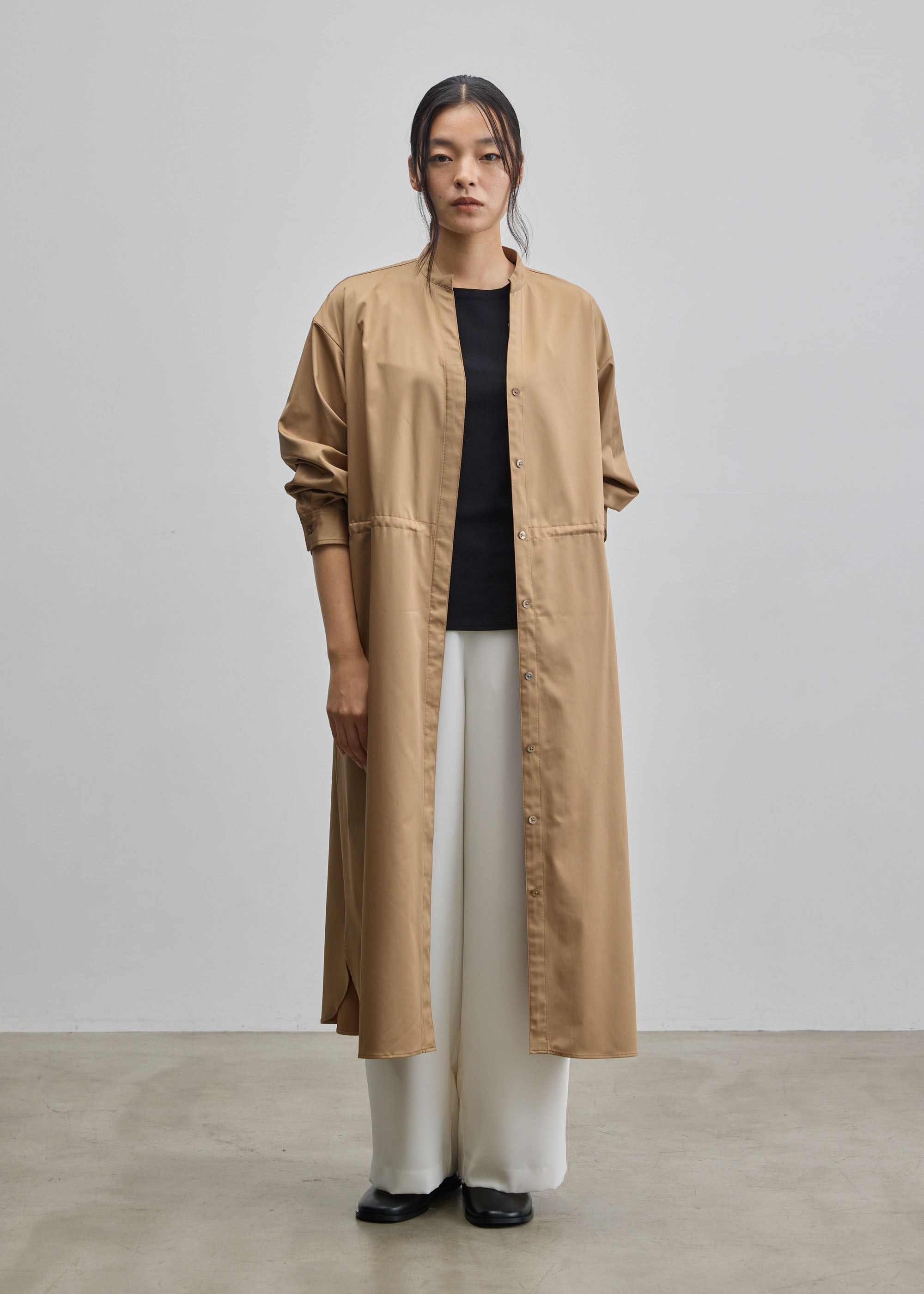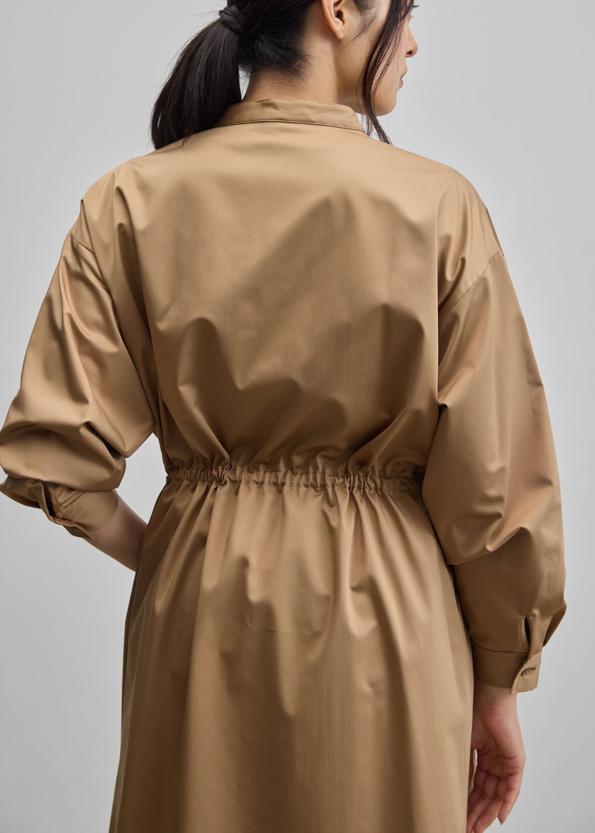 アウターとしてもワンピースとしても着られるよう、カフスと袖の切り替え部分にタックを2本入れました。袖全体がゆとりのある着用感になることで、薄手のカットソーだけでなく少し厚みのあるニットなど、幅広いアイテムを中に着用いただけます。