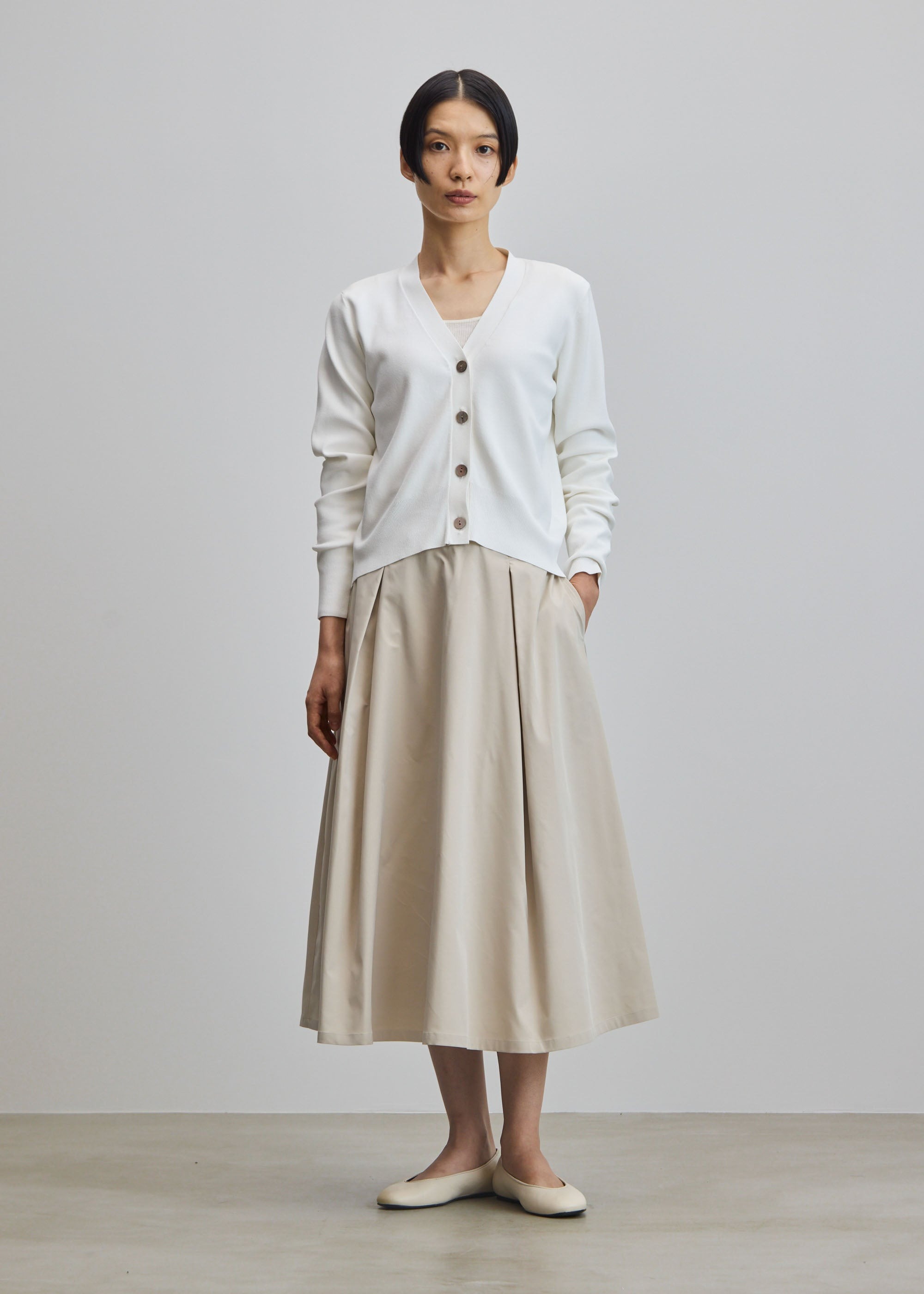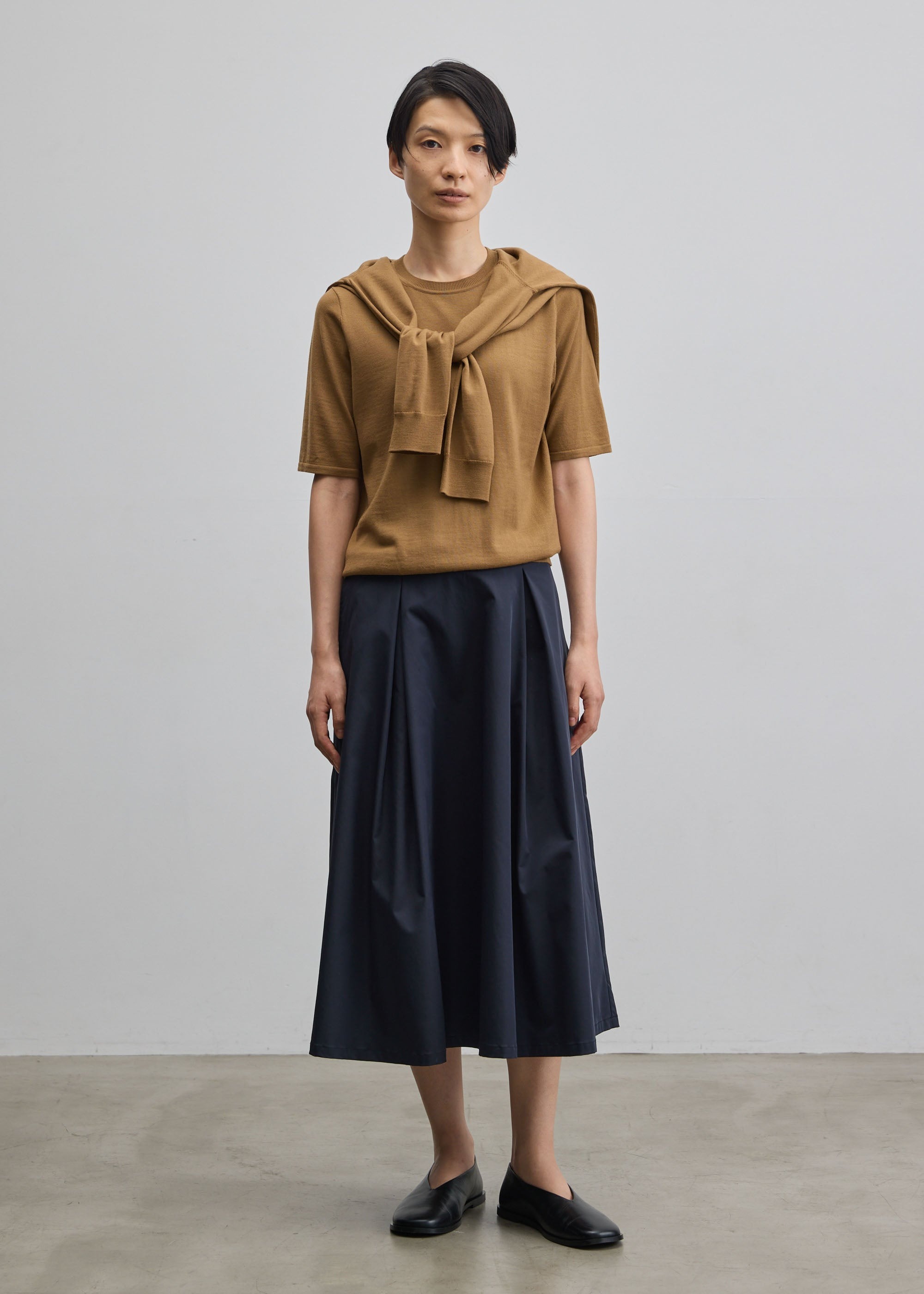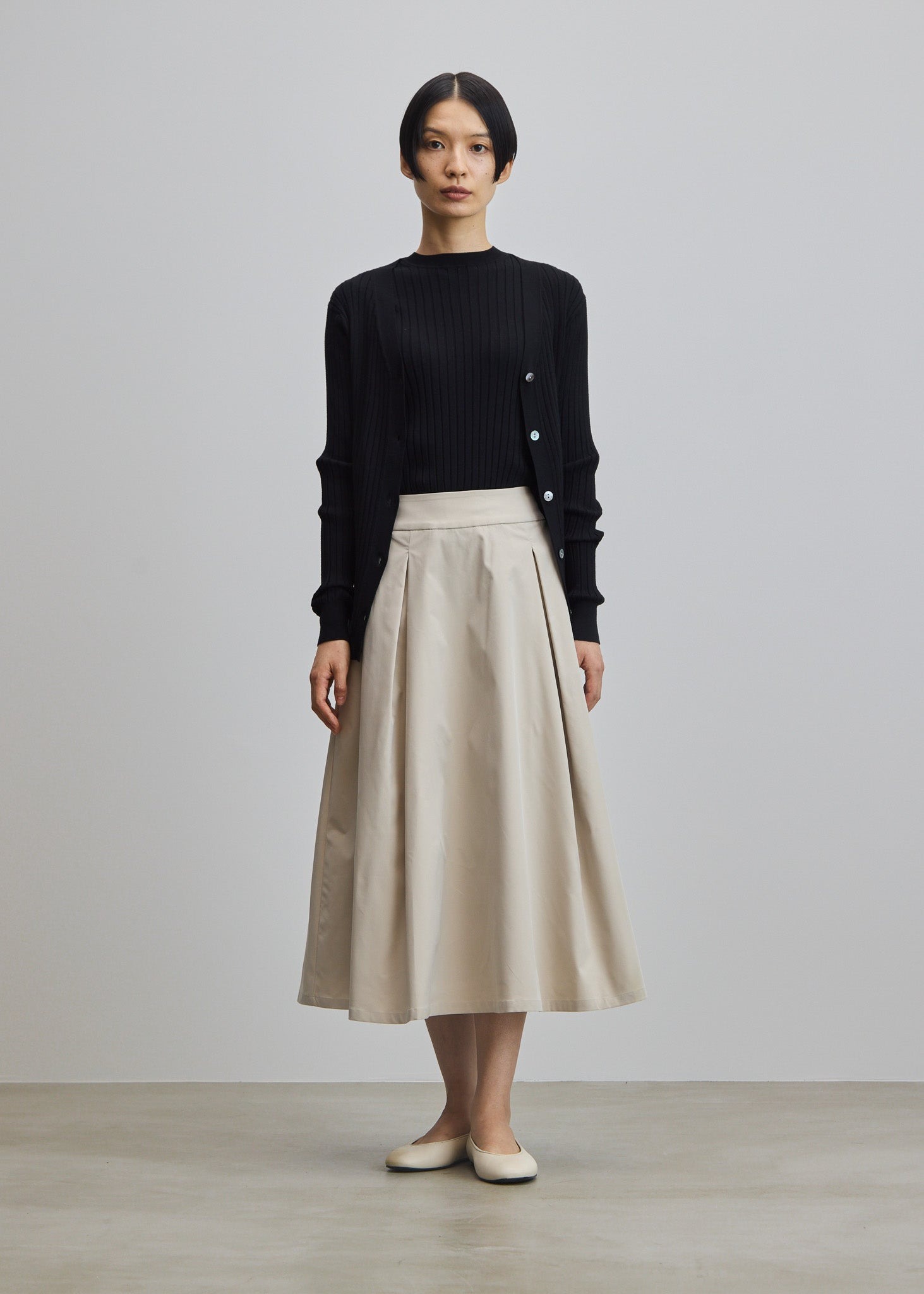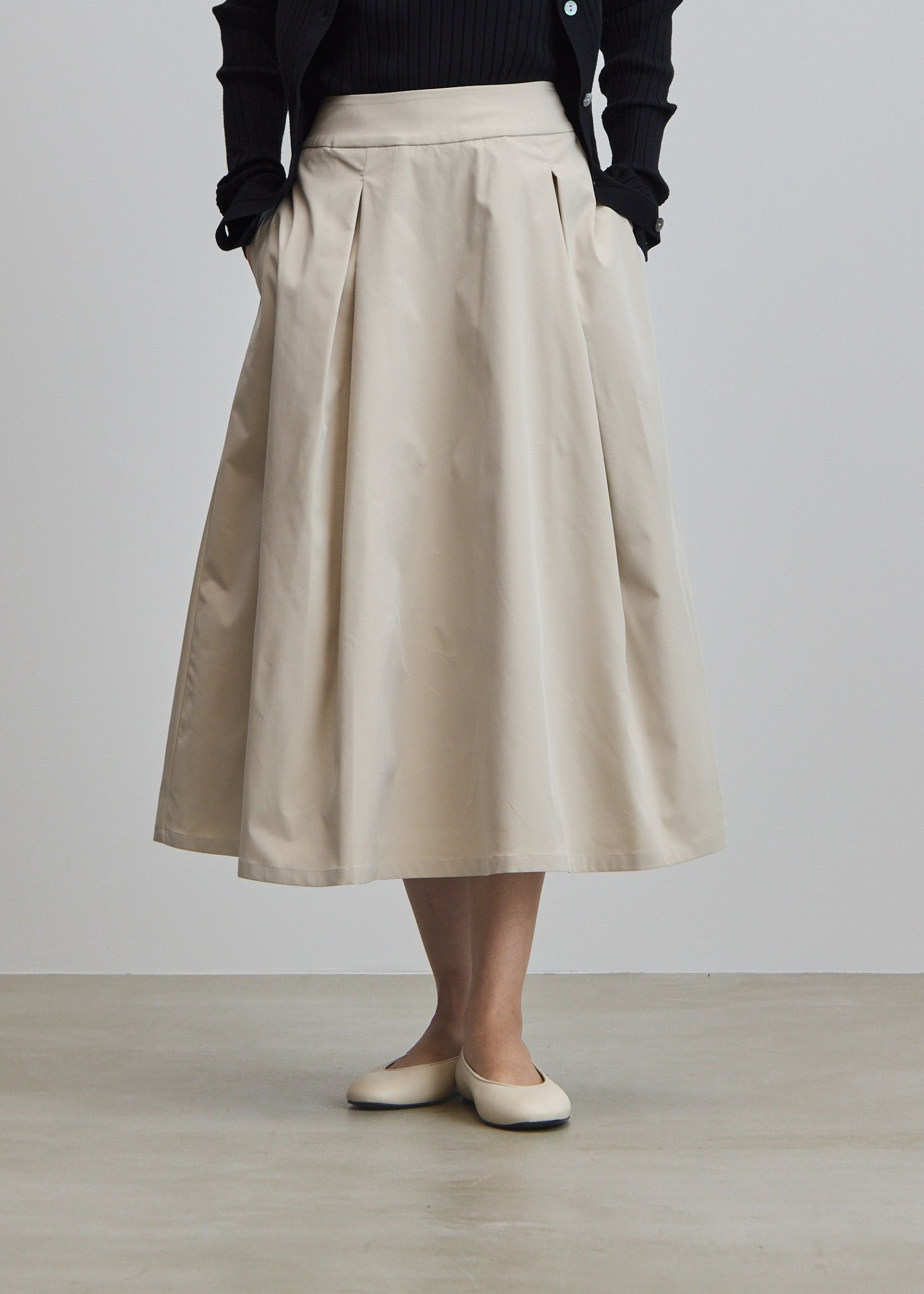光沢感のある生地を贅沢に使い、フワッとやわらかな動きを演出するタックスカート。ボリューム感がありながらも、スッキリとした印象で着用いただける一枚です。