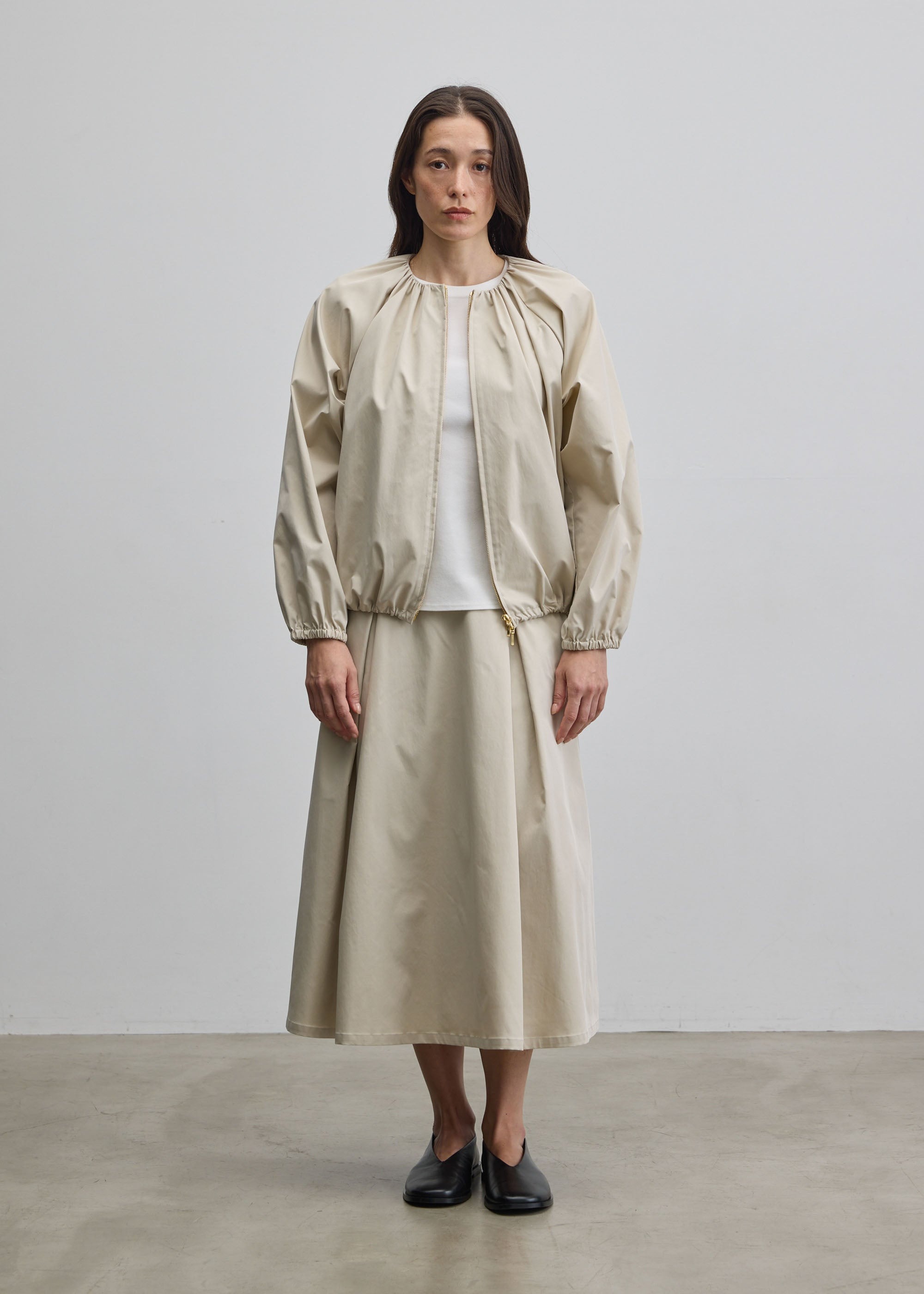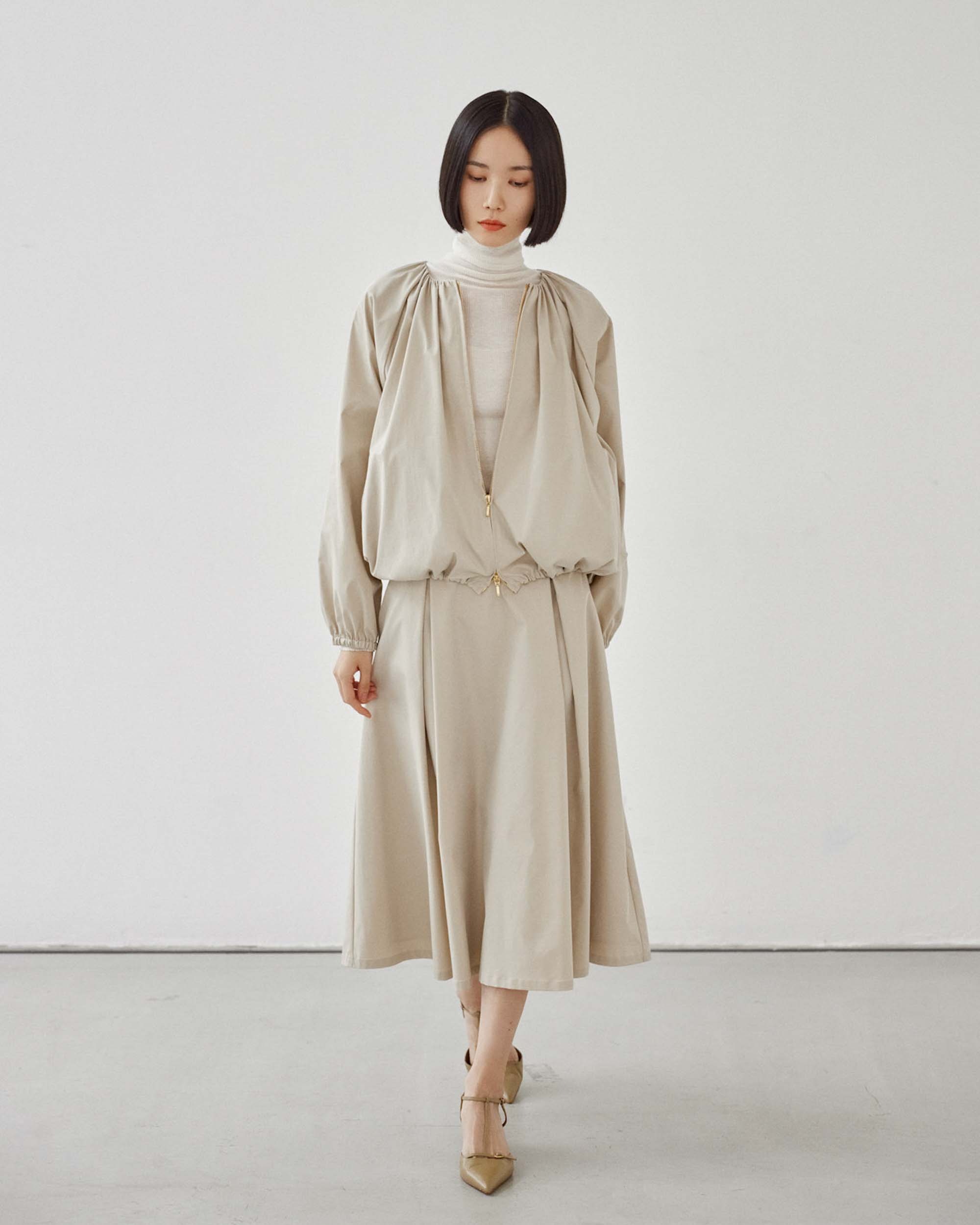 生地には控えめな光沢感が美しいリモンタ社の生地を使用。適度な張り感がありながらも 柔らかで心地よく体に馴染みます。また、はっ水加工*が施されているため、裾が汚れがちな天気が不安定な日に取り入れやすい一枚。汚れが付きにくいのも嬉しいポイントです。同生地のブルゾンや、ライトコートもおすすめです。