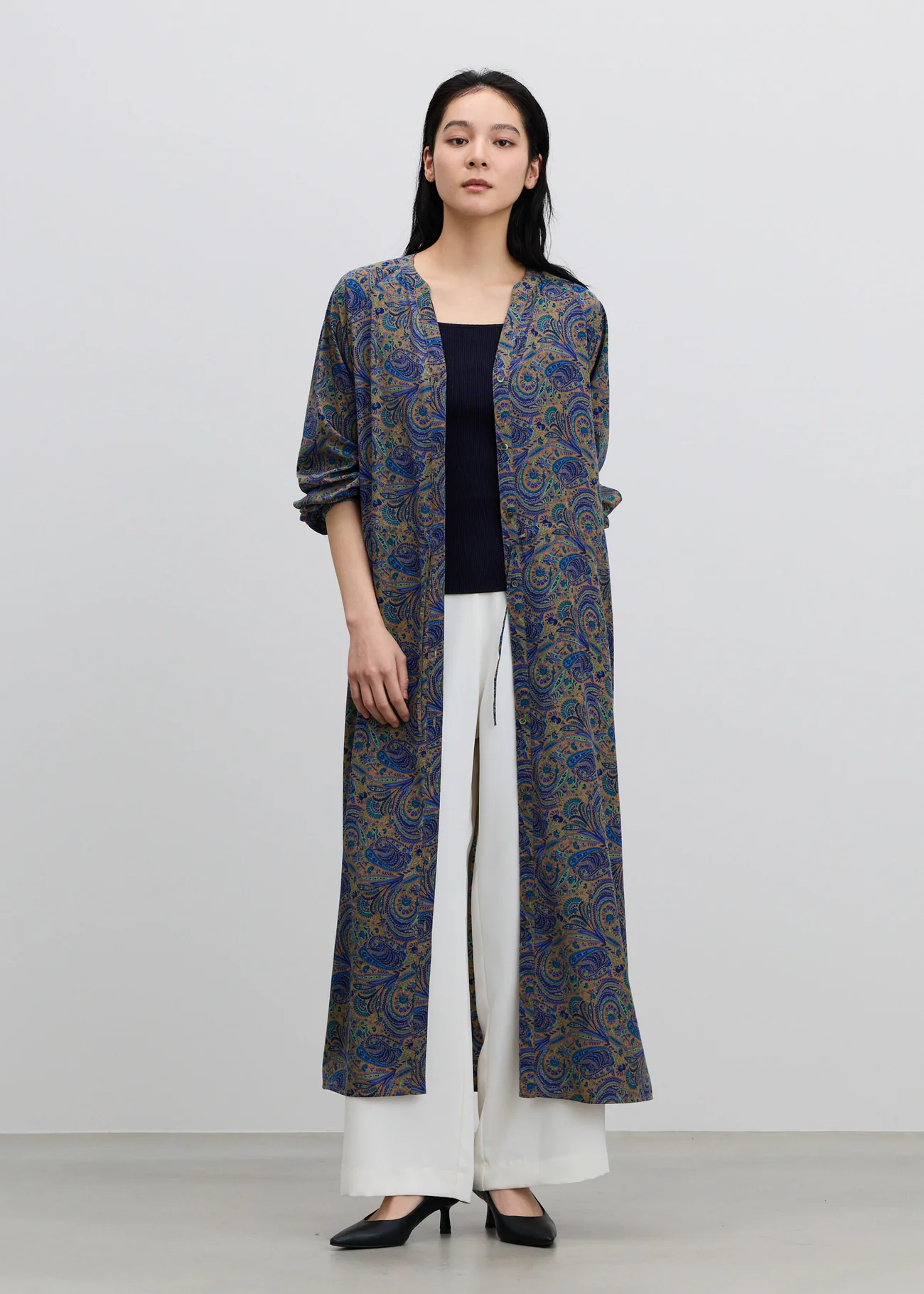 ペイズリー柄は、細やかで華奢な曲線が柔らかでフェミニンな印象を作ります。ペイズリー柄のベースにワードローブにお持ちのことが多いベーシックカラーを使うことで着回しのしやすさを重視しつつ、スタイリングのアクセントにもなるような配色をセレクトしました。