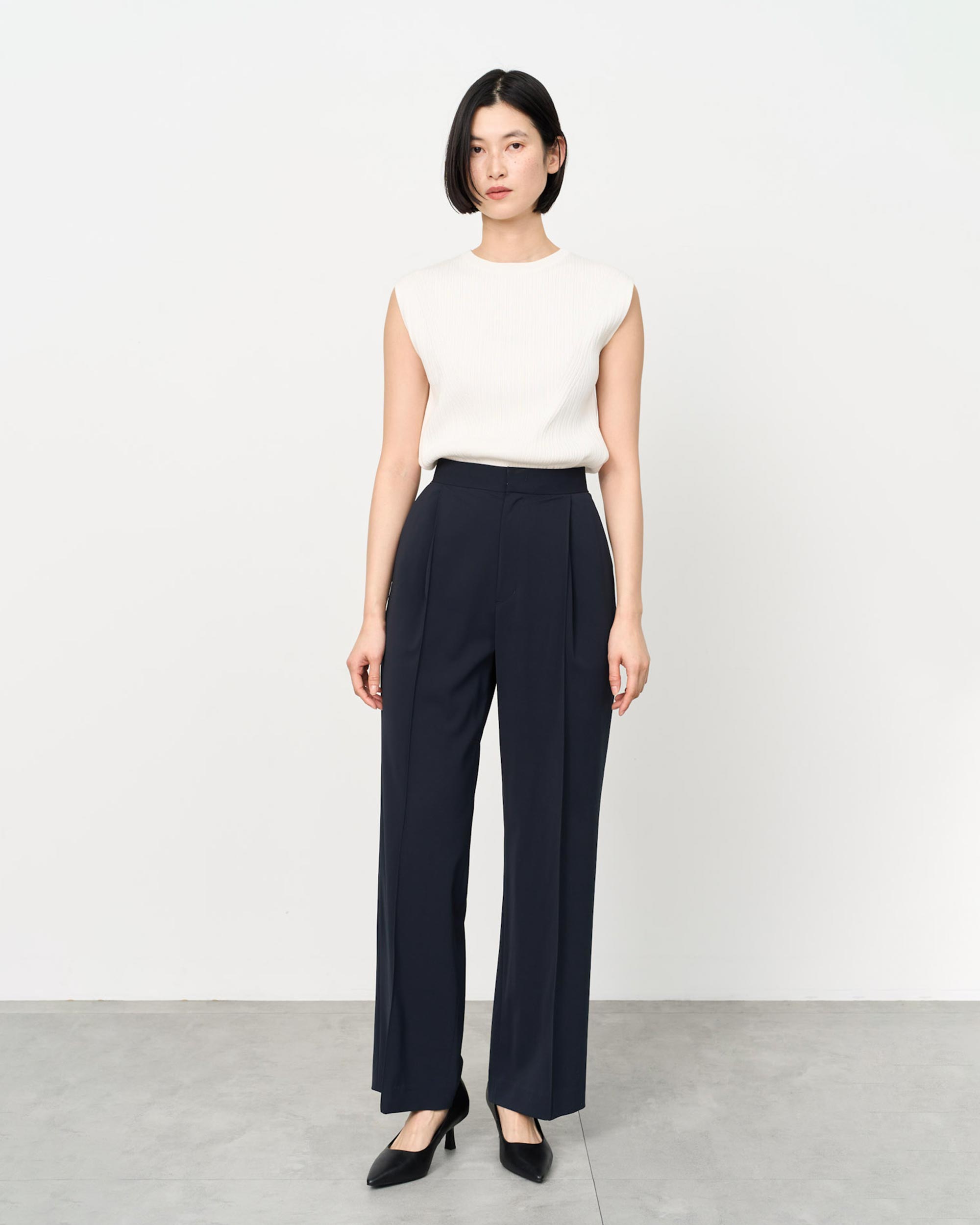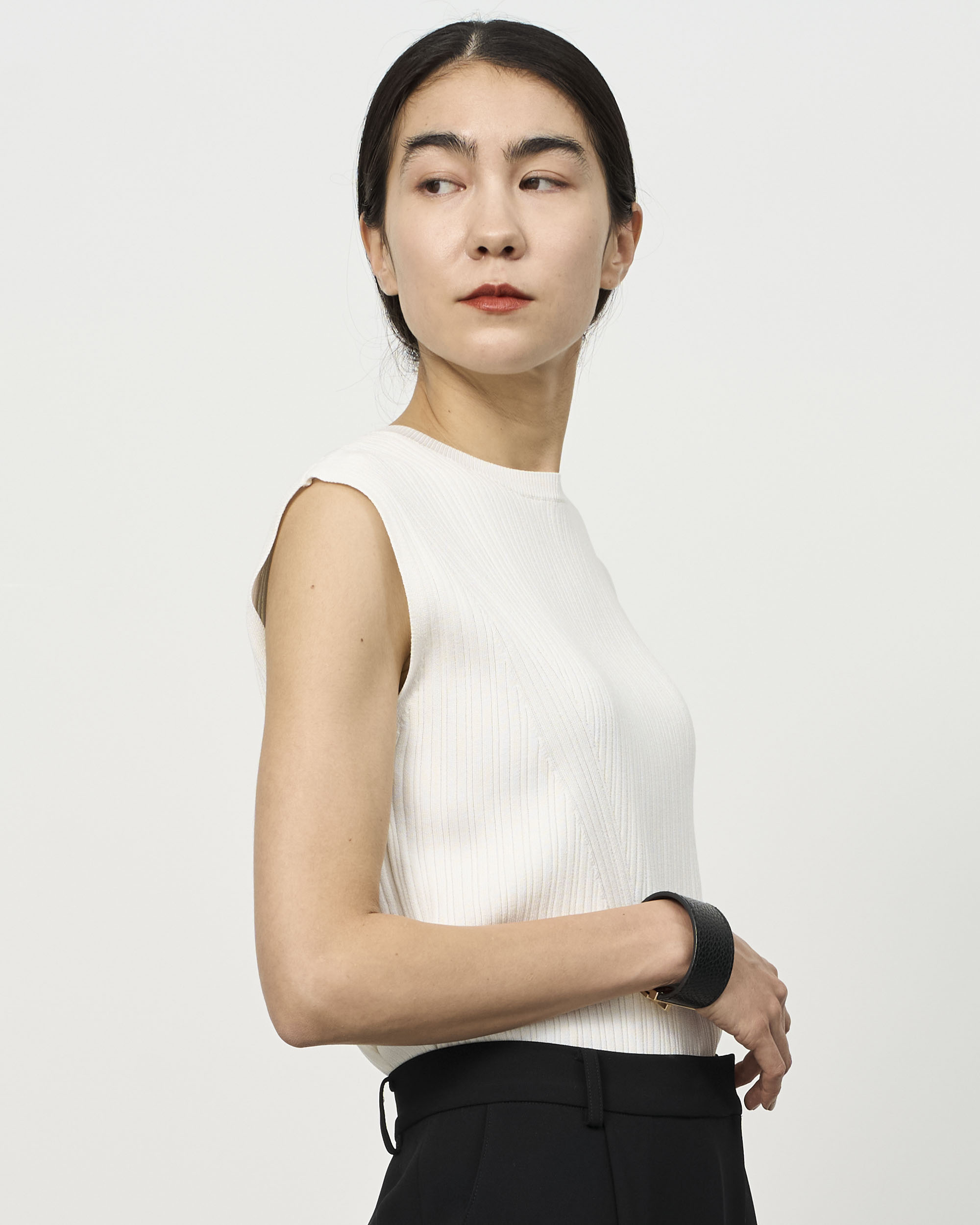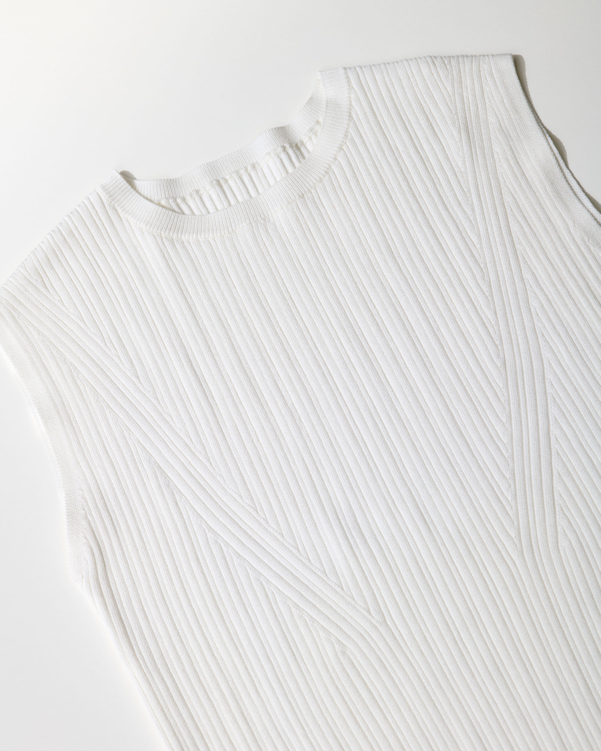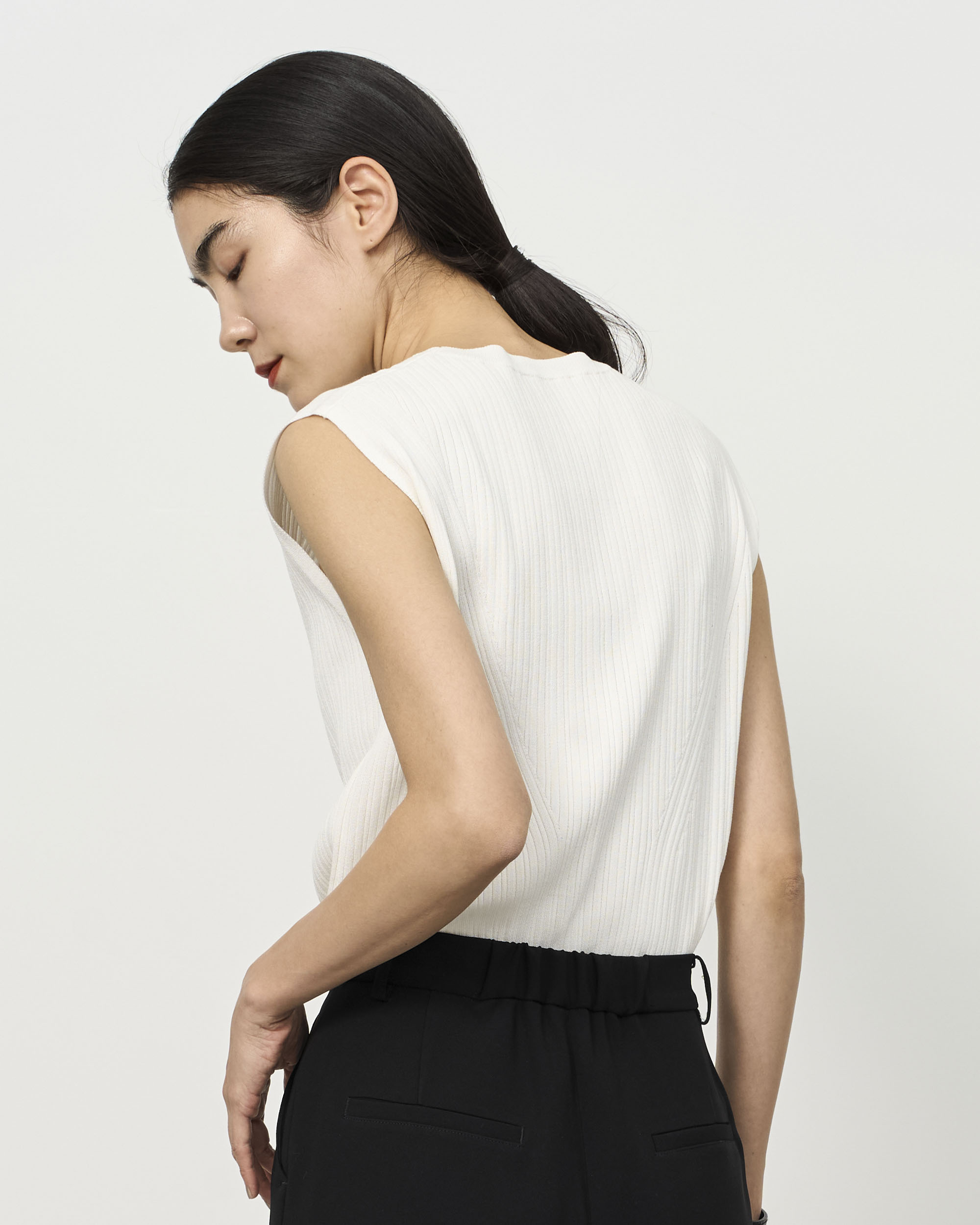 体のラインを拾わないランダムリブが表情豊かなノースリーブニット。さらっとしたタッチの肌触りで汗ばむ季節も心地良く過ごせます。