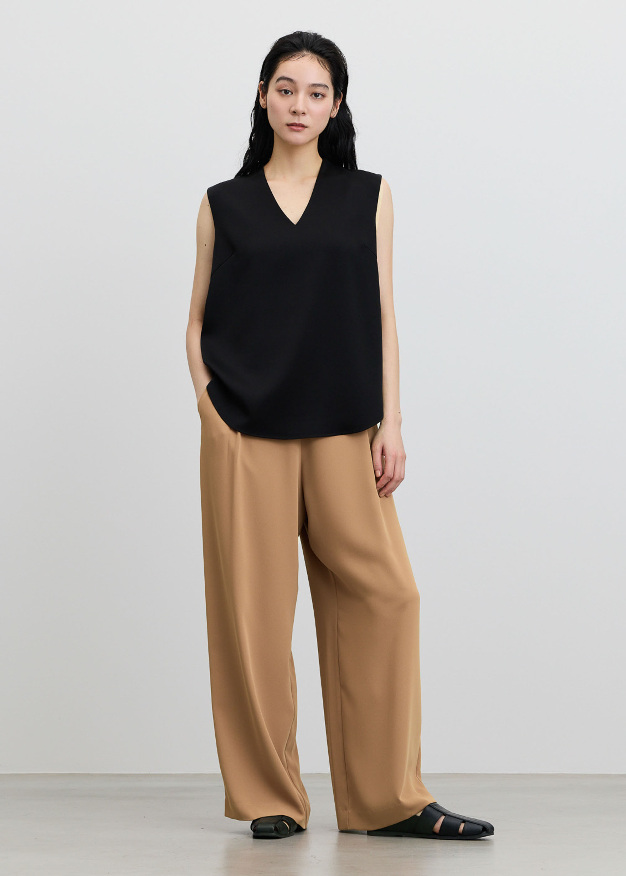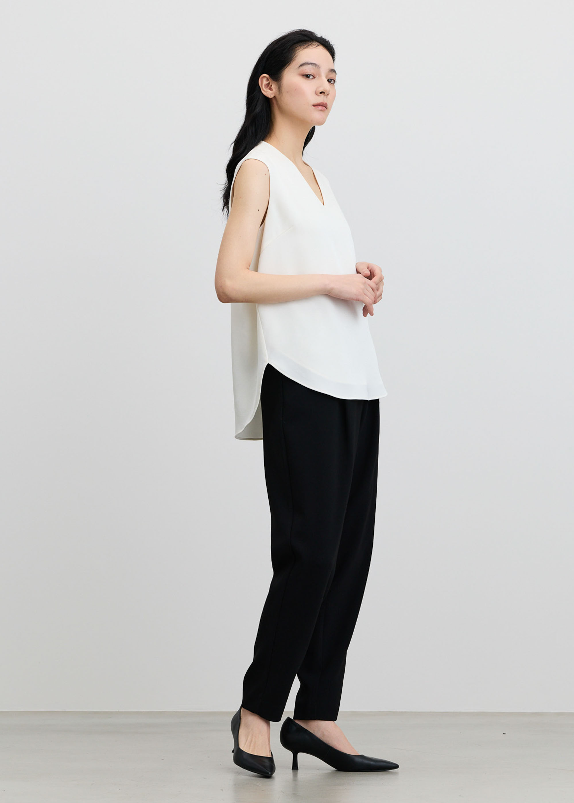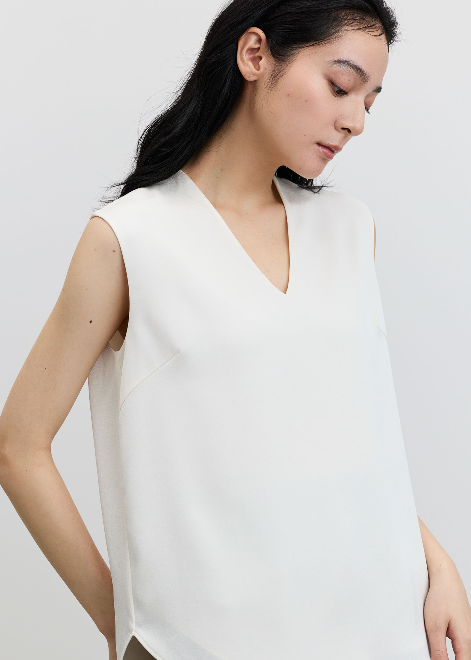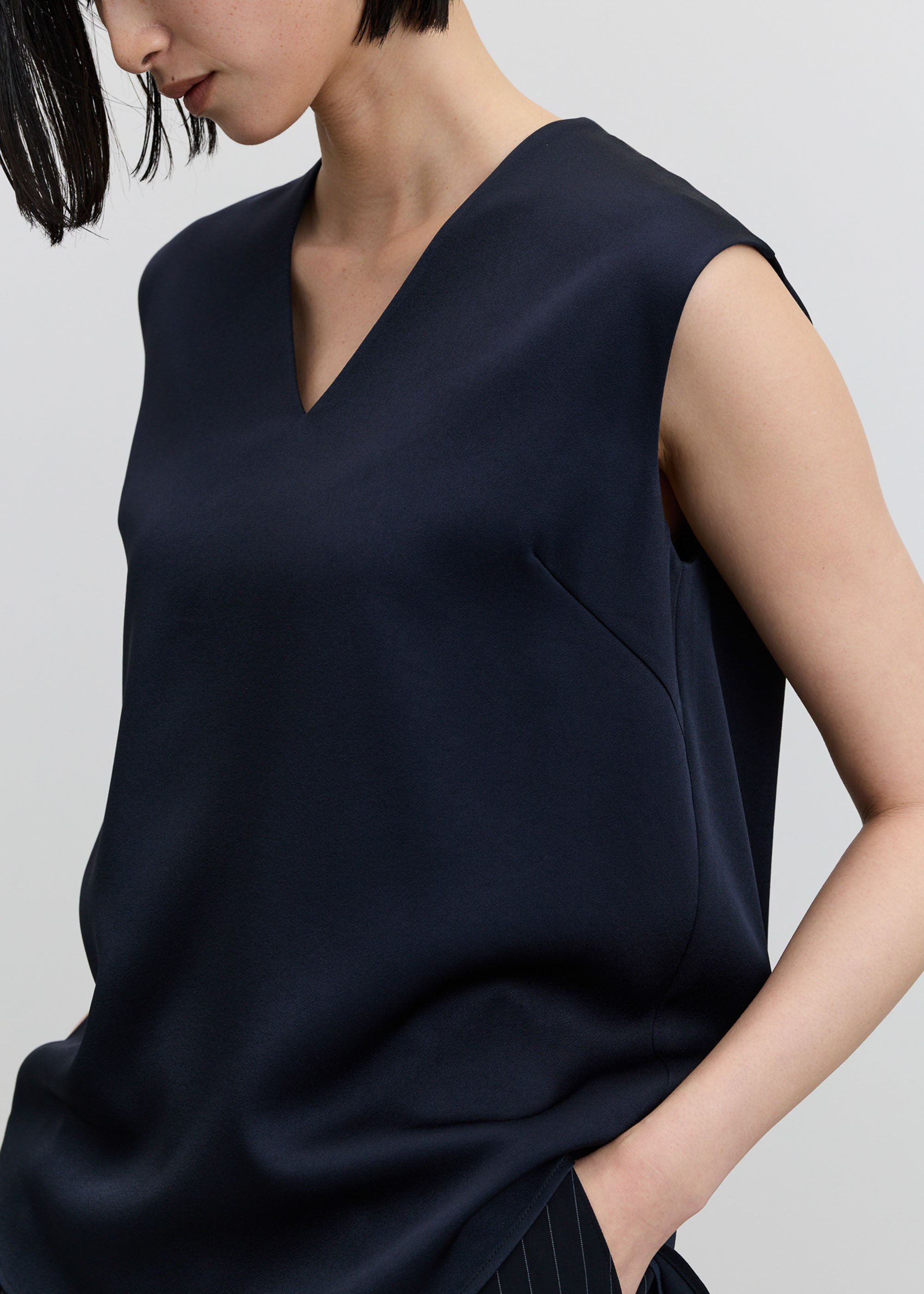 サテンの美しい光沢とシャープなVネックが、装いに上品さを添えるノースリーブブラウス。一枚ではもちろん、ジャケットのインナーとしても優秀で、春夏のワードローブに華やかさを与えます。