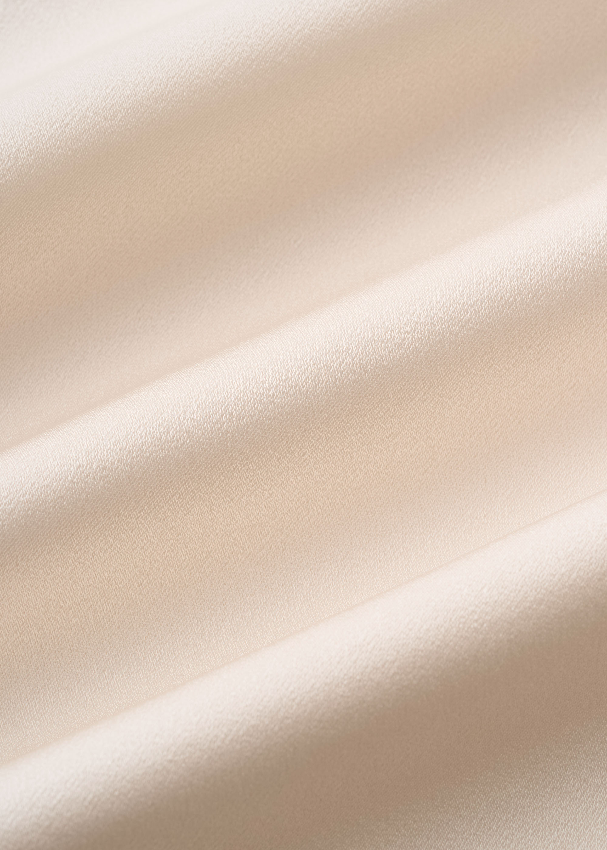素材には上質なトリアセサテンを採用。繊細な輝きを放つ生地は、顔まわりや肌を明るく引き立てる効果もあります。適度なハリとしなやかな落ち感を備え、しなやかに身体に寄り添います。ご自宅での洗濯機洗いが可能で、肌離れのよい裏地付き。汗ばむ日もストレスフリーに心地よくお過ごしいただけます。